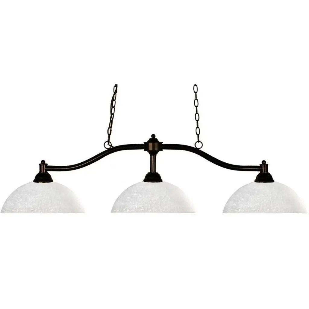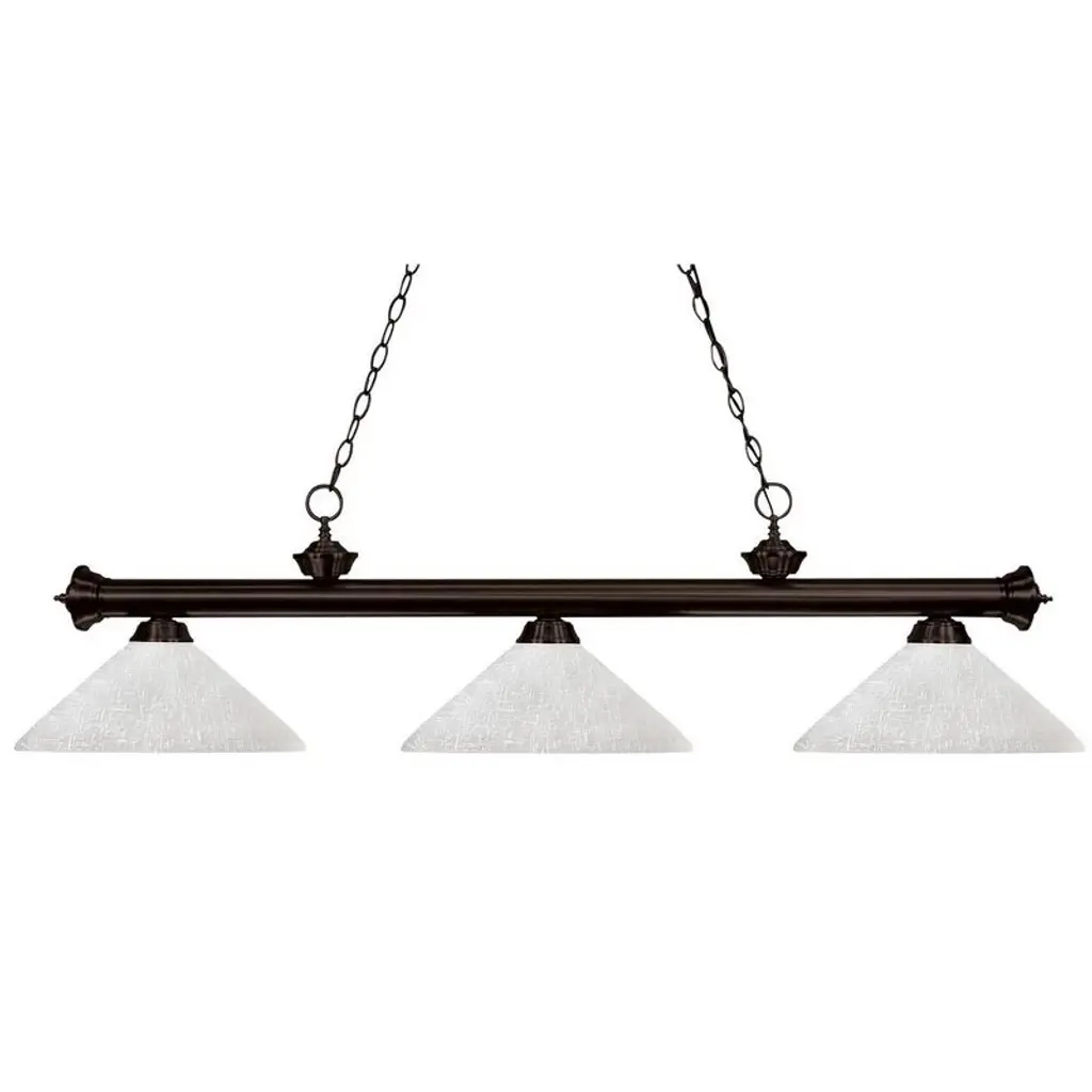 Simple yet versatile detailing defines this beautiful three light fixture. Finished in bronze and paired with angle mottle opal glass shades, this three light fixture would be equally at home in the game room, or anywhere else in the house needing a touch of timeless charm.72 inches of chain per side is included to ensure the perfect hanging height.