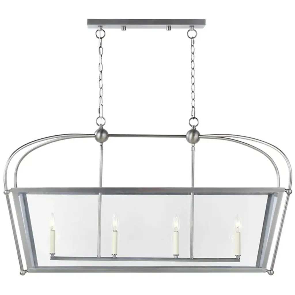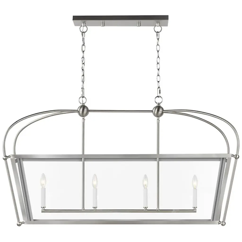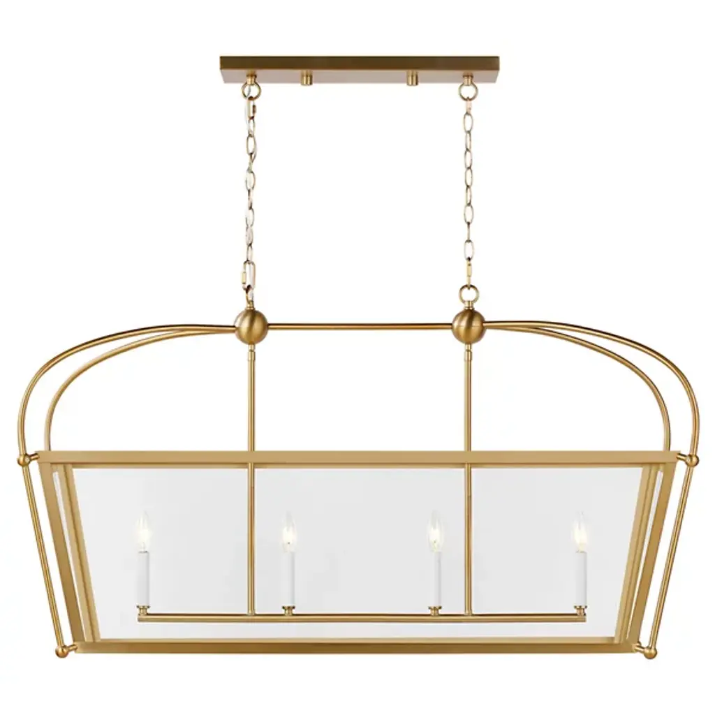 A clean and sleek way to bring a classic touch to the décor of your home. The Charleston Linear Suspension from Visual Comfort Studio, formerly known as Sea Gull Lighting, uses smooth metal throughout to create a pristine silhouette. A pair of chain links lower from the ceiling and lead to smooth orbs that extend several thin, gracefully curving arms toward an angled enclosure. A linear arrangement of candelabra-style bulbs rests within, shedding a bright and even glow throughout the space.