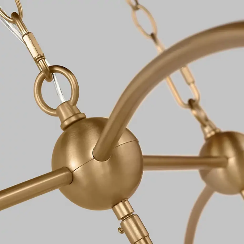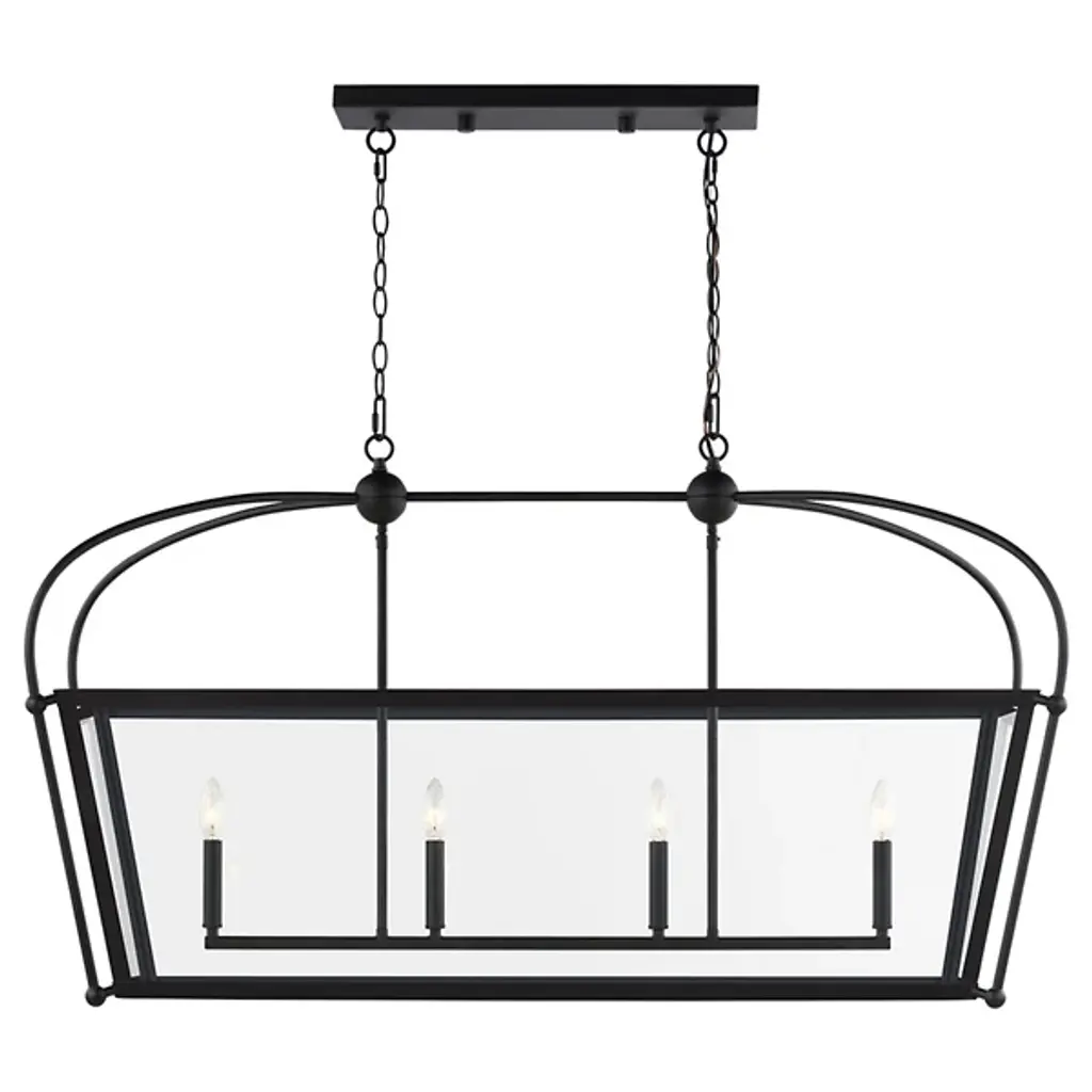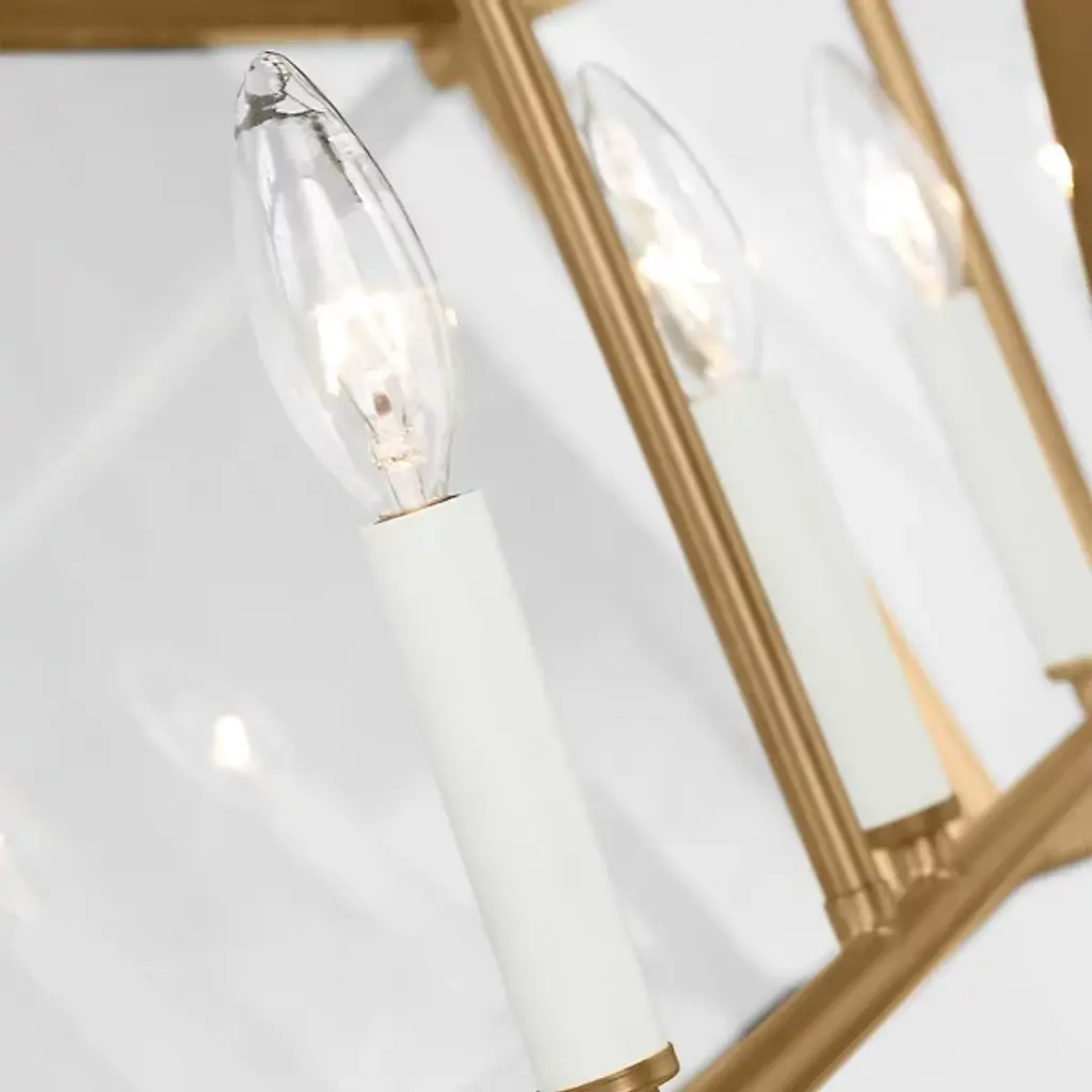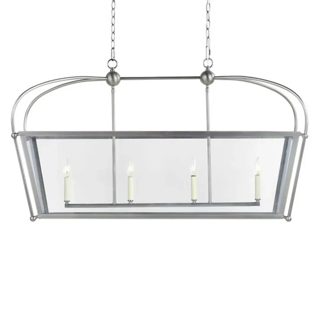 A clean and sleek way to bring a classic touch to the décor of your home. The Charleston Linear Suspension from Visual Comfort Studio, formerly known as Sea Gull Lighting, uses smooth metal throughout to create a pristine silhouette. A pair of chain links lower from the ceiling and lead to smooth orbs that extend several thin, gracefully curving arms toward an angled enclosure. A linear arrangement of candelabra-style bulbs rests within, shedding a bright and even glow throughout the space.