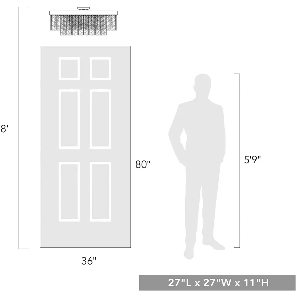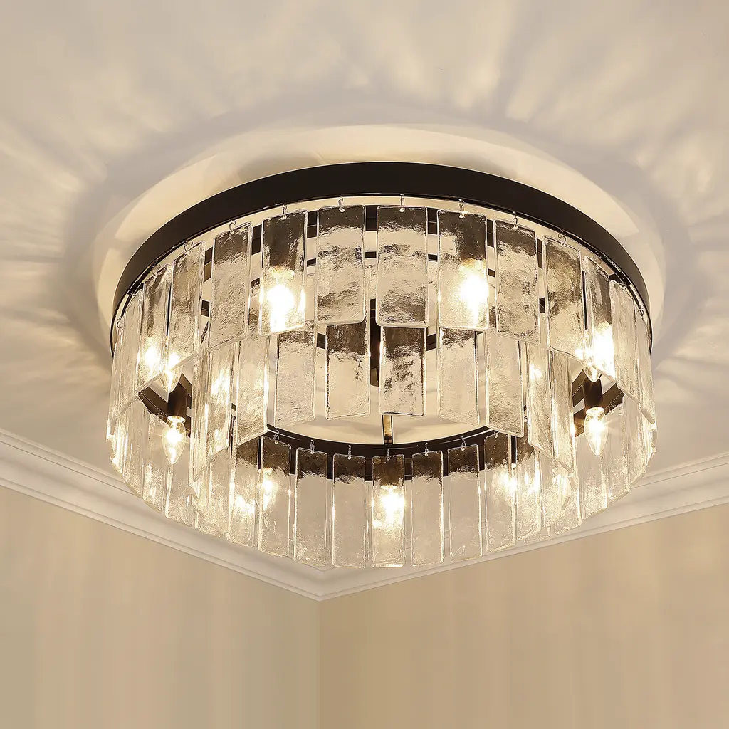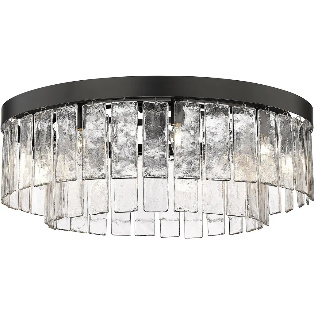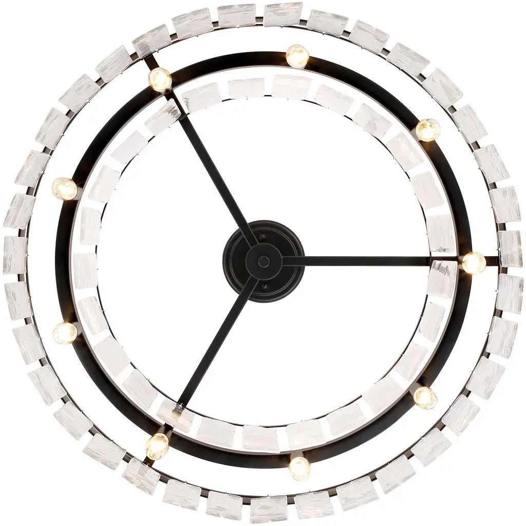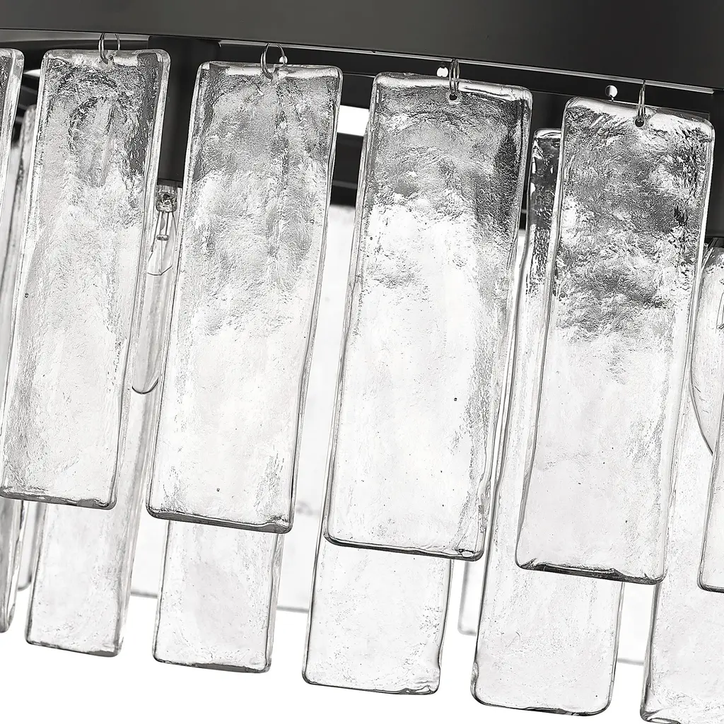 Bring Glam elegance into your home with the Golden Lighting Ciara 9-light Semi-Flush Mount. Featuring a glass shade and a Matte Black frame, it creates a welcoming atmosphere. The hammered water glass shade is crafted to provide a beautifully distorted and refractive light effect, elegantly catching and refracting light to create intricate patterns. This finish, characterized by its timeless and versatile nature, absorbs light and promotes a sophisticated aesthetic. Ideal for areas with mid-height ceilings, this fixture is damp location rated, making it suitable for covered spaces with occasional moisture. With convertible construction, it provides flexible installation options for various ceiling heights. Dimensions measure 27"W x 11"H x 27"D, and it requires 9 E12 Candelabra base bulbs (not included) with a maximum wattage of 60 per bulb. Enhance your interior with this statement piece that combines artistry and quality, promising to impress.