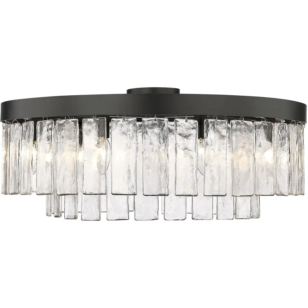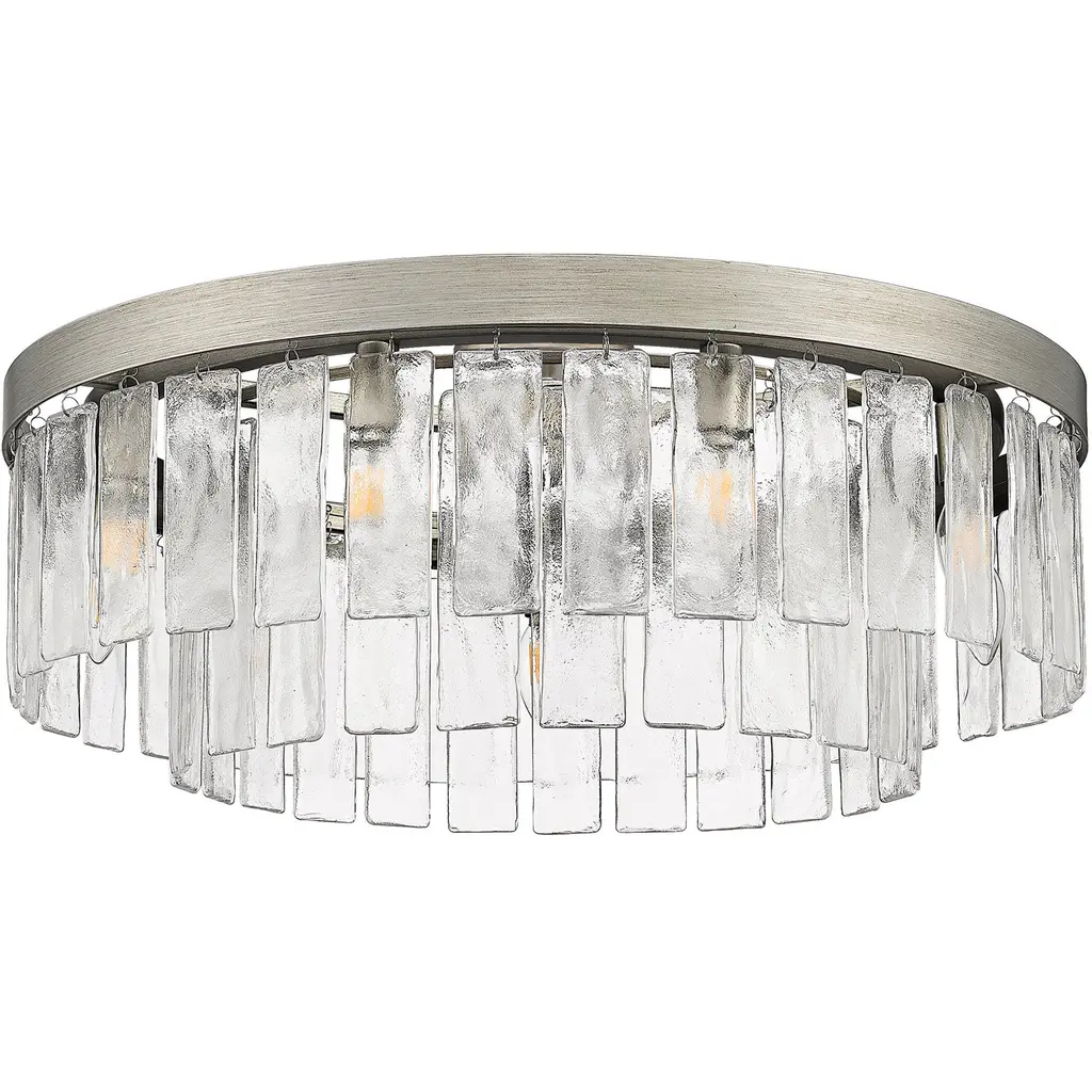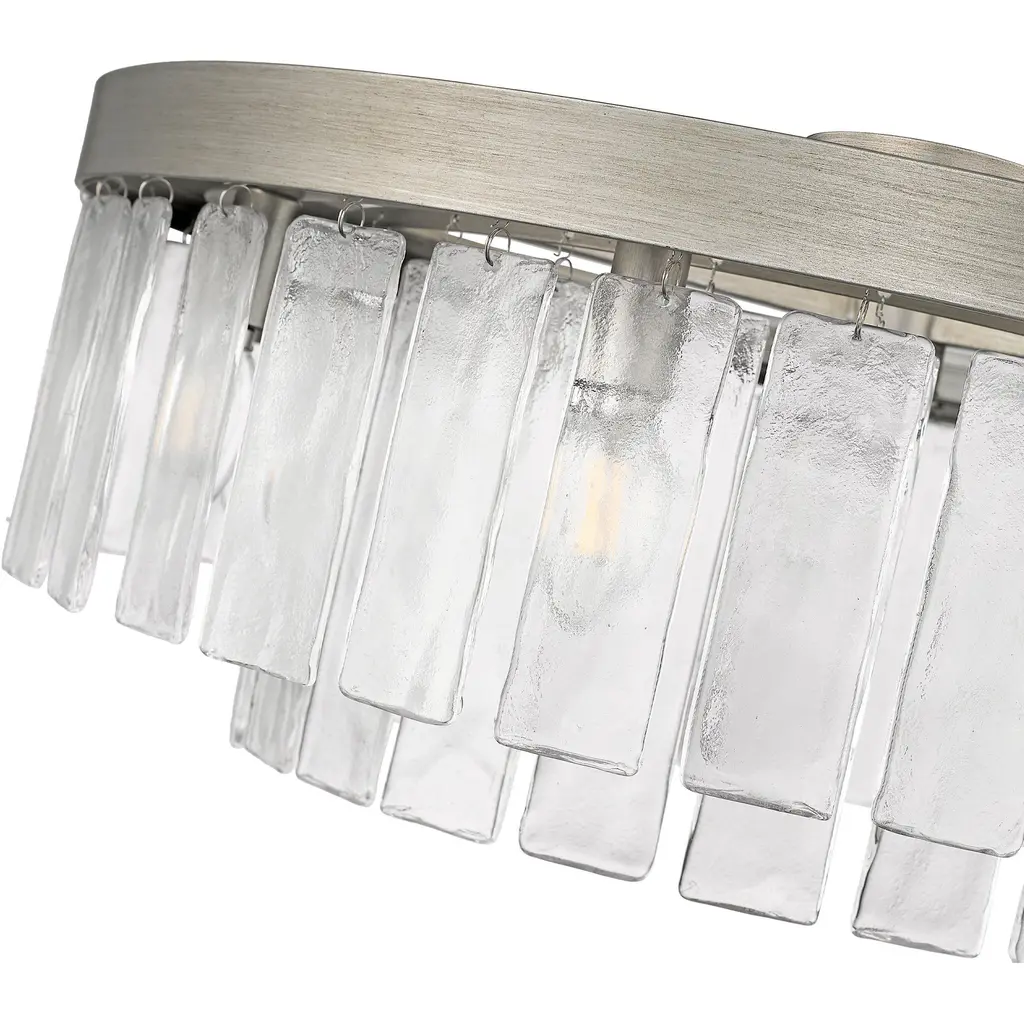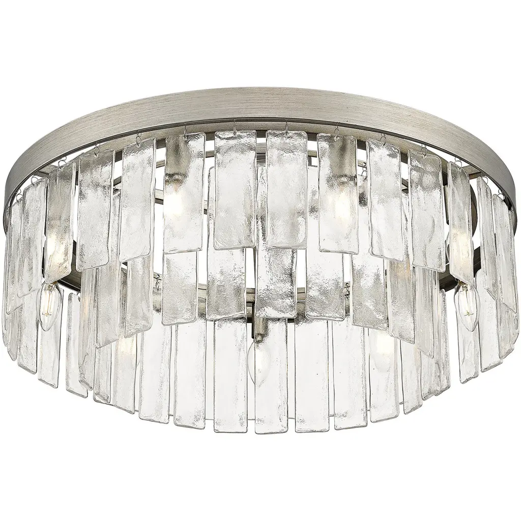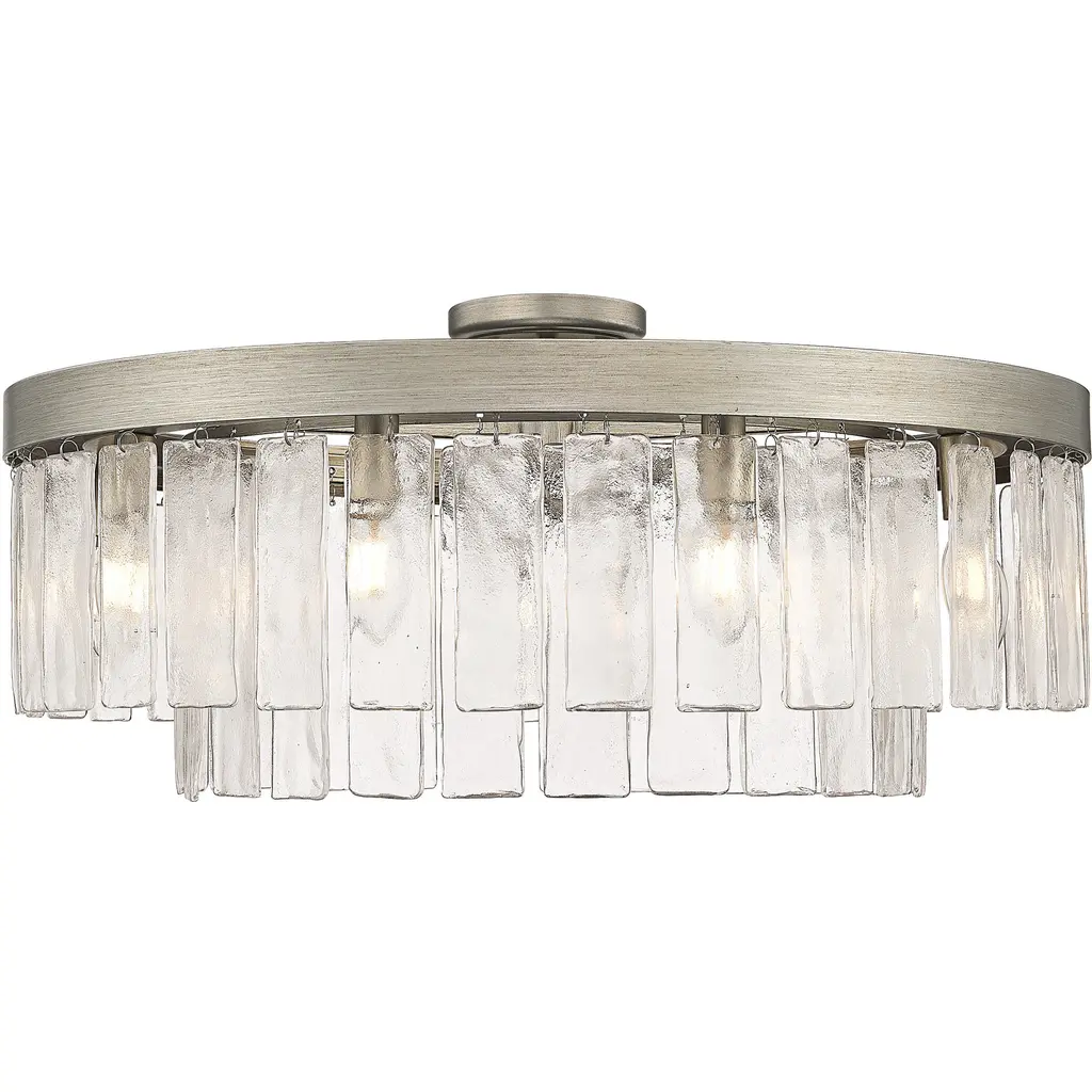 Bring Glam elegance into your home with the Golden Lighting Ciara 9-light Semi-Flush Mount. Featuring a glass shade and a Peruvian Silver frame, it creates a welcoming atmosphere. The hammered water glass shade, with its unique textured finish, captures and refracts light beautifully, adding depth and charm to your decor. The Peruvian Silver finish, hand-brushed to create rustic texture and subtle patina, enhances the fixture's artisanal quality, making it a perfect centerpiece. Ideal for spaces with mid-height ceilings, this fixture is damp location rated for safe use in areas with occasional moisture. Its convertible construction allows for versatile installation, adapting easily for various ceiling heights. Dimensions measure 27"W x 11"H x 27"D, and it requires 9 E12 Candelabra base bulbs (not included) with a maximum wattage of 60 per bulb. Elevate your home's ambiance with this exquisite fixture that seamlessly combines functionality and beauty.