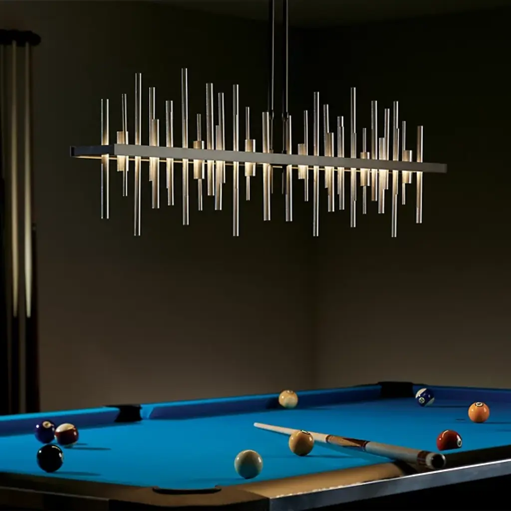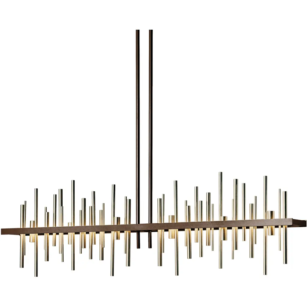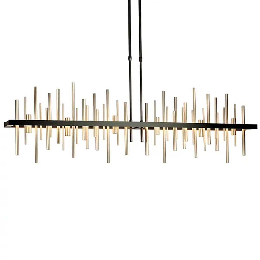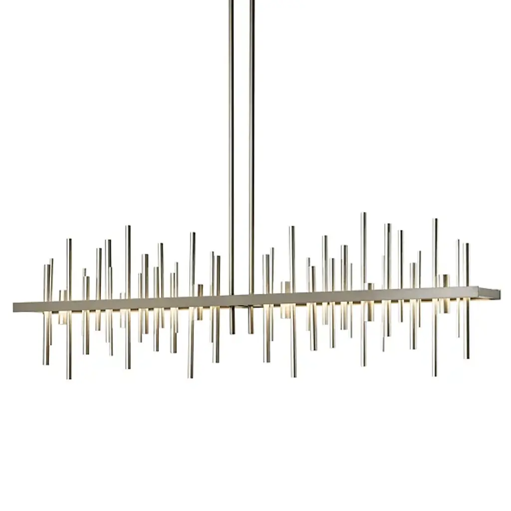 Loft-worthy style appealing to contemporary tastes. The Cityscape Large LED Linear Suspension by Hubbardton Forge is an excellent accent piece handcrafted by talented artisans of Vermont. The horizontal suspension frame includes an array of cylindrical rods of varying heights that trace multiple skyscraper silhouettes in the cityscape. Powered by a built-in LED module, the fixture creates a stunning view composed of reflections of skyscrapers, as seen from the waterfront. Striking a fine balance between form and function, its simple design offers abundant illumination and a distinct style that is sure to be noticed.