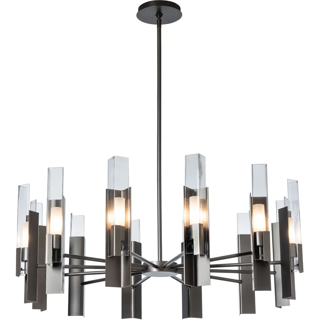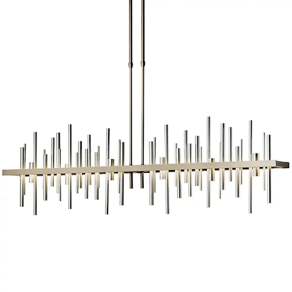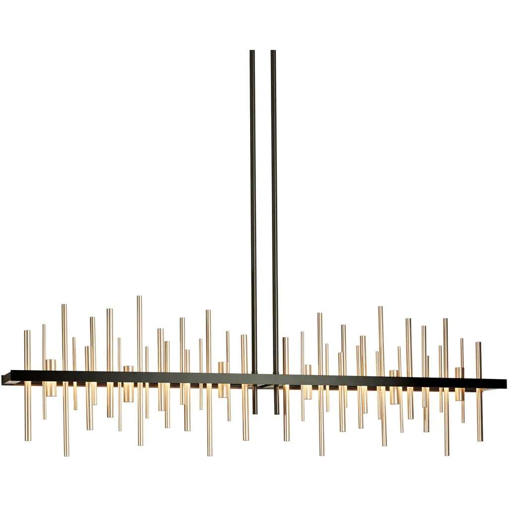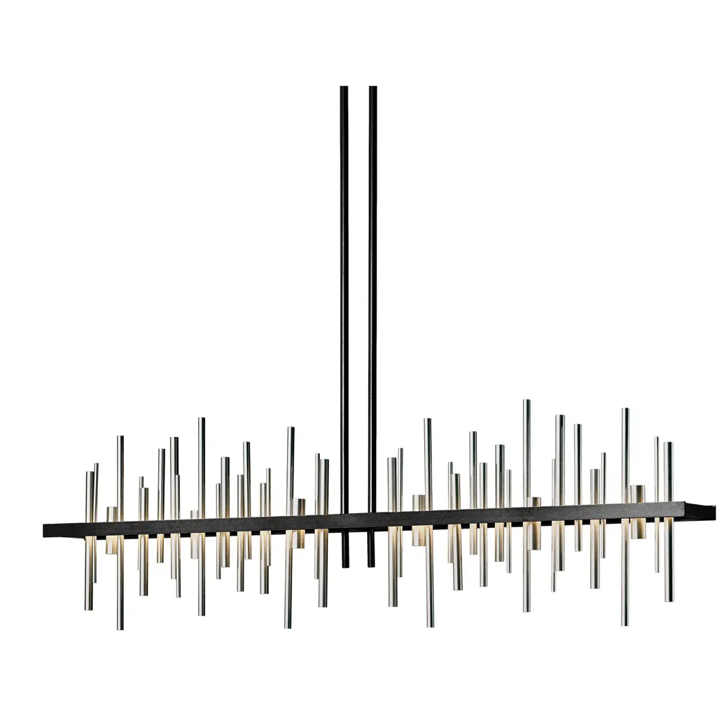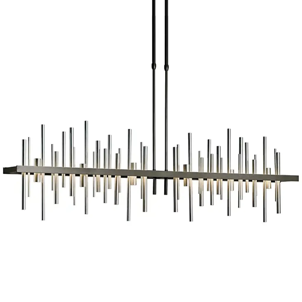 Loft-worthy style appealing to contemporary tastes. The Cityscape Large LED Linear Suspension by Hubbardton Forge is an excellent accent piece handcrafted by talented artisans of Vermont. The horizontal suspension frame includes an array of cylindrical rods of varying heights that trace multiple skyscraper silhouettes in the cityscape. Powered by a built-in LED module, the fixture creates a stunning view composed of reflections of skyscrapers, as seen from the waterfront. Striking a fine balance between form and function, its simple design offers abundant illumination and a distinct style that is sure to be noticed.