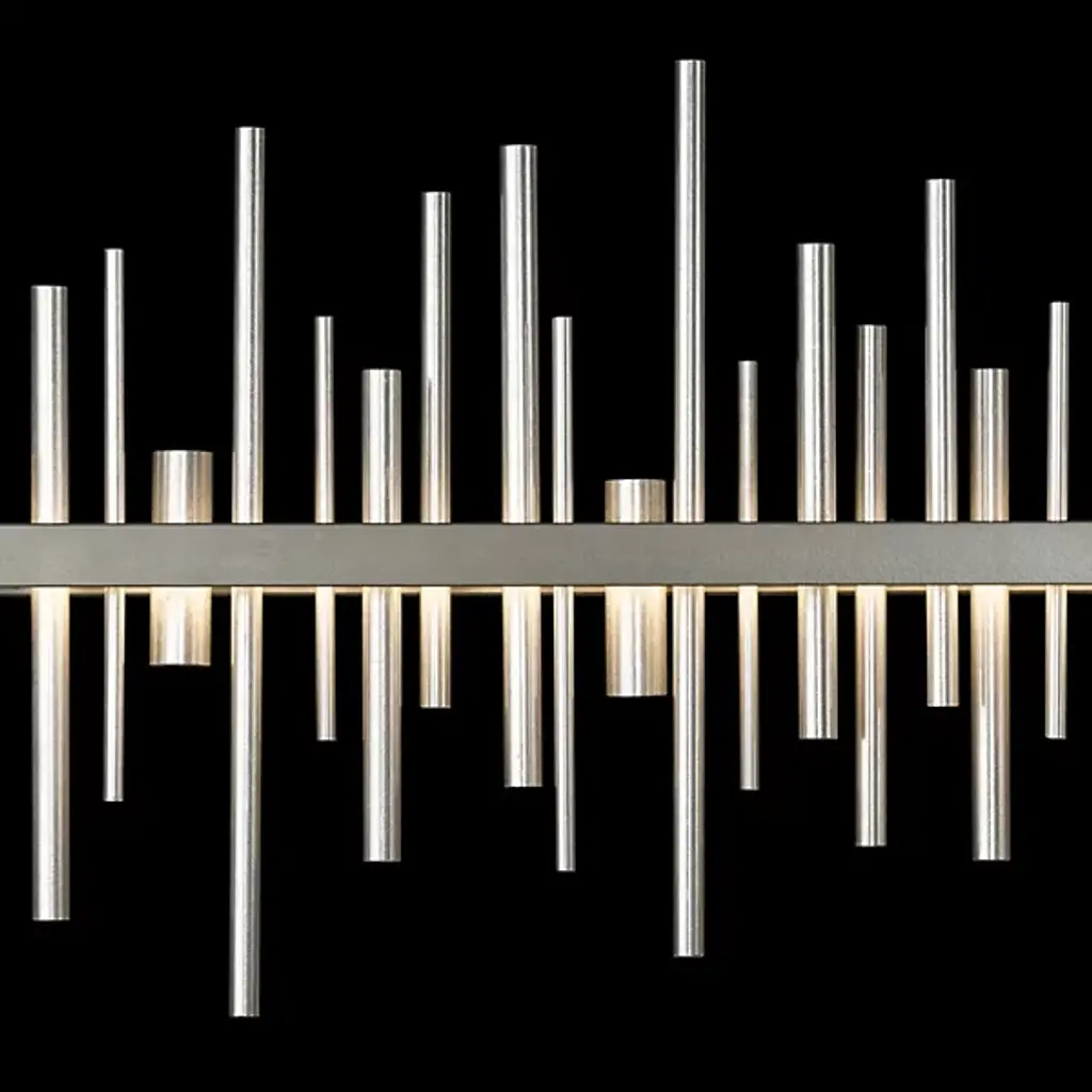 Loft-worthy style appealing to contemporary tastes. The Cityscape Large LED Linear Suspension by Hubbardton Forge is an excellent accent piece handcrafted by talented artisans of Vermont. The horizontal suspension frame includes an array of cylindrical rods of varying heights that trace multiple skyscraper silhouettes in the cityscape. Powered by a built-in LED module, the fixture creates a stunning view composed of reflections of skyscrapers, as seen from the waterfront. Striking a fine balance between form and function, its simple design offers abundant illumination and a distinct style that is sure to be noticed.