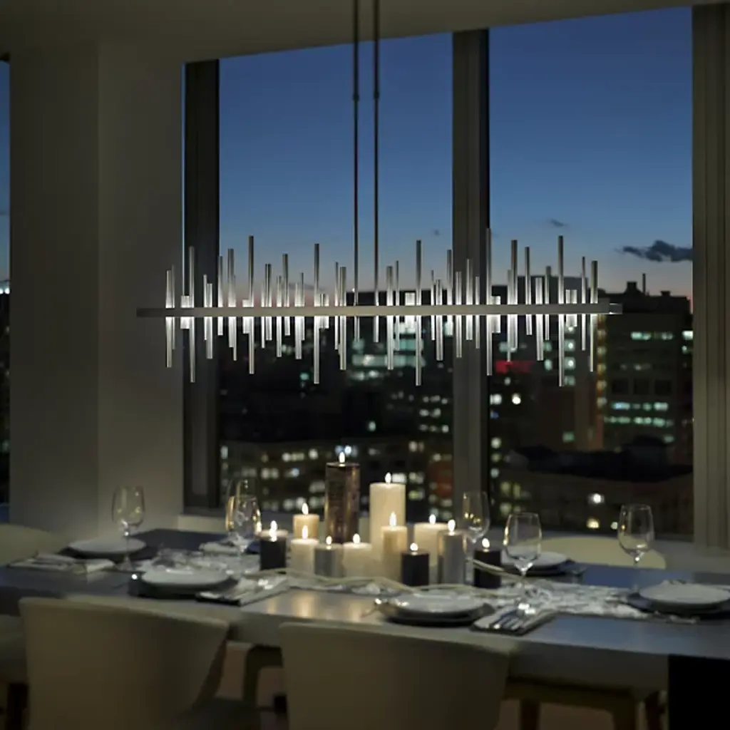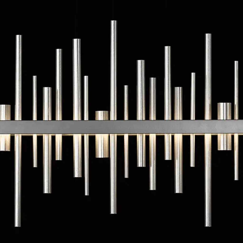 Loft-worthy style appealing to contemporary tastes. The Cityscape Large LED Linear Suspension by Hubbardton Forge is an excellent accent piece handcrafted by talented artisans of Vermont. The horizontal suspension frame includes an array of cylindrical rods of varying heights that trace multiple skyscraper silhouettes in the cityscape. Powered by a built-in LED module, the fixture creates a stunning view composed of reflections of skyscrapers, as seen from the waterfront. Striking a fine balance between form and function, its simple design offers abundant illumination and a distinct style that is sure to be noticed.