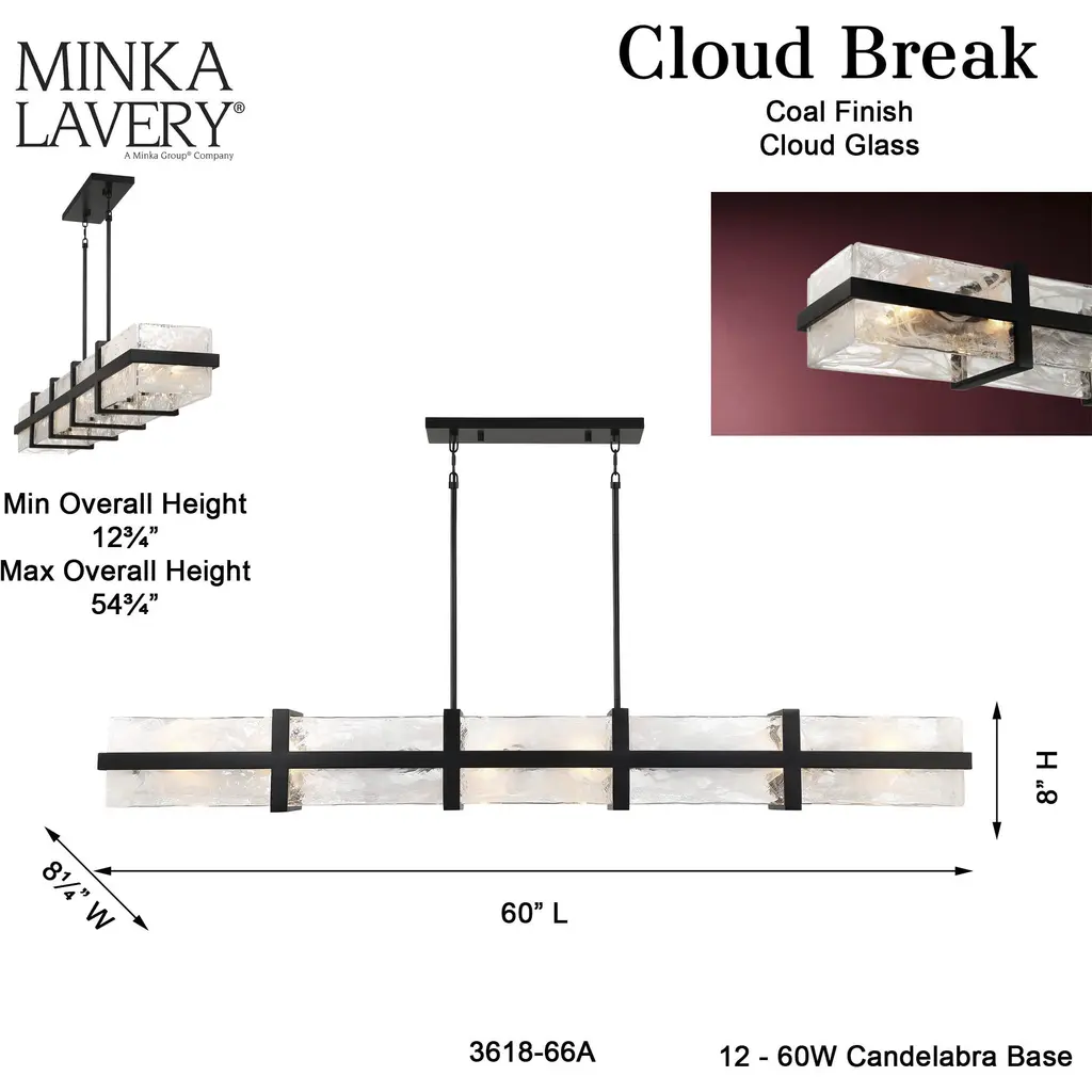 This 12 light Island Light from the Cloud Break collection by Minka-Lavery will enhance your home with a perfect mix of form and function. The features include a Coal finish applied by experts. This item qualifies for free shipping!