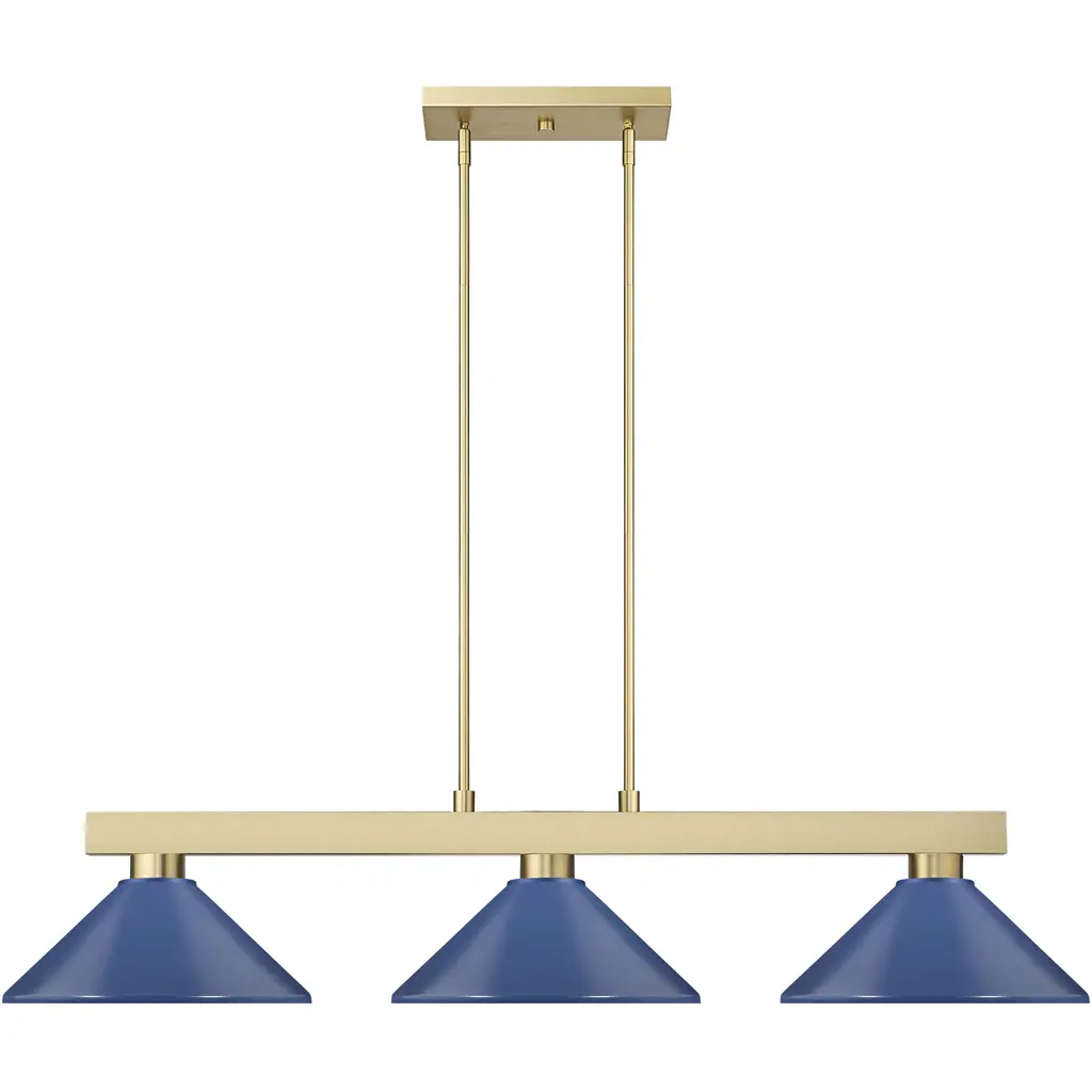 Conical metal shades bring classic ambiance to a modern three-light billiards light. Its clean-lined frame is perfect over a pool table or gaming space, featuring a modern gold finish that pairs perfectly with the navy blue of its shades. From the Cobalt collection, it offers bright illumination for all types of entertainment pursuits.