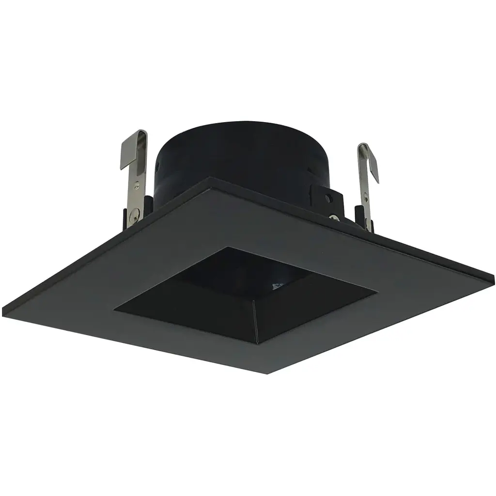 The Cobalt 4” Square Regressed LED Retrofit Trim from Nora Lighting presents an elegant solution to indoor lighting needs. A rounded metal housing with a finned collar holds LED lamping, relying on slender metal brackets to suspend the fixture in a ceiling mounting. A square trim with a beveled bay steps down slightly from the fixture’s mounting surface, transmitting a wide wash of light below.