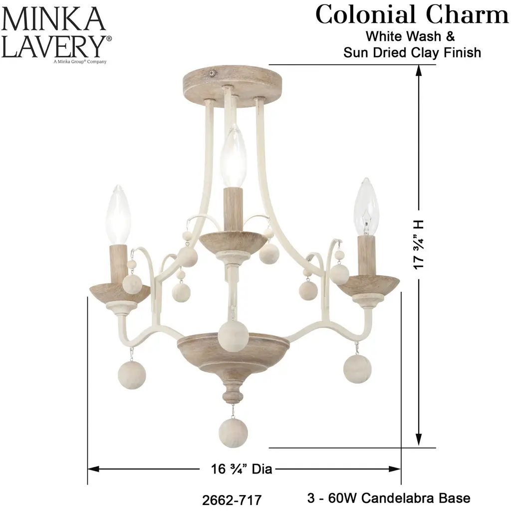 This 3 light Semi Flush from the Colonial Charm collection by Minka-Lavery will enhance your home with a perfect mix of form and function. The features include a White Wash and Sun Dried Clay finish applied by experts. This item qualifies for free shipping!