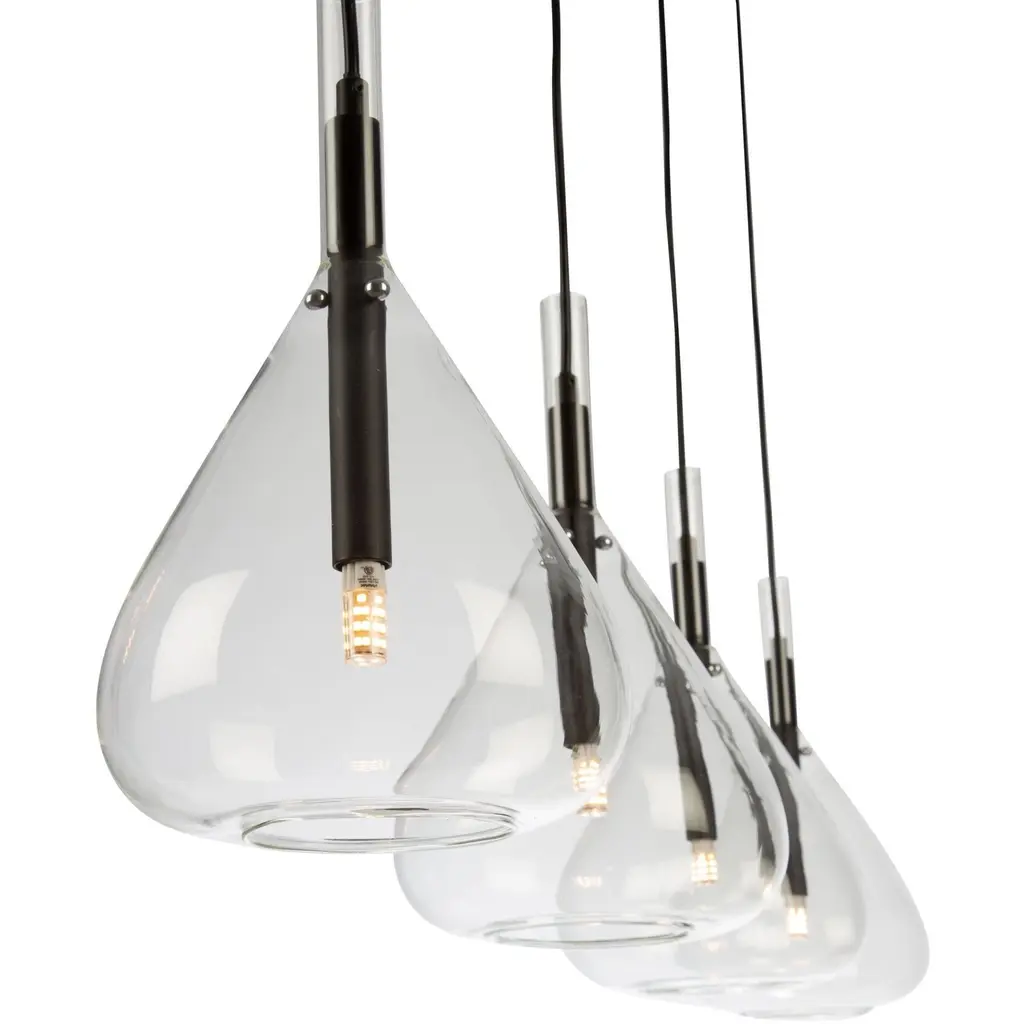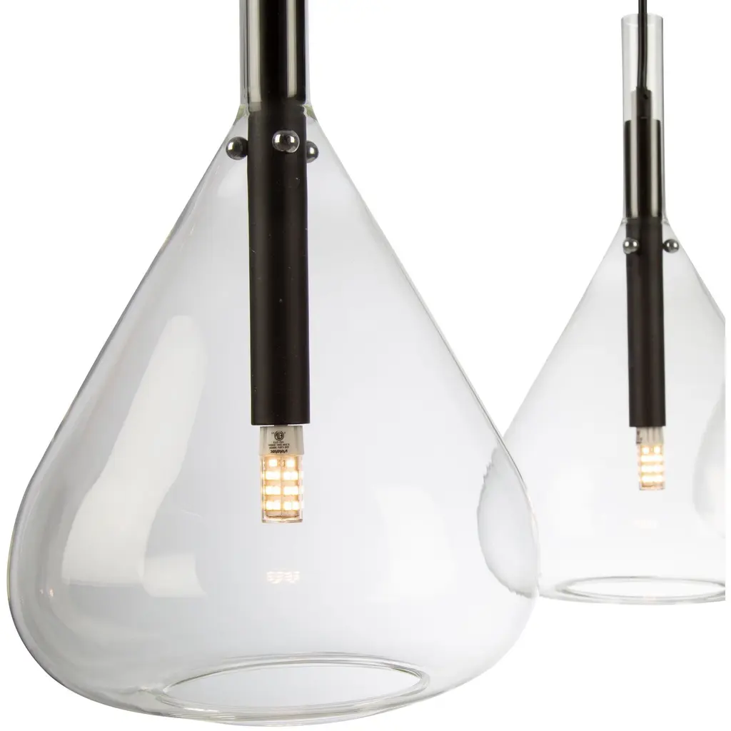 The Conic collection features a uniquely shaped glass design suspended on black frames. The glass is suspended by 3 nickel bullets to give it a floating effect. The bottom of the glass is open for each access to the bulbs. To finish off the design, the wiring has black textile covering.