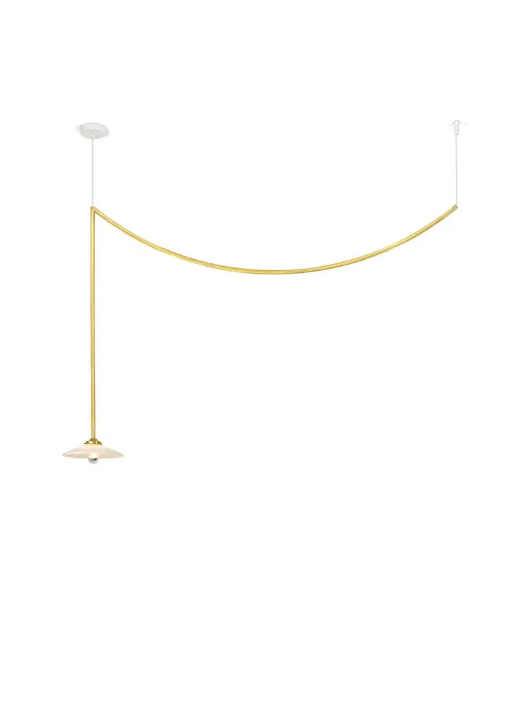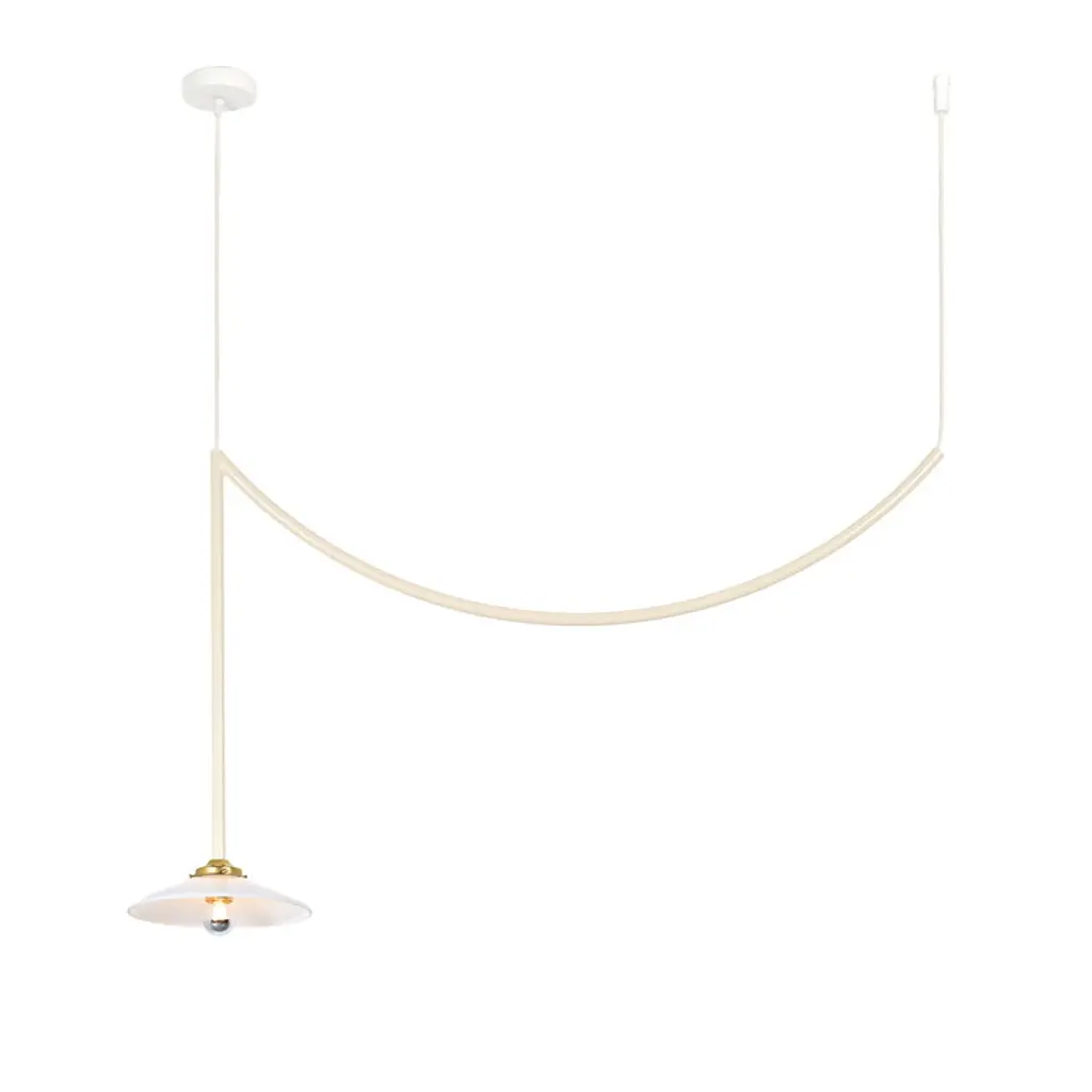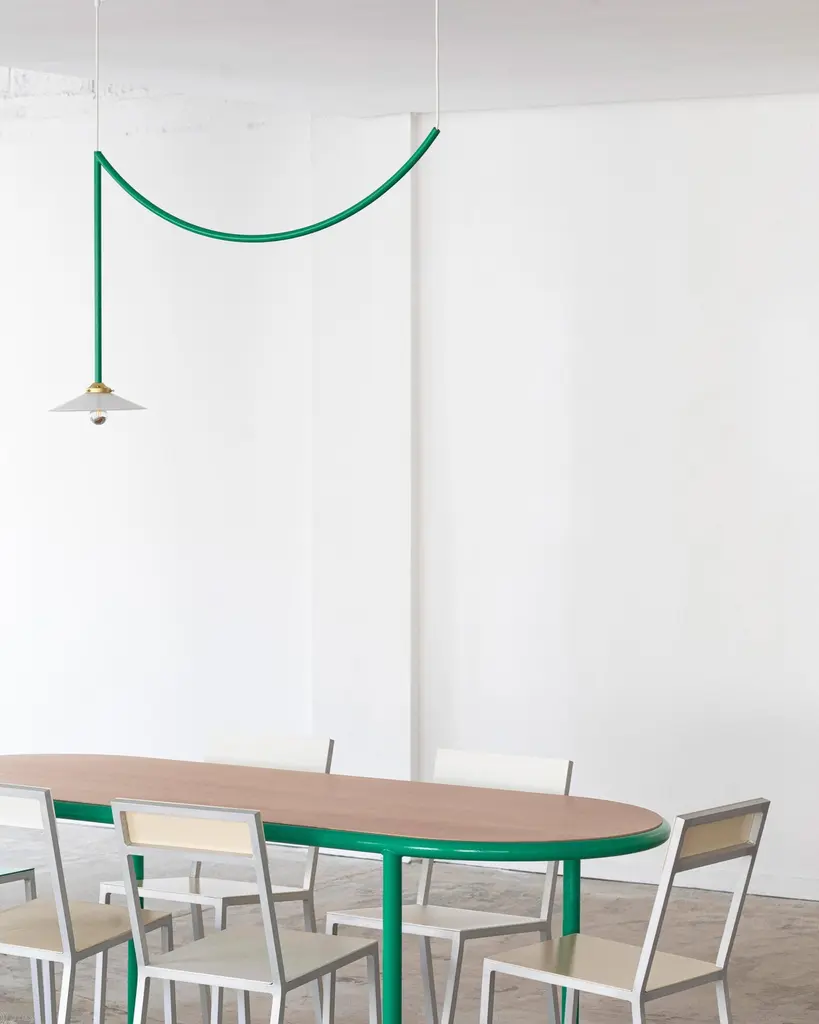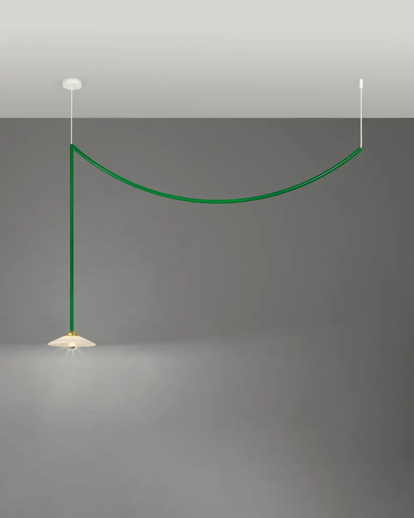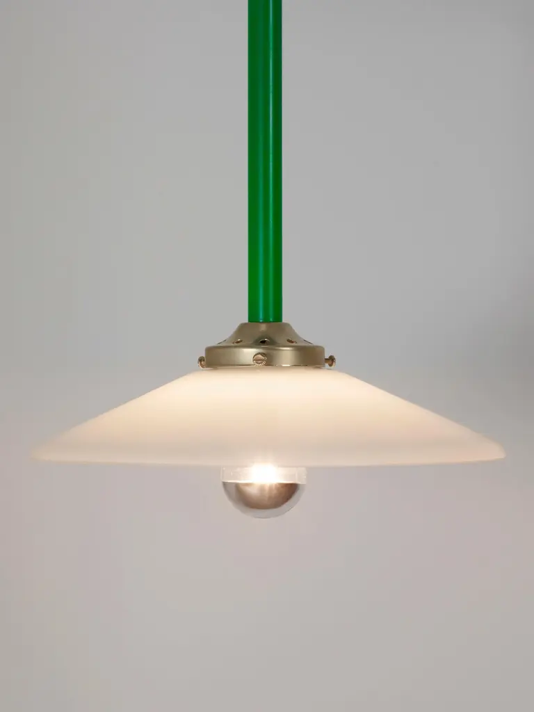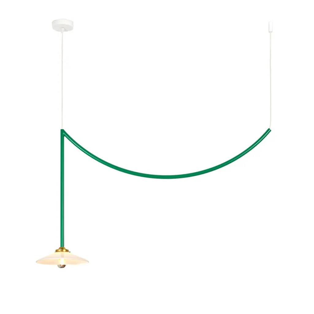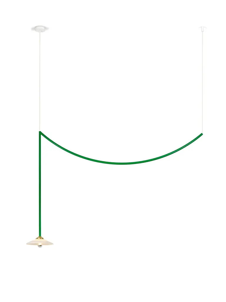 Cailing Lamp N°3 by Muller Van Severen x Valerie ObjectsDimensions: H. 105 X 150 X 25Finish: Greenspecificationsfitting type: e27bulb replaceable: yesnumber of fittings: 1dimmable: nocable length: 3 meterswitch: nomaterial: — lamp frame in steel tube 18mm — powder coated finish— wall brackets and lamp socket have a brass colour— lamp shade in white glass — LED light bulb / half mirrorAlthough most design lovers know of Muller Van Severen for their furniture, the design couple’s story actually kicked off with the conception of these hanging lamps. “It all started out of necessity”, Hannes explains. “We were working in our new home which is an old house. Above the table there wasn’t a socket in the ceiling to stick a lightbulb in, so we designed a lamp that could hang from the wall”. Like all Muller Van Severen’s furniture, the lamps add a sober but colorful line to the interior. On one hand the sober design doesn’t draw too much attention, on the other hand its playful character does tingle the eye.The lamps create space rather than filling it up.