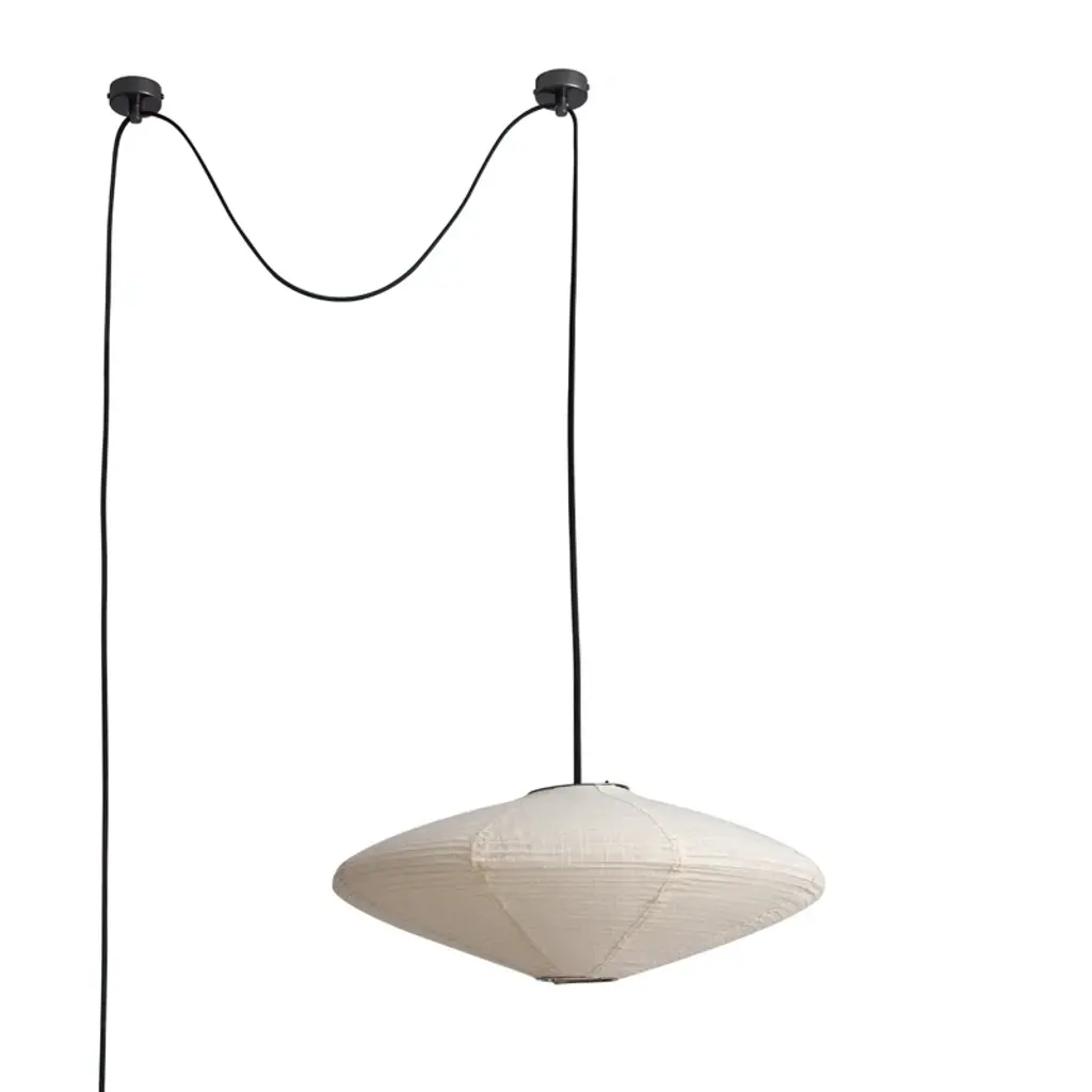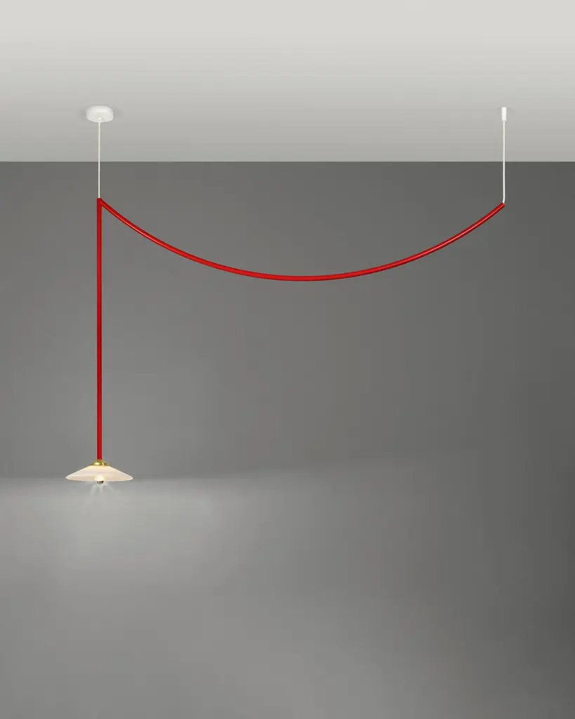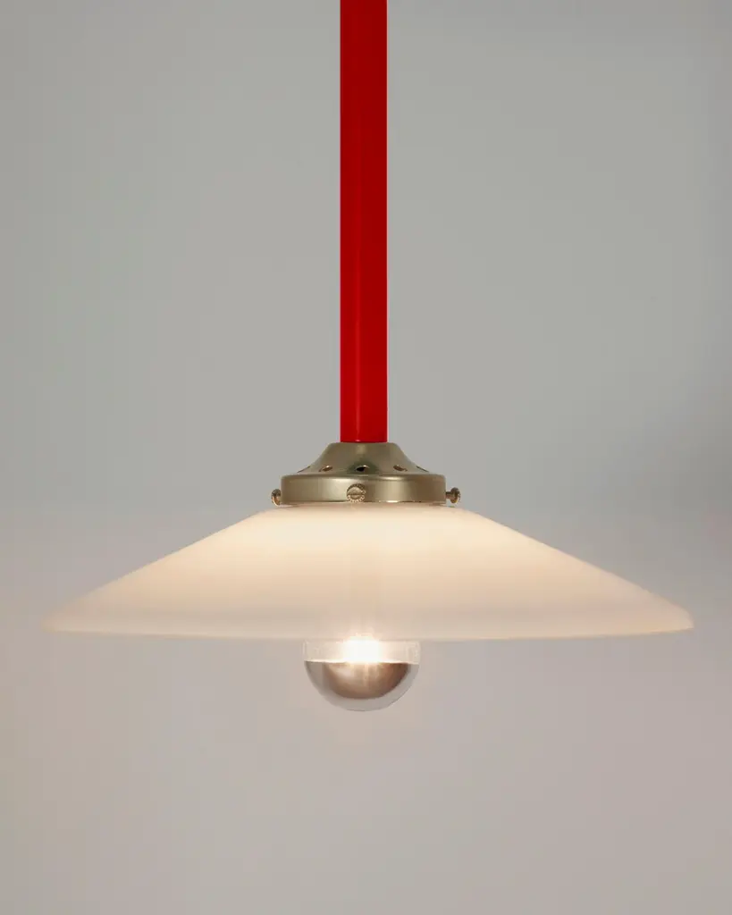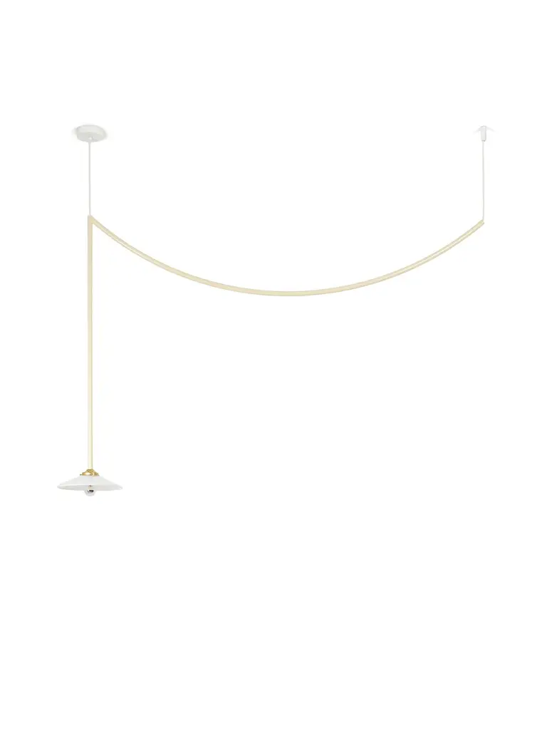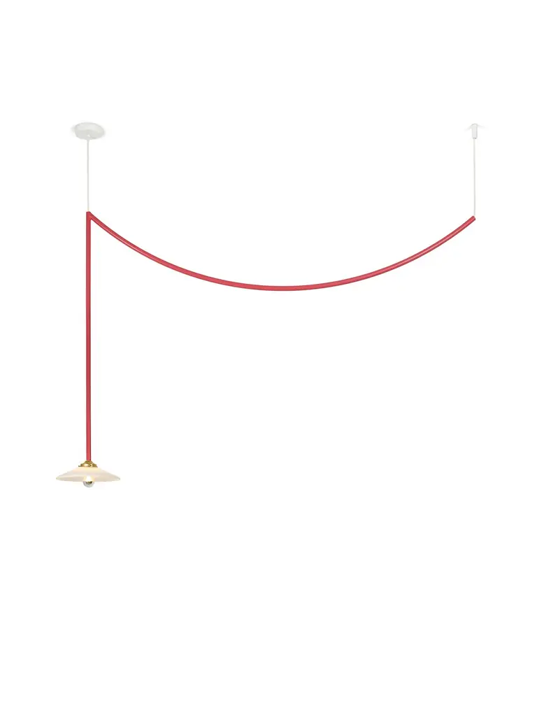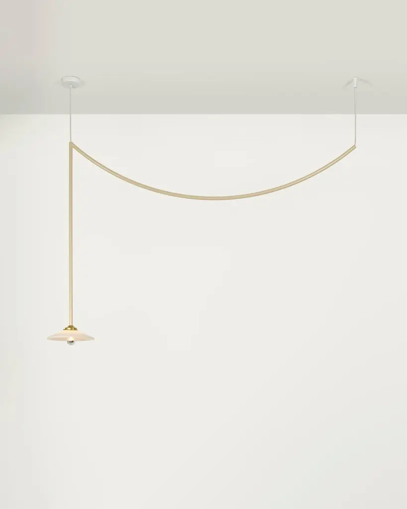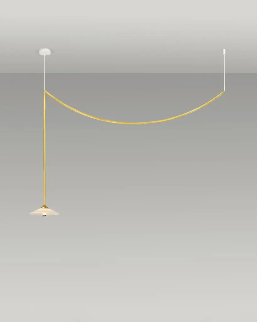 Cailing Lamp N°3 by Muller Van Severen x Valerie ObjectsDimensions: H. 105 X 150 X 25Finish: Greenspecificationsfitting type: e27bulb replaceable: yesnumber of fittings: 1dimmable: nocable length: 3 meterswitch: nomaterial: — lamp frame in steel tube 18mm — powder coated finish— wall brackets and lamp socket have a brass colour— lamp shade in white glass — LED light bulb / half mirrorAlthough most design lovers know of Muller Van Severen for their furniture, the design couple’s story actually kicked off with the conception of these hanging lamps. “It all started out of necessity”, Hannes explains. “We were working in our new home which is an old house. Above the table there wasn’t a socket in the ceiling to stick a lightbulb in, so we designed a lamp that could hang from the wall”. Like all Muller Van Severen’s furniture, the lamps add a sober but colorful line to the interior. On one hand the sober design doesn’t draw too much attention, on the other hand its playful character does tingle the eye.The lamps create space rather than filling it up.