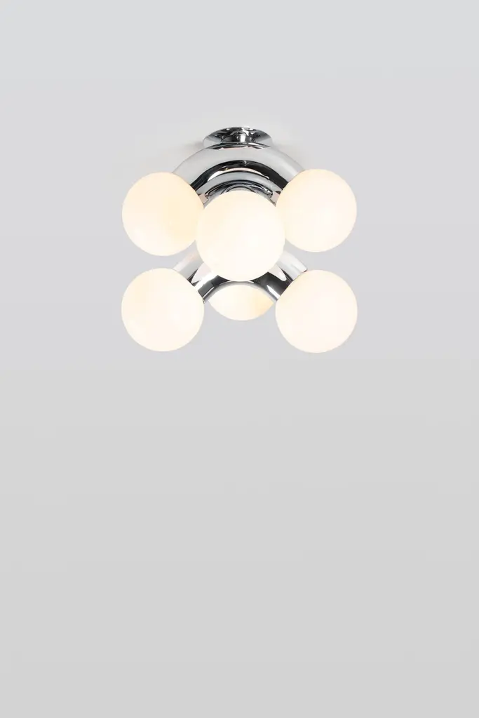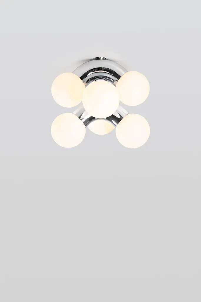 VINE 3-C, ceiling lampDesign: Caine Heintzman, Editor: ANDLightThe vine ceiling lamp combines exaggerated form with the propensity for repetition resulting in an ambitious vertically scaling fixture.Materials– Chromed steel– Opal glass globeDimensions42 x 42 x 38cm / 16.5” x 16.5” x 15”Electrical– 100–240V– Dimming: ELV– 3000K– 6 x 4W G9 LED LampPower trim options– Trimless (Mud-in or surface mount)– Cover plate (Junction box, 4.5” x 4.5”)Finishes– Chrome– Midnight chrome (blue)- Cadmium yellow.