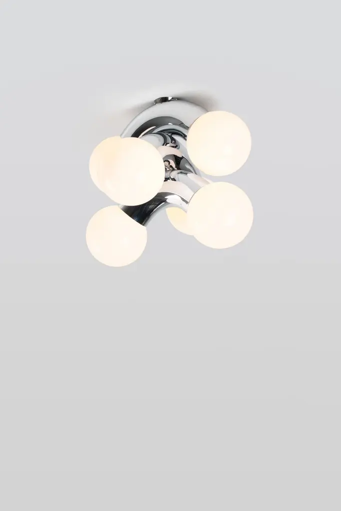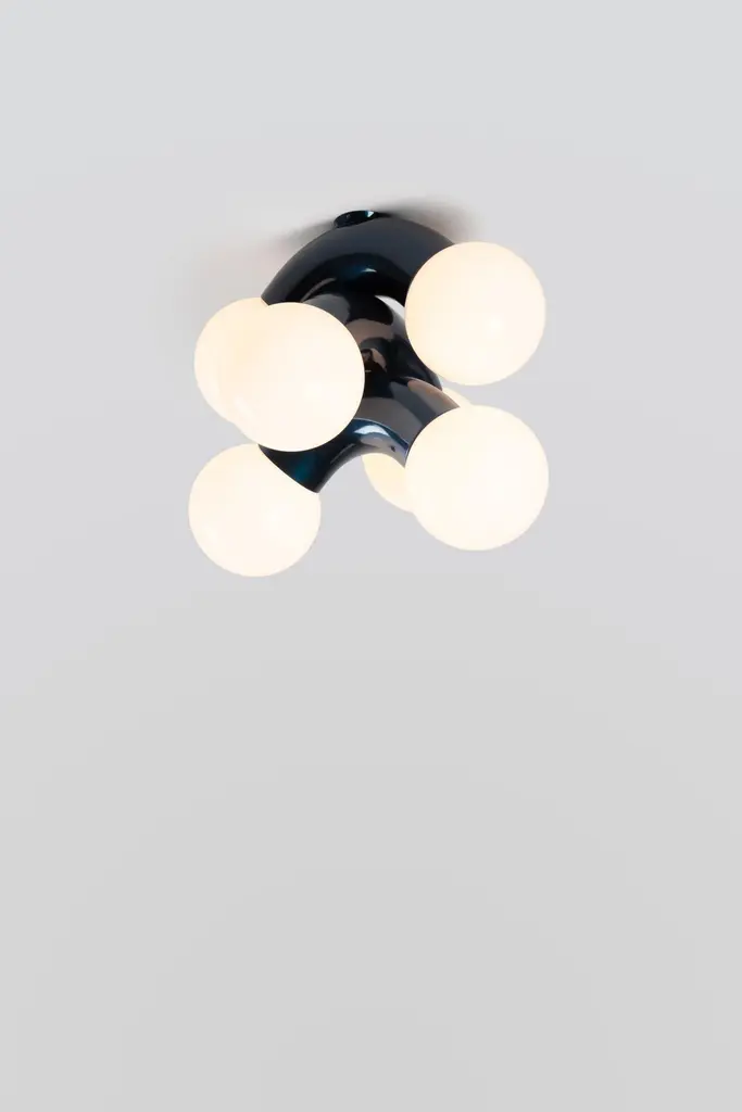 VINE 3-C, ceiling lampDesign: Caine Heintzman, Editor: ANDLightThe vine ceiling lamp combines exaggerated form with the propensity for repetition resulting in an ambitious vertically scaling fixture.Materials– Chromed steel– Opal glass globeDimensions42 x 42 x 38cm / 16.5” x 16.5” x 15”Electrical– 100–240V– Dimming: ELV– 3000K– 6 x 4W G9 LED LampPower trim options– Trimless (Mud-in or surface mount)– Cover plate (Junction box, 4.5” x 4.5”)Finishes– Chrome– Midnight chrome (blue)- Cadmium yellow.