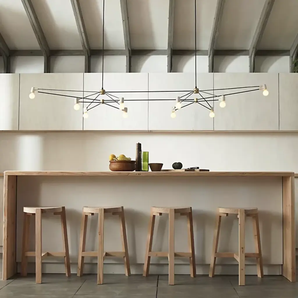 The Cord Linear Suspension from Ravenhill Studio is a study in balance and precision, merging refined materials with inspired engineering. This fixture is anchored at two points for balance and draws influence from Jean Prouvé’s Potence Lamp, featuring hand-cast ceramic sockets made in Los Angeles. Slender metal rods extend from central hubs, supporting two constellations of light sockets that distribute a warm, even glow. Cloth-covered power cords weave through the upper openings of each socket, creating structural tension that keeps the structure strong and supportive without unnecessary weight, resulting in a visually light yet functionally dynamic design.