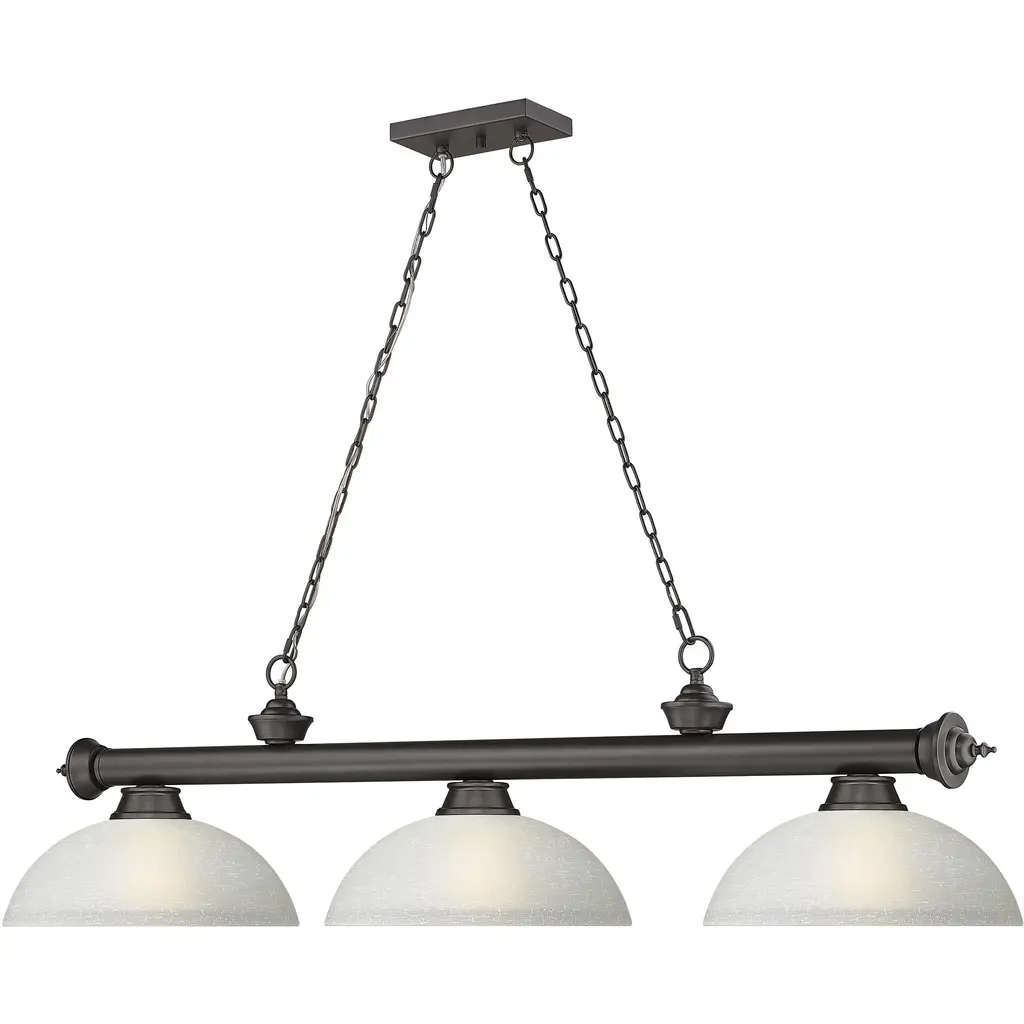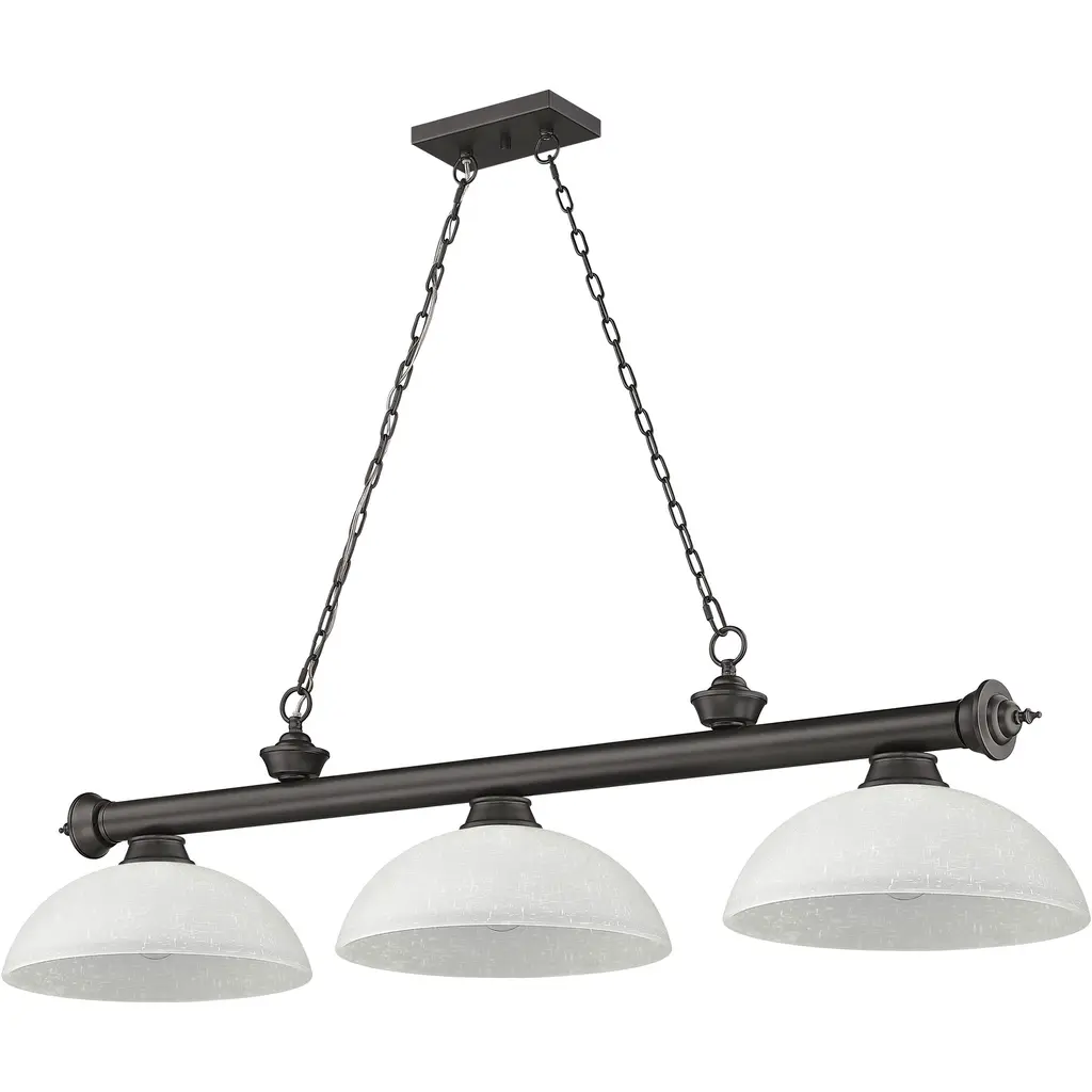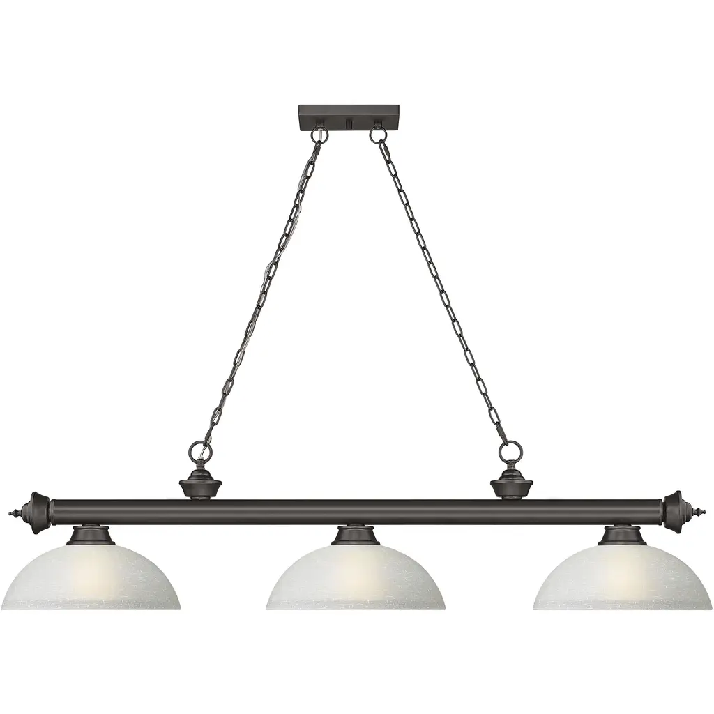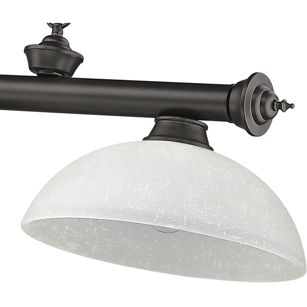 Blending a rich bronze finish with three white linen glass shades, this traditional metal billiard light adds an elegant aesthetic to interior decor. Suspend this stylish fixture in a kitchen, dining room, or game room to elevate your space with a warm, inviting glow.