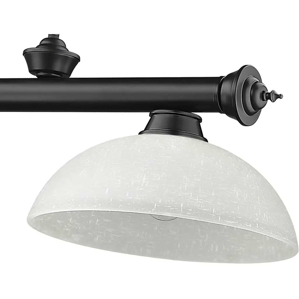 Add a fresh, modern edge to classic interior decor with this matte black and white linen glass billiard light. This traditional, three-light fixture lends fashion-forward elegance to game rooms, dining rooms, kitchens, and more.