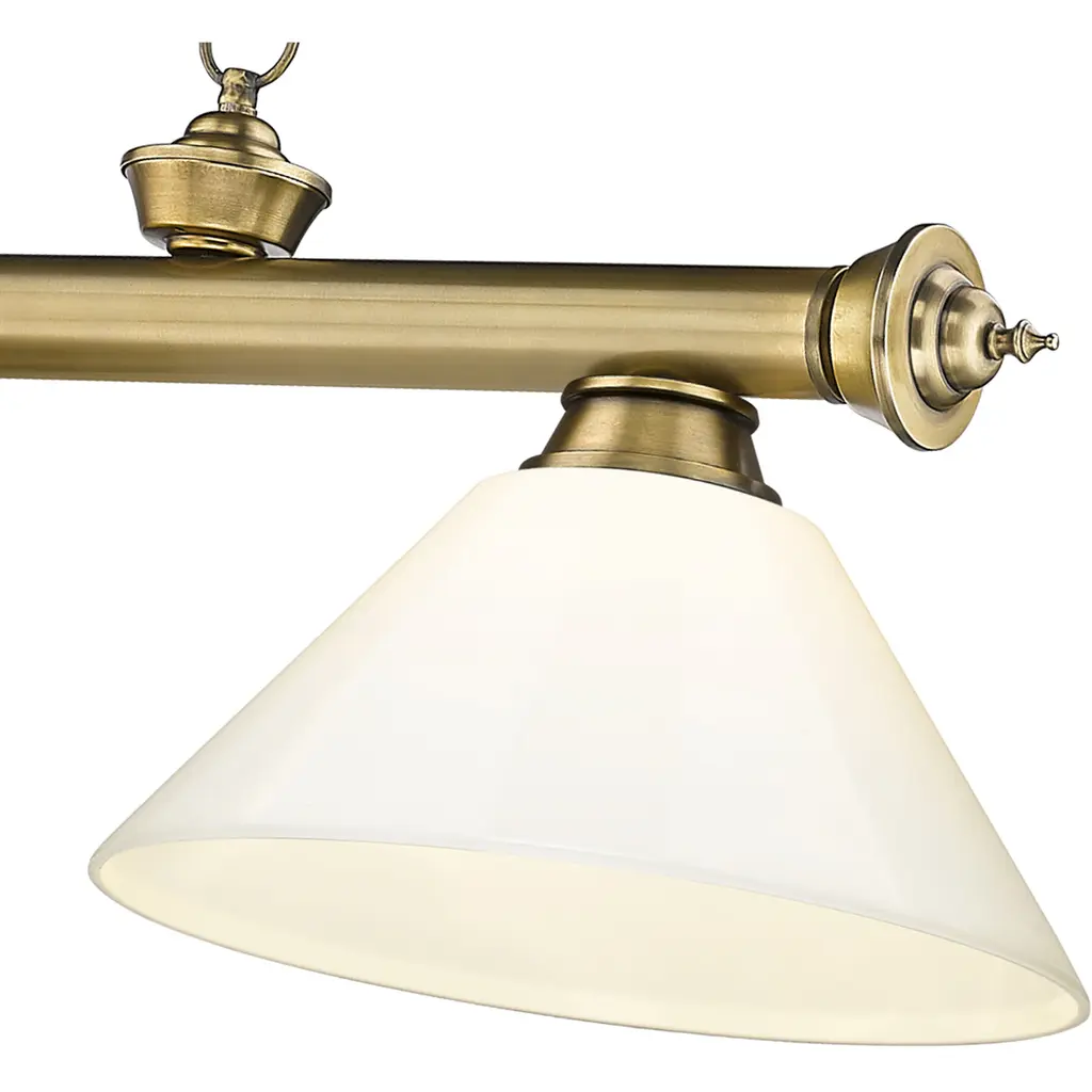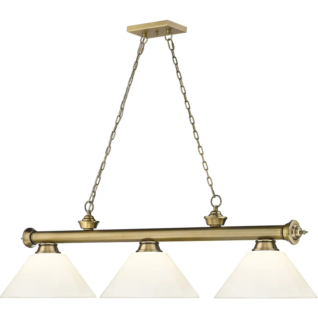Cordon 3 Light 57.25 Inch Rubbed Brass Billiard Ceiling Light In White Plastic