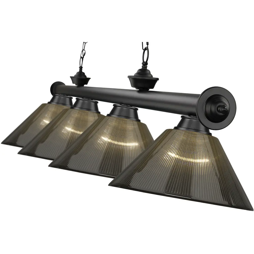 Illuminate a kitchen, dining room, or game room with this traditional metal billiard light. Crafted to elevate classic décor, this fixture features a matte black finish frame affixed with four textured smoke acrylic shades for a fashionable look that enhances any home with stylish character.
