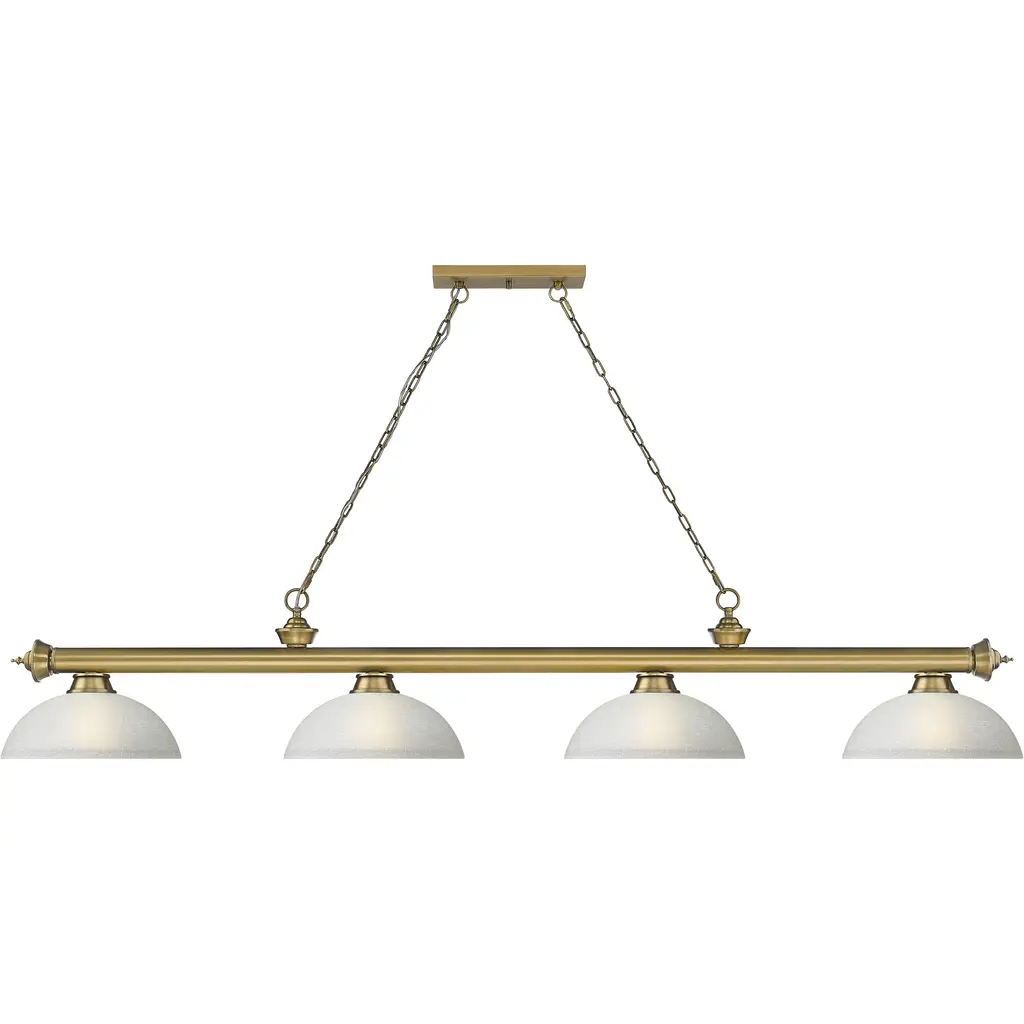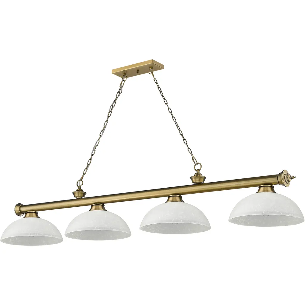 Featuring four delicate, white linen glass shades affixed to a rich, rubbed brass finish frame, this traditional metal billiard light adds an elegant update to classic interior decor. Illuminate a kitchen, dining room, or game room with this effortlessly stylish fixture from the Cordon collection.
