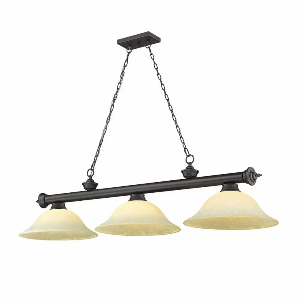 Illuminate a kitchen, dining room, or game room with this traditional metal billiard light. Crafted to complement classic decor, this fixture features a bronze finish frame affixed with four delicate, white mottle glass shades that create a lovely, diffused glow.