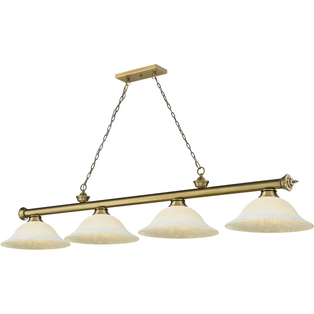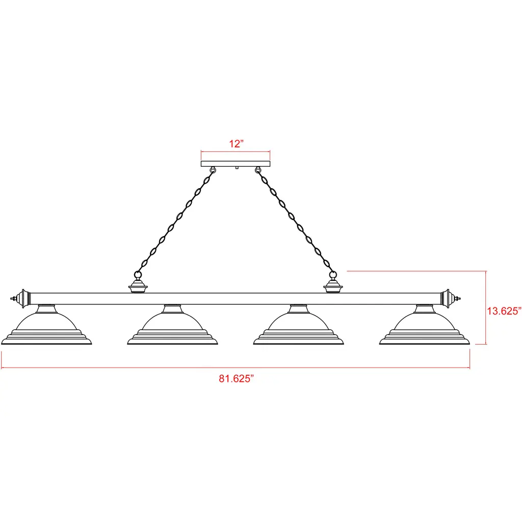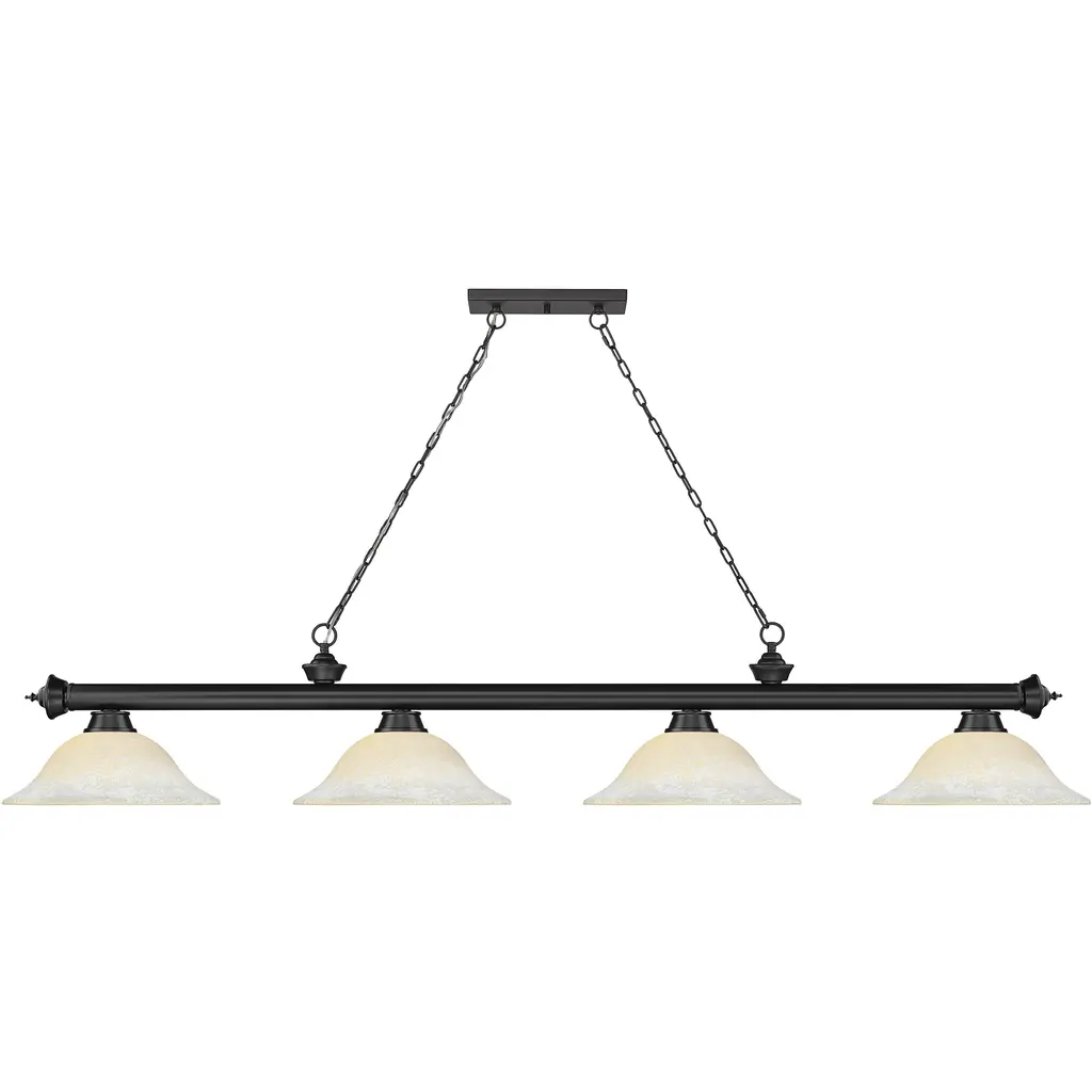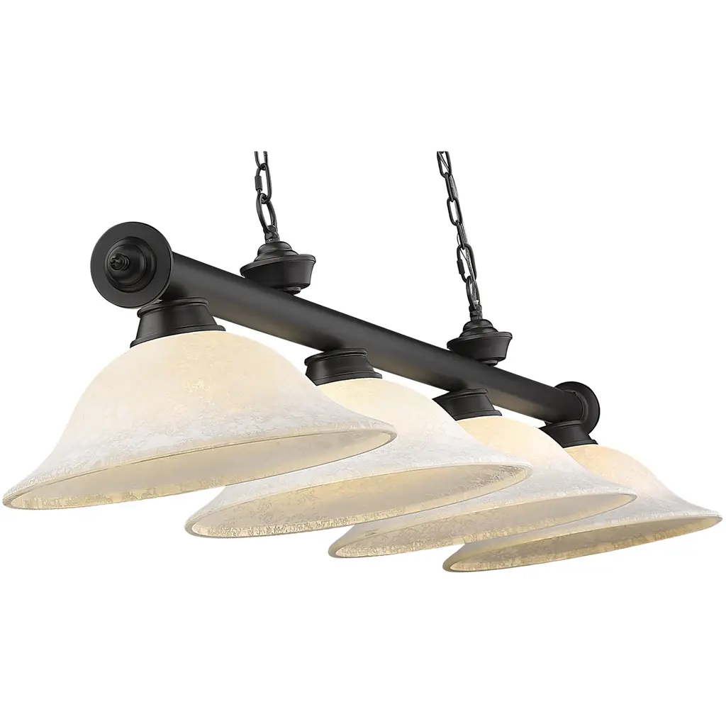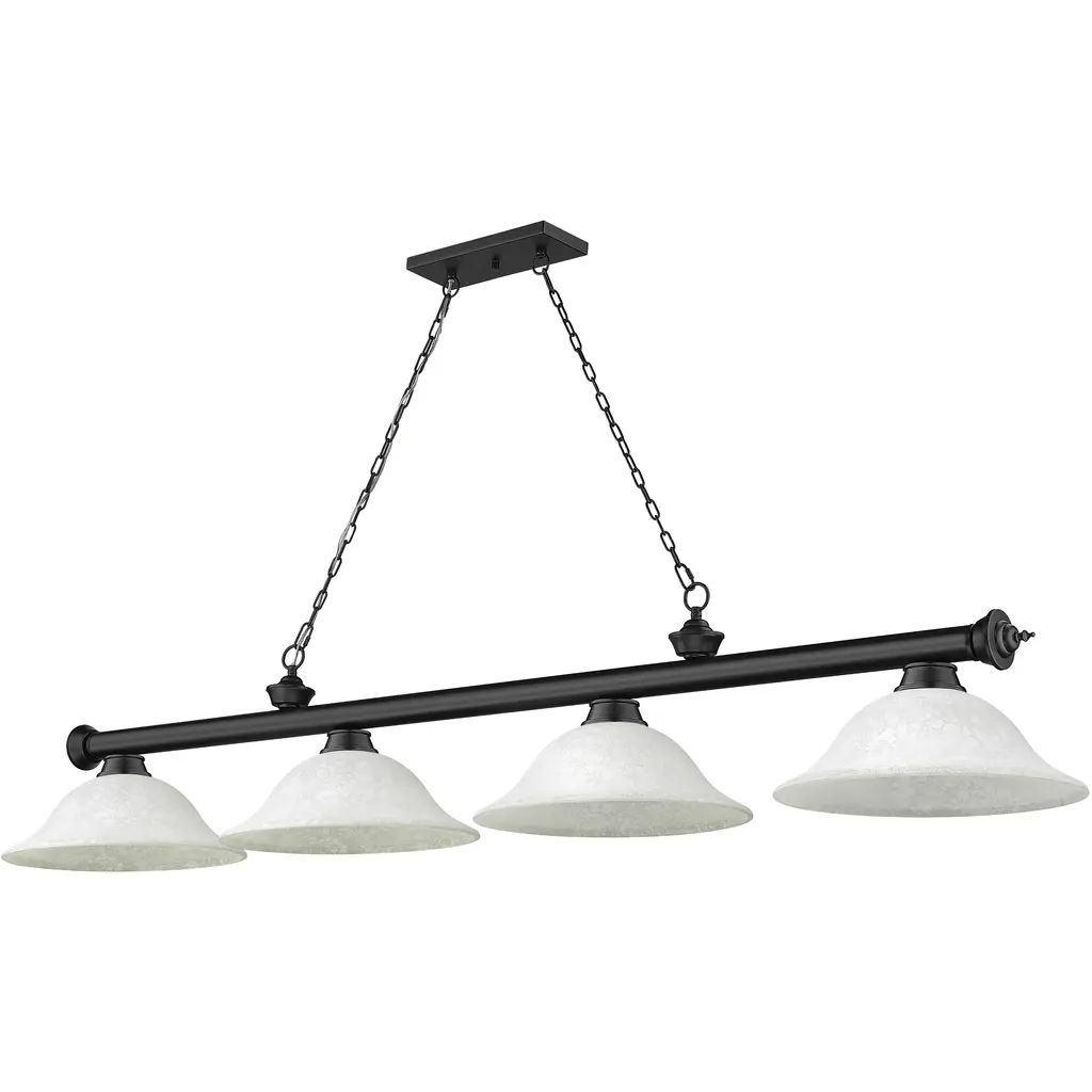 Featuring a matte black finish frame affixed with four elegant white mottle glass shades, this traditional metal billiard light adds modern elegance to classic interior décor. Effortlessly enhance a kitchen, dining room, or game room with this attractive fixture from the Cordon collection.