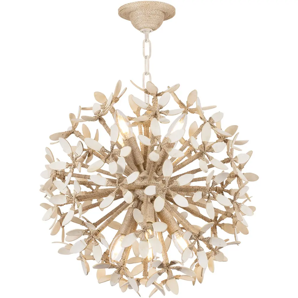 A delicate botanical motif gives this contemporary Sputnik design an organic twist, while intertwining couture artistry. Corfus soft, wispy petals sprout from a central point, creating a burst of light and life. Natural materials like bleached abaca and coco shells impart a neutral tonality and airy quality. As a semi-flush mount in two sizes or a chandelier in three sizes, Corfu is a whimsical delight for the senses.