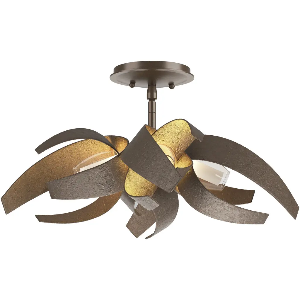 Our iconic Corona is now available as a semi-flush ceiling fixture. This transitional piece fits perfectly in high-end design. The Corona is handcrafted by Vermont artisans who shape hand-forged steel into gentle curves. Light is delivered via clear/frosted glass diffusers.