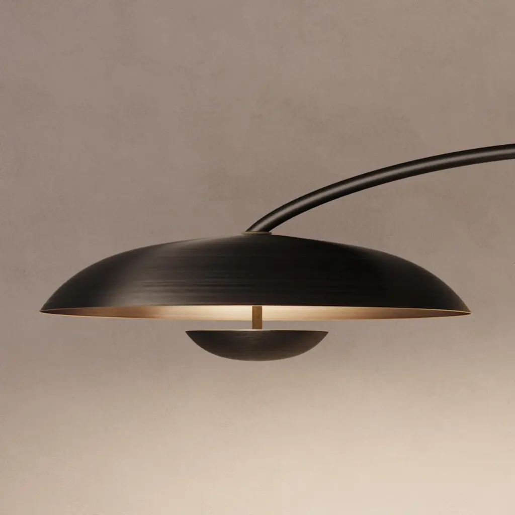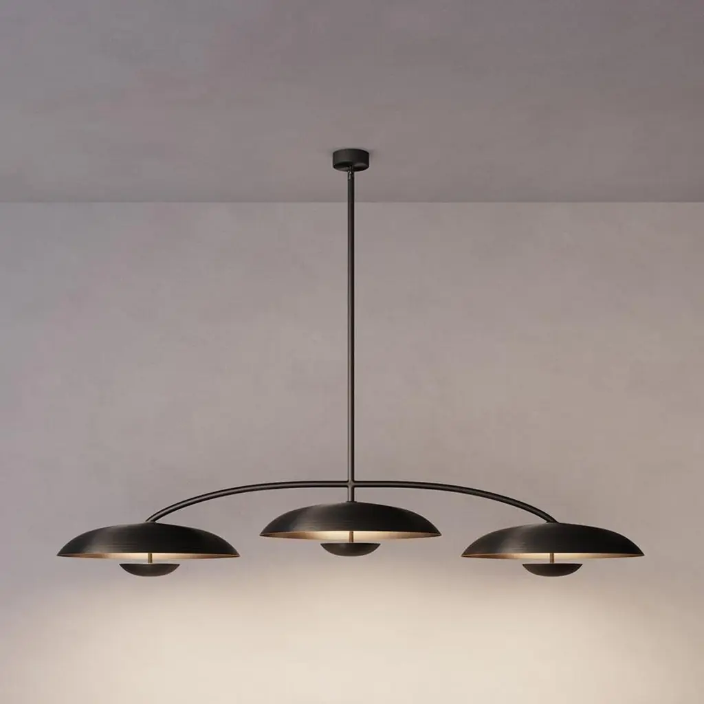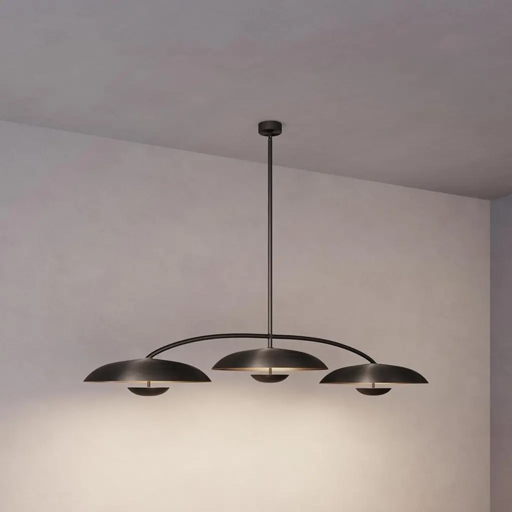 Trio for three, a unique ceiling light composed by a cluster of lighting components. Combining patinated brass plates and finely brushed bronze framework, the Orbit Trio ceiling light is softly illuminated with LED elements from within. This sculptural piece sits elegantly in both residential and commercial interiors. Please note that with each handmade process being slightly random, every result is individual.Dimensions:Width 160cm (63in), height 115cm (45.2in), depth 60cm (23.6in)Weight:20kg (44.1lbs)Materials:Dark bronze patinated brass shadeDark bronze frameworkPlease note each piece is finished by hand and will vary slightly in its patterns and textures. Illumination:LED colour temperature 2700KLED dimmable driverOutput 700mA 50W 3000lmInput 120/240V50,000 hours rated lifeCeiling mounted.LED driver to be integrated into ceiling.All components supplied.Region:CE certified; UL Listing available at a small surcharge.