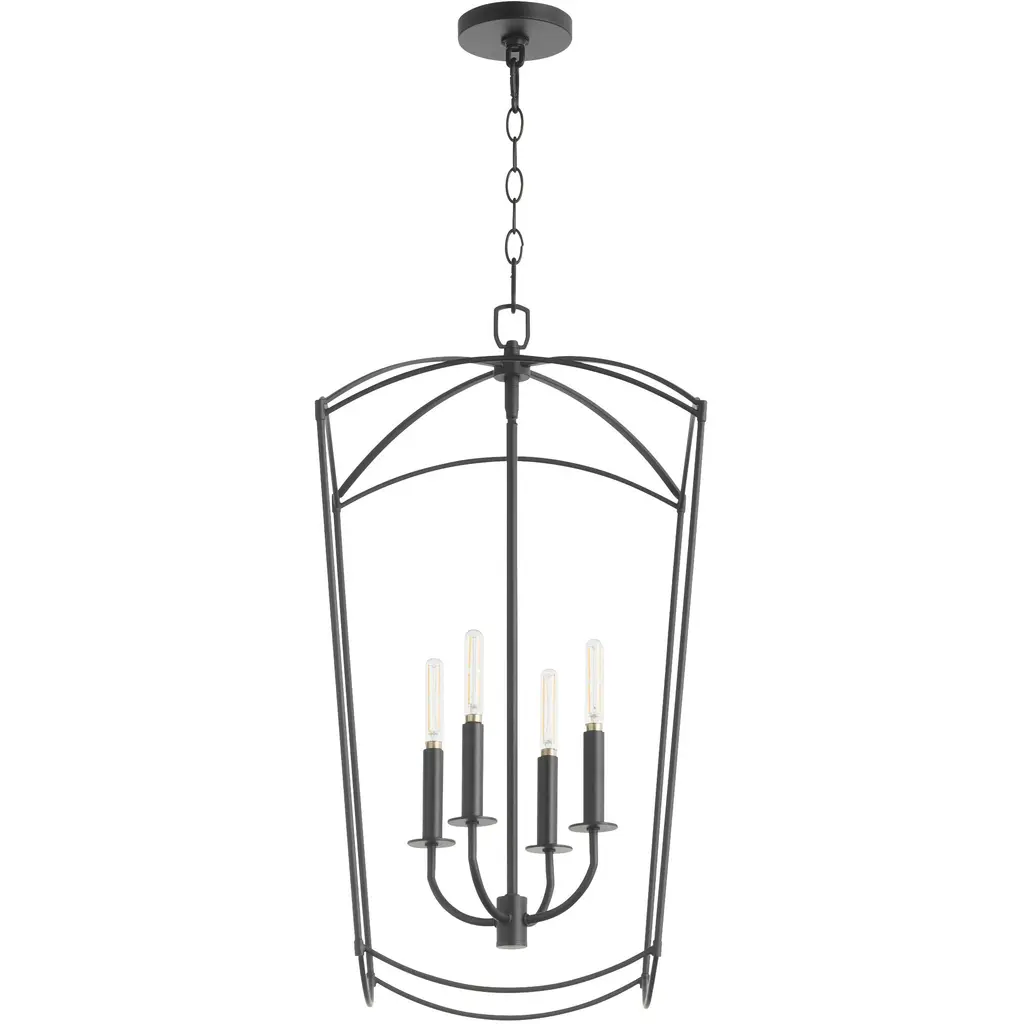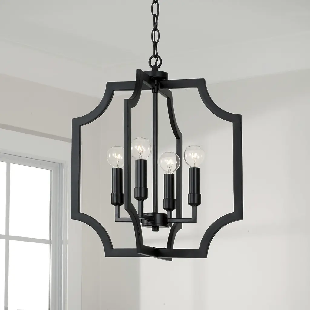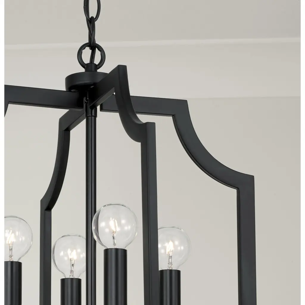 With the open, airy silhouette, the Courtney Lantern Foyer Pendant brings a charming aesthetic that doesn't overpower. The curved corners add chic appeal, while the Matte Black finish creates a bold, modern style.