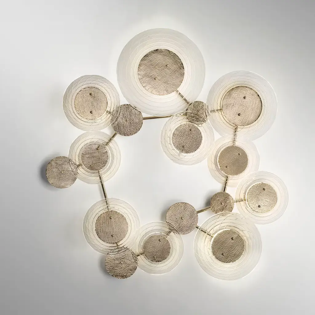 Crafted with intricately designed crystal, this ceiling lamp features a distinctive hammered effect that adds depth and character to its aesthetic. Each detail of this piece has been meticulously designed, ensuring that elegance and refinement are at the forefront. The lamp emits a warm, enchanting glow that not only brightens a space but also transforms the atmosphere into a magical retreat. This lamp can be installed also on the wall, acting as a stunning focal point. Its sculptural beauty elevates interiors, making it a luxurious addition to homes seeking both style and functionality. It features ten lights. Bulbs are not included.