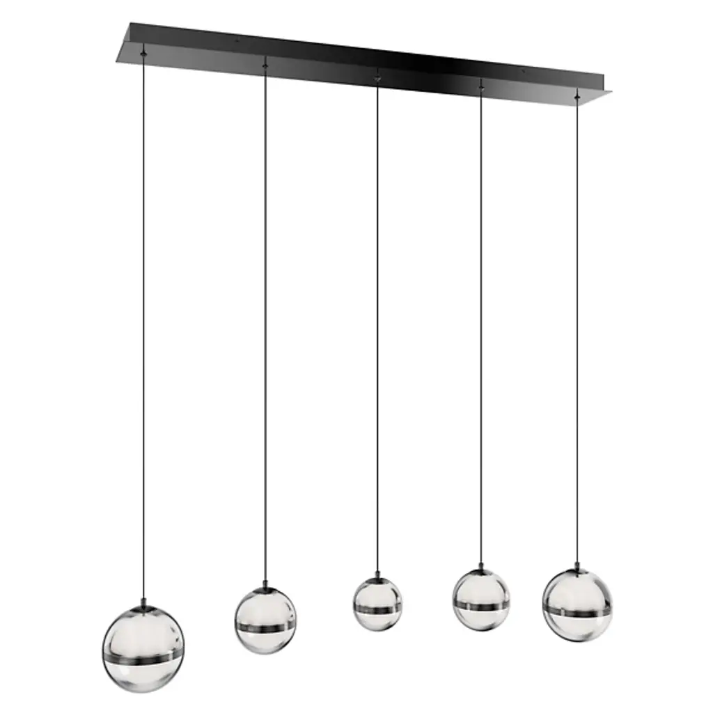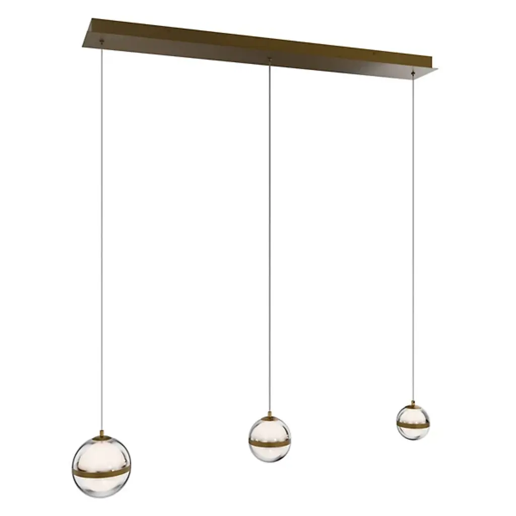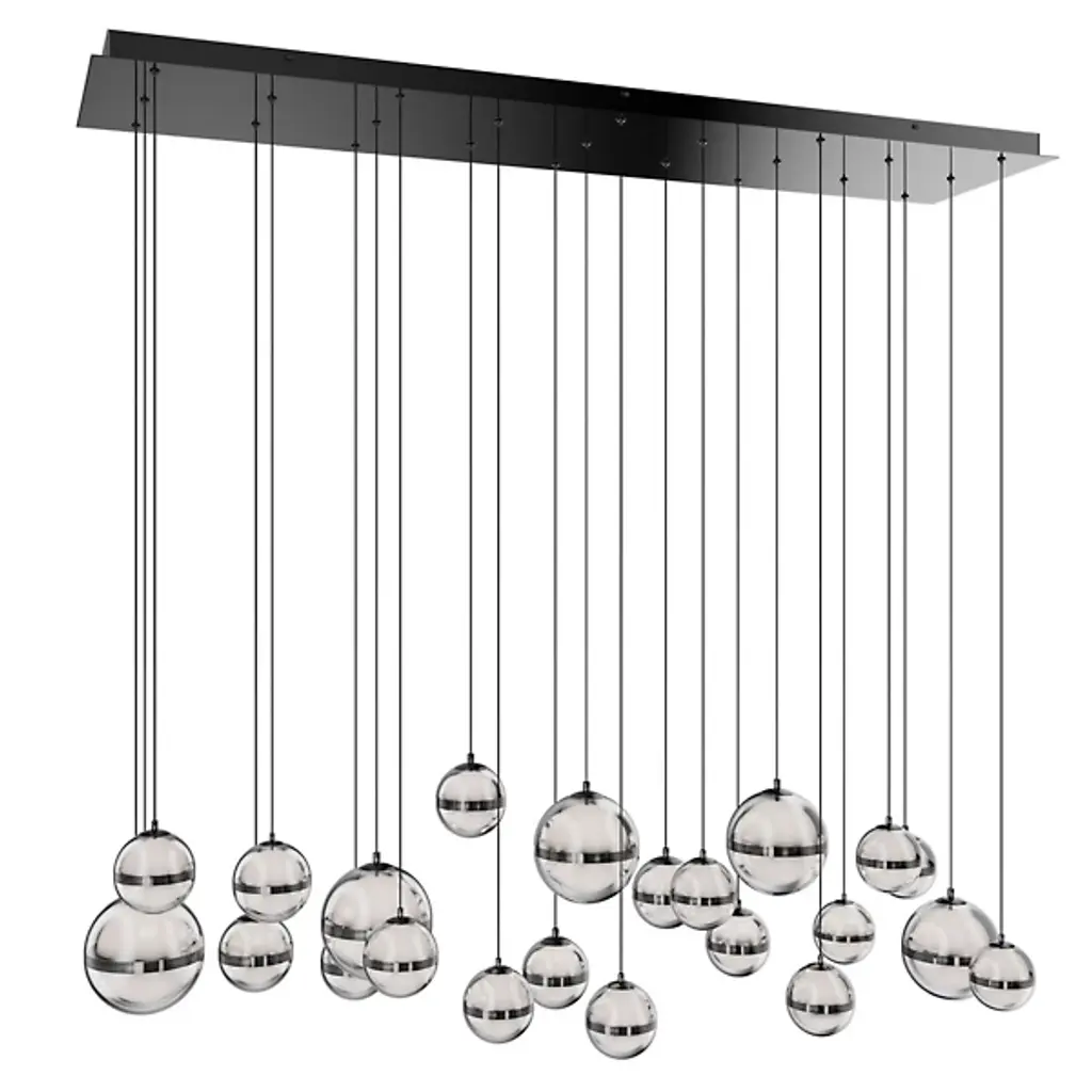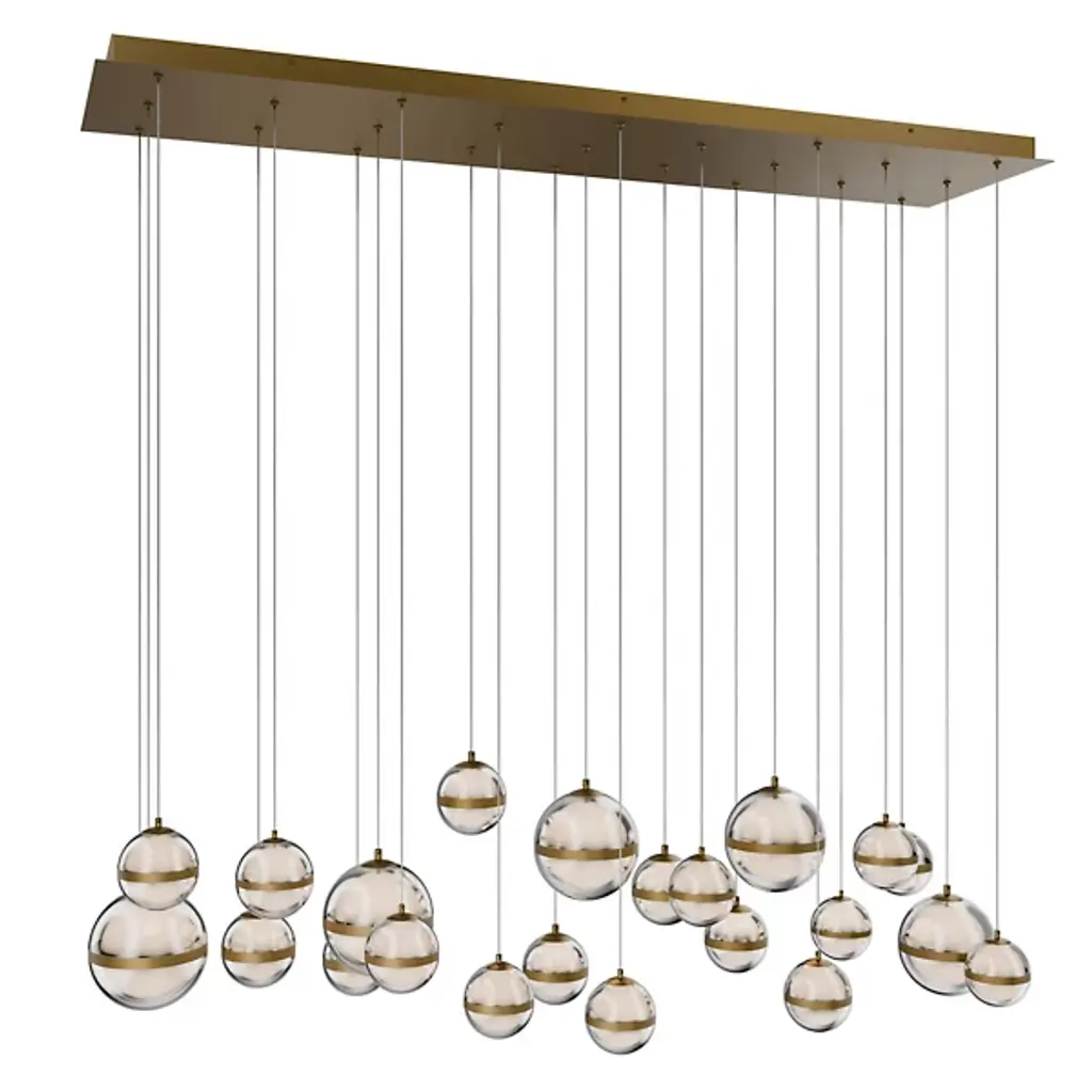The Cyllindra LED Linear Suspension from dweLED features multiple glass spheres arranged along a linear canopy, with each sphere separated by a horizontal aluminum band at its equator. The spheres hang at uniform intervals, creating a rhythmic composition that extends across the length of the canopy. Each glass globe comprises two hemispheres joined at the band, allowing light to radiate through the translucent surfaces. The linear arrangement transforms the individual pendant into a multi-source installation, and electrified cables suspend each sphere independently with adjustable heights via push pin connectors at the canopy.