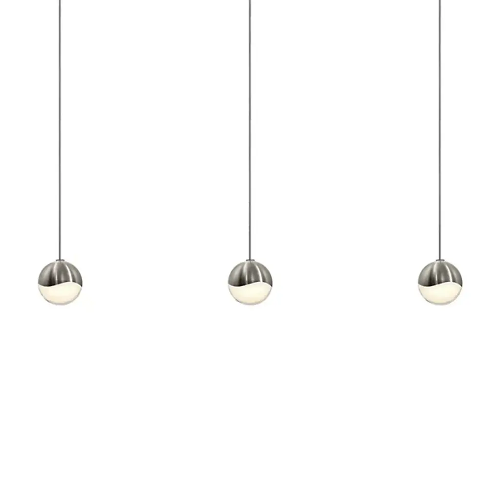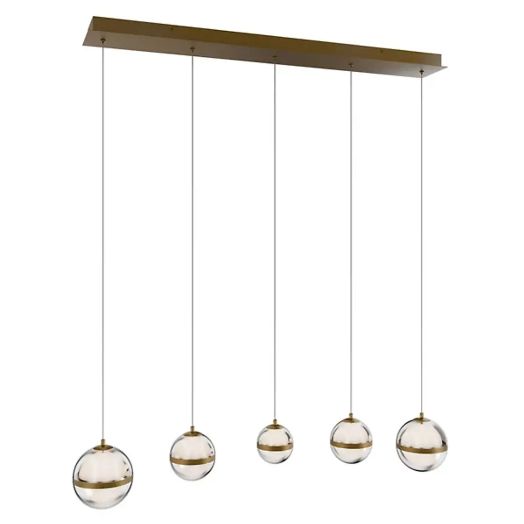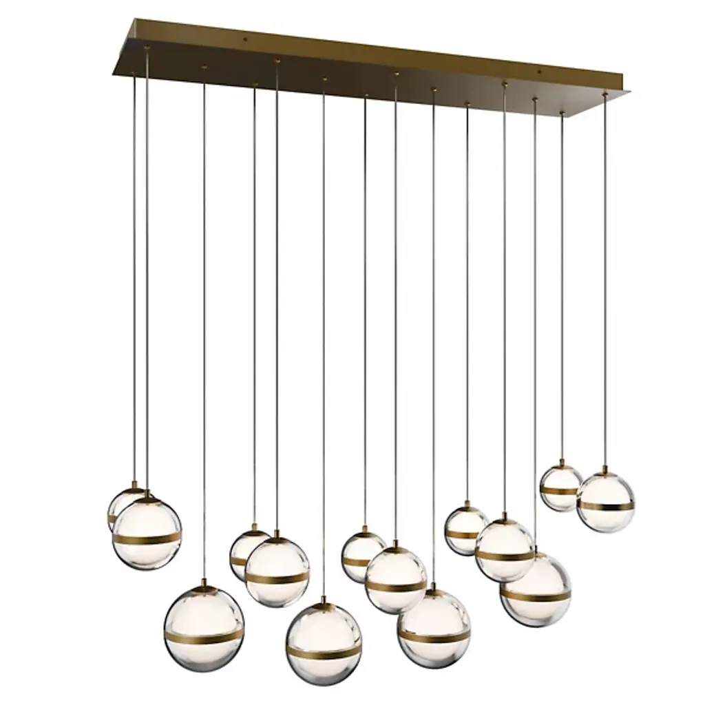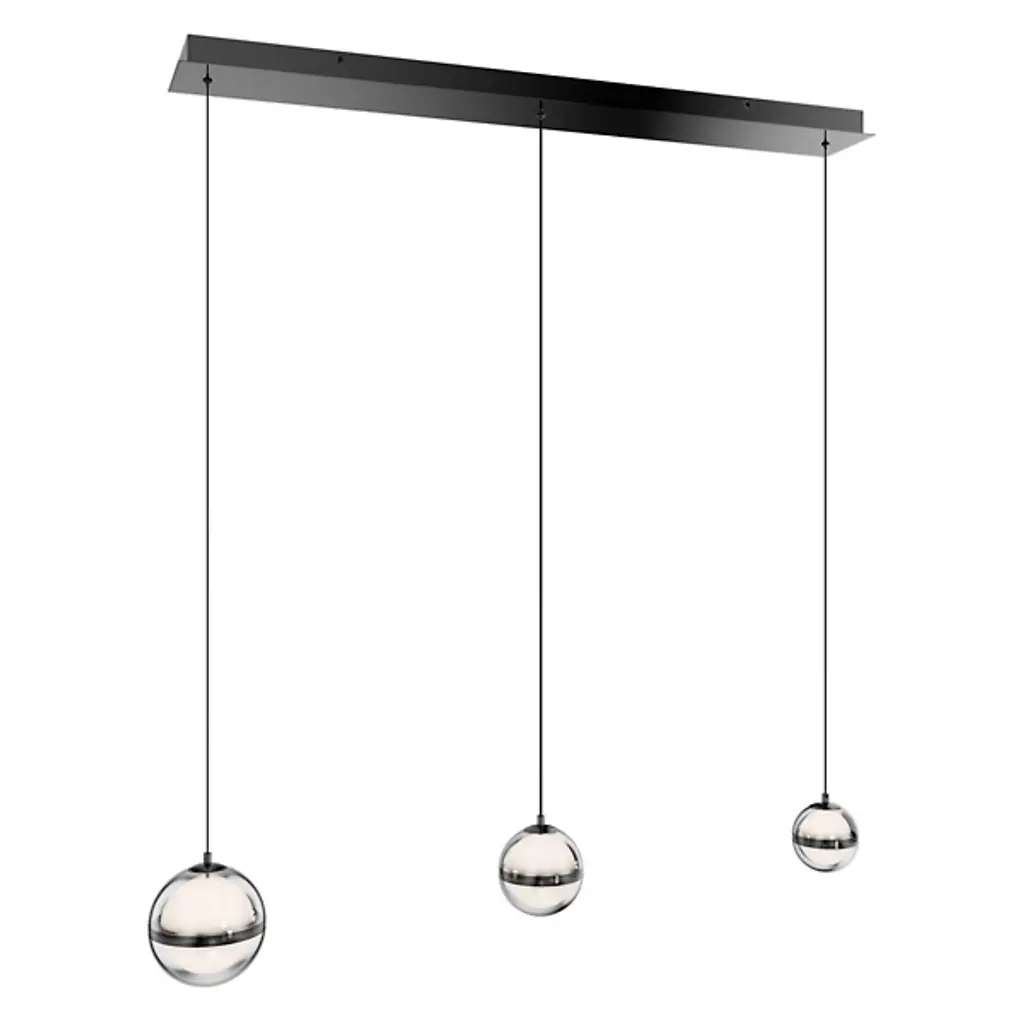 The Cyllindra LED Linear Suspension from dweLED features multiple glass spheres arranged along a linear canopy, with each sphere separated by a horizontal aluminum band at its equator. The spheres hang at uniform intervals, creating a rhythmic composition that extends across the length of the canopy. Each glass globe comprises two hemispheres joined at the band, allowing light to radiate through the translucent surfaces. The linear arrangement transforms the individual pendant into a multi-source installation, and electrified cables suspend each sphere independently with adjustable heights via push pin connectors at the canopy.