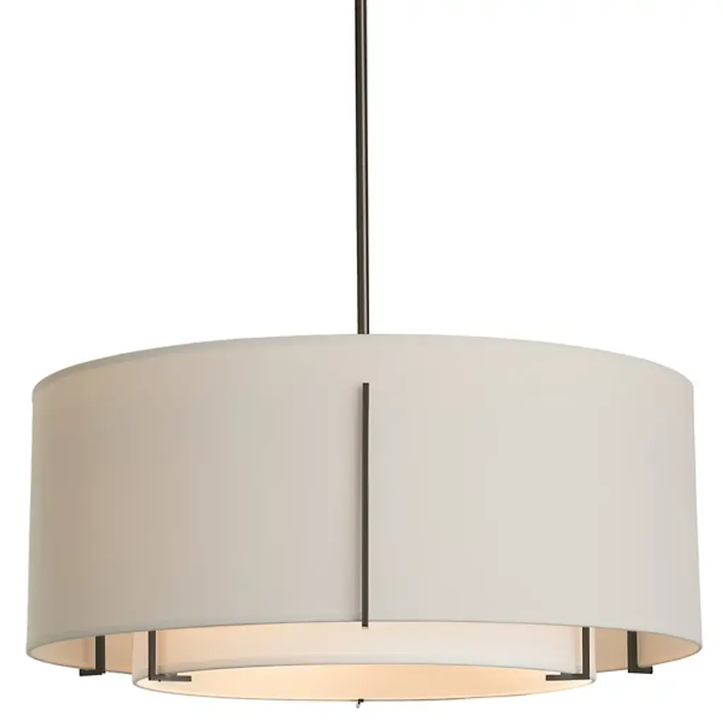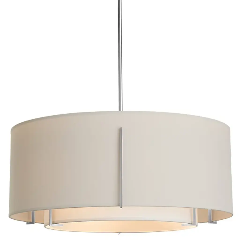 The Dayna Shade Pendants four light indoor pendant in brushed nickel is the perfect way to achieve your desired fashion or functional needs in your home. The sleek, fabric shades and smooth acrylic diffusers of the Dayna shade pendant collection by combine to create a warm glow. Finished-off with decorative metal finials to secure the White Acrylic diffusers in place, these fixtures convey a tailored look while creating both ambient and task lighting. The assortment includes two-light, three-light and four-light pendants and a two-light flush /semi-flush convertible all with classic drum shades, as well as a large four-light pendant with an angular trapezoidal shade, and all are offered in either Brushed Nickel or Burnt Sienna finishes with either Cream or Beige Faux Linen fabric shades. Both incandescent lamping and ENERGY STAR-qualified LED lamping are available; all fixtures are California Title 24 compliant.