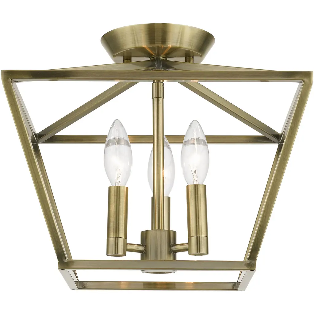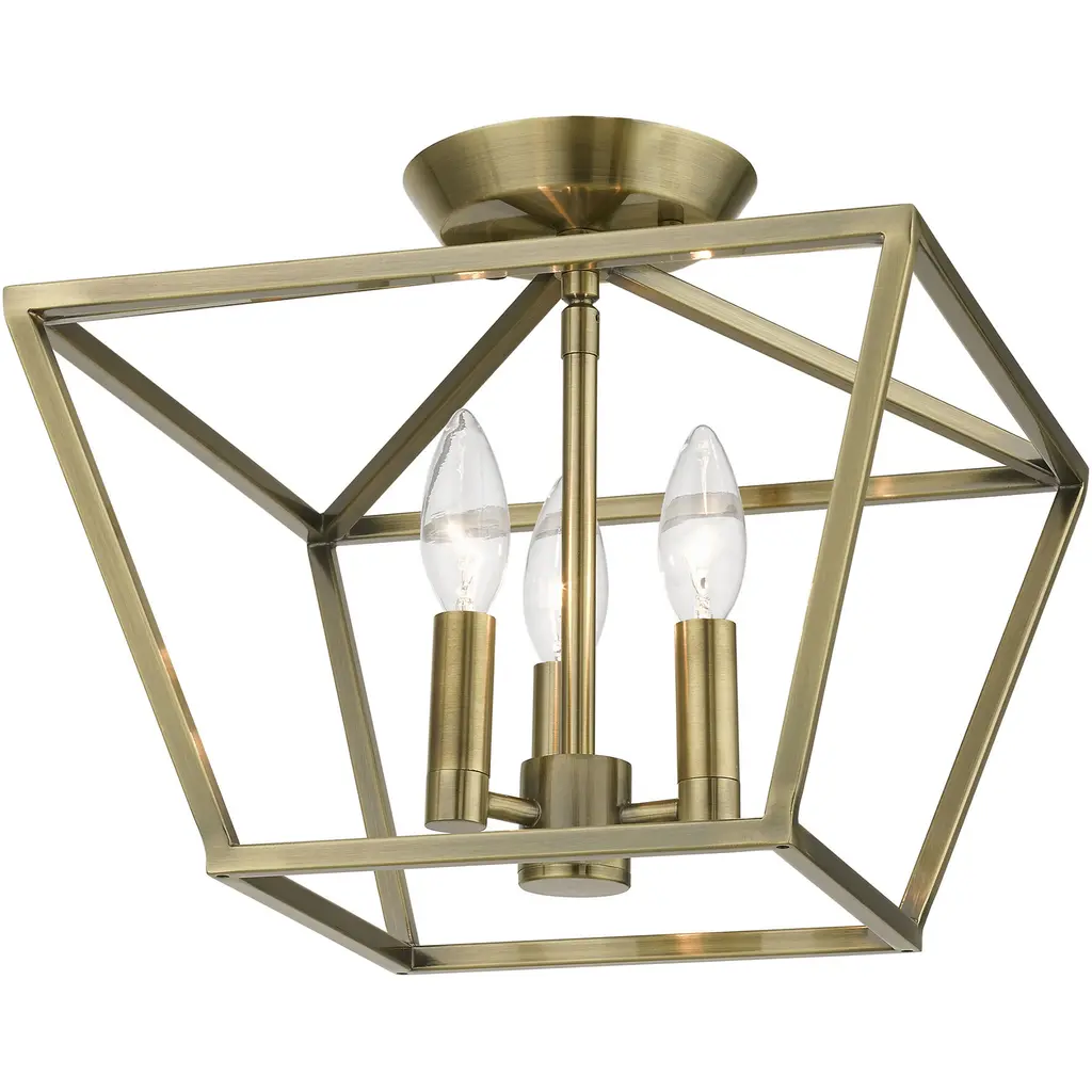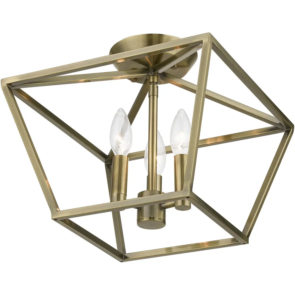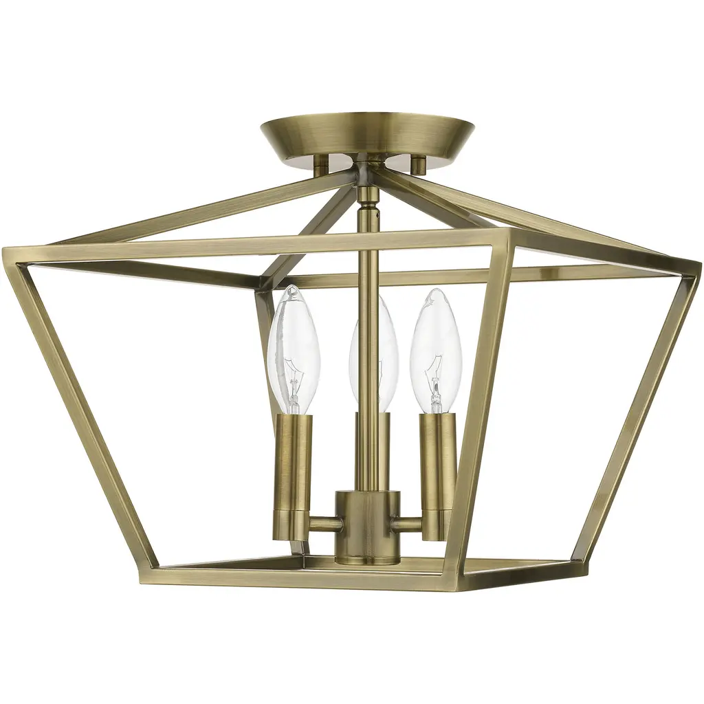 Devone 3 Light 13 Inch Antique Brass Semi-Flush Ceiling Light, Square