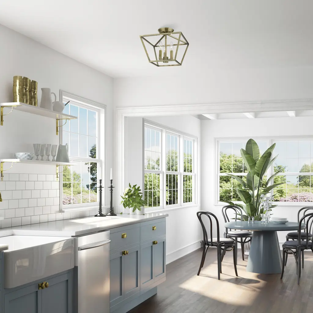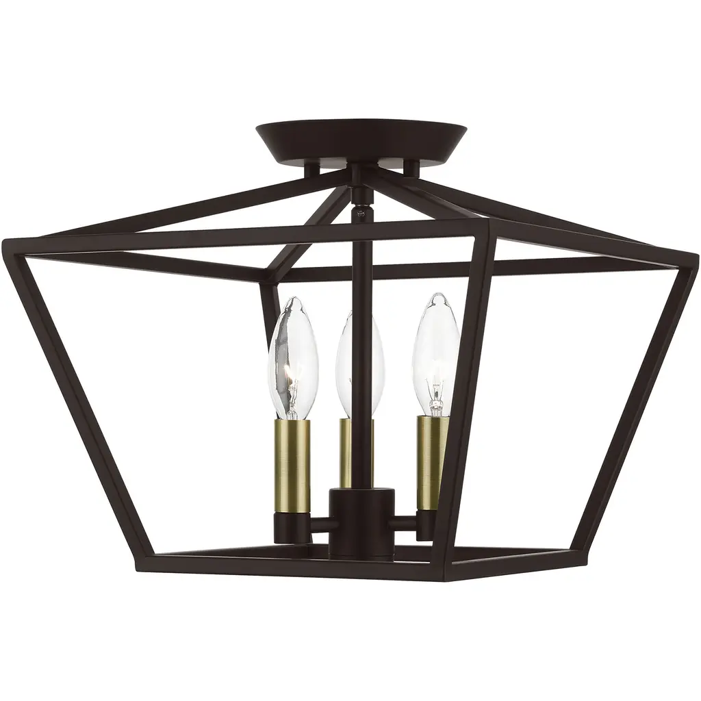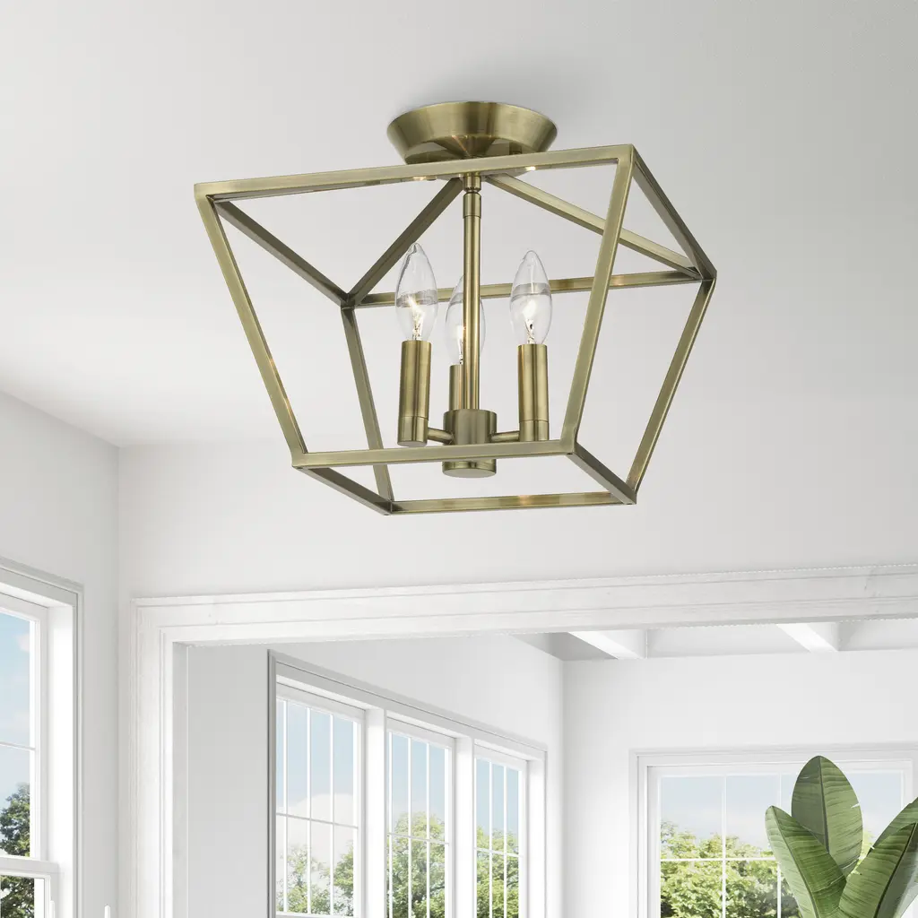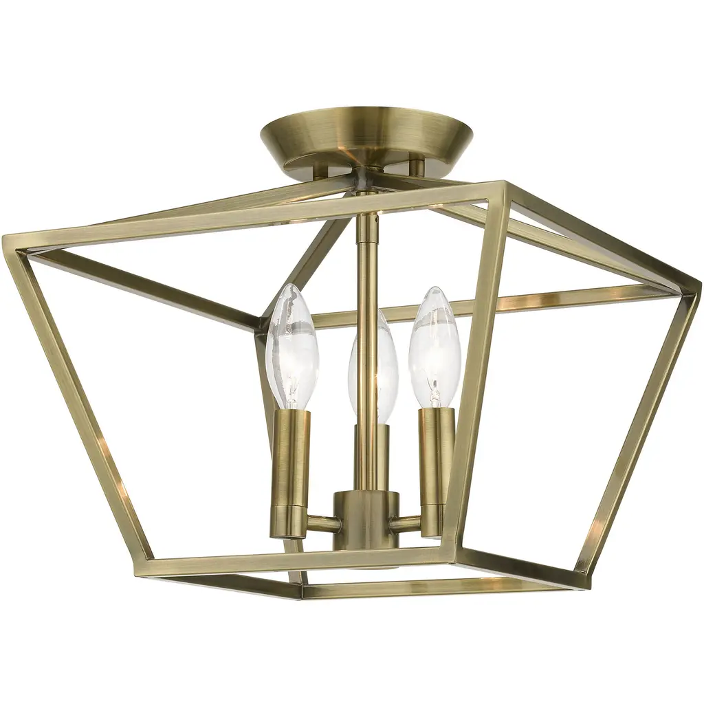 Devone 3 Light 13 Inch Antique Brass Semi-Flush Ceiling Light, Square