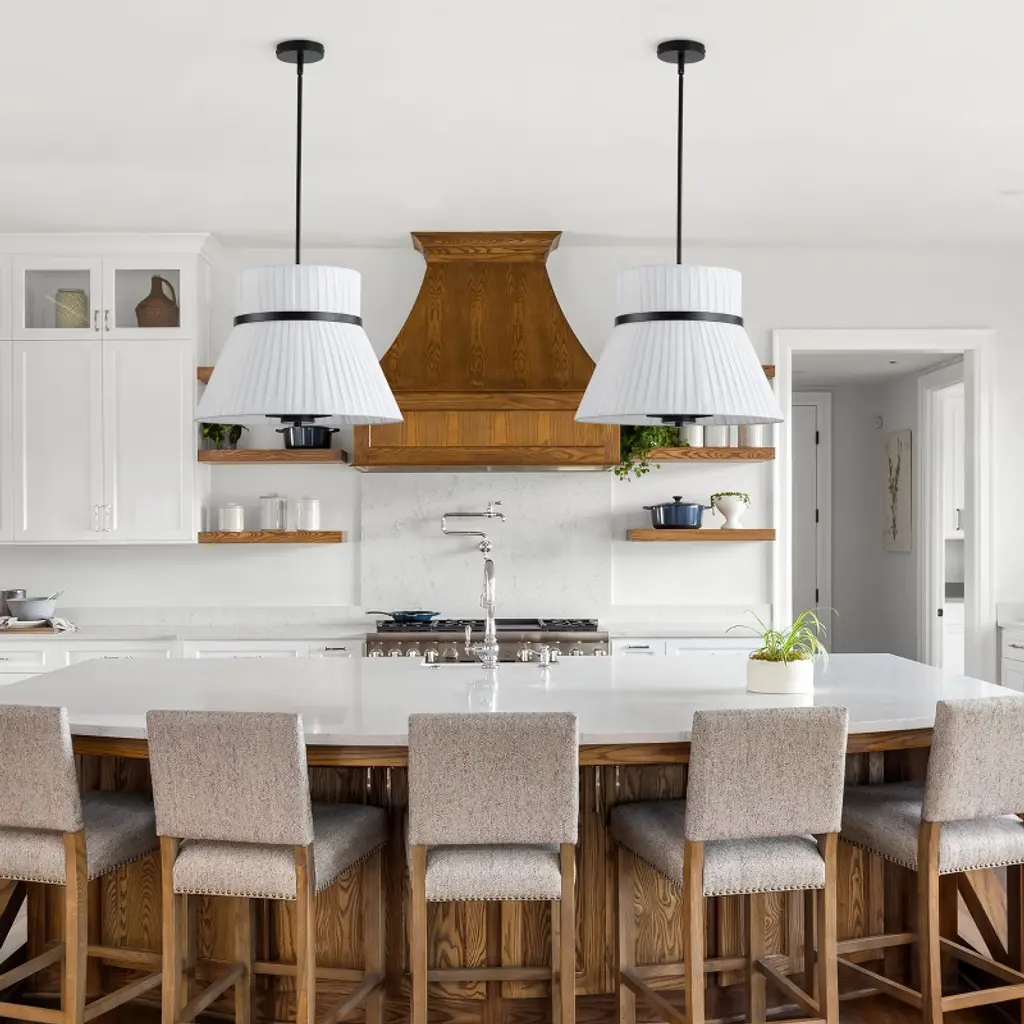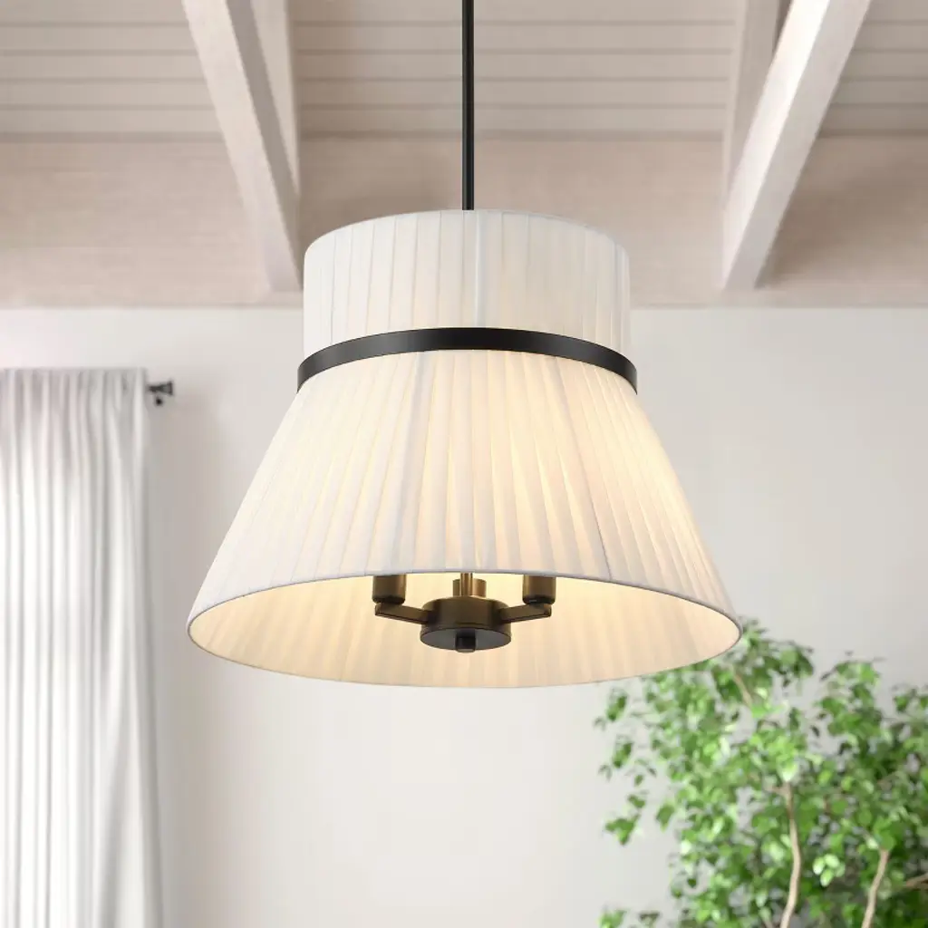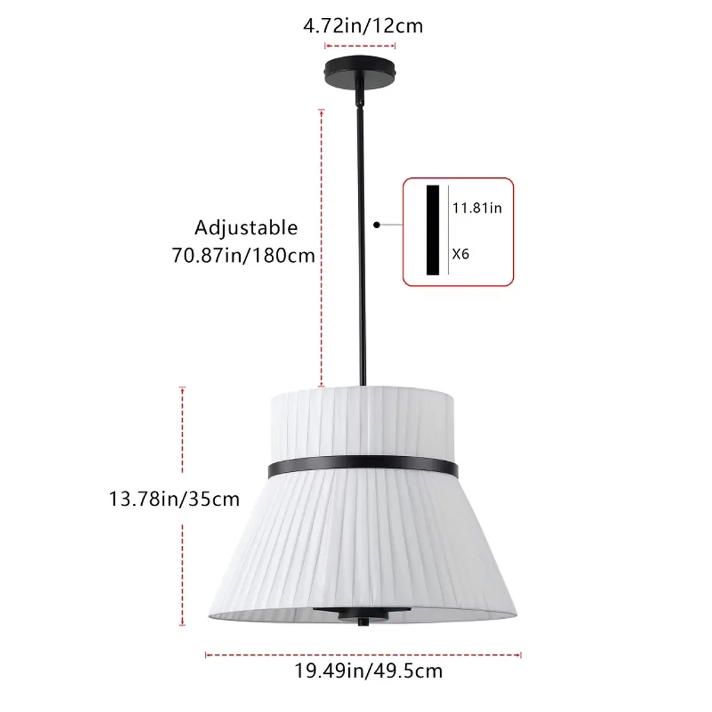 Bring a modern, elegant touch to your home with the Dewdrop Modern Fabric Pendant Light. Designed with a matte black iron frame and pleated white fabric shade, this pendant combines classic charm with contemporary style. Featuring 3 E12 sockets (120V, 25W max each), it provides soft and balanced lighting, perfect for dining rooms, kitchens, bedrooms, or entryways. The adjustable hanging rod with swivel joint makes installation easy on flat or sloped ceilings. Built with ETL certification and high-quality wiring, this ceiling light ensures safety, durability, and timeless appeal.