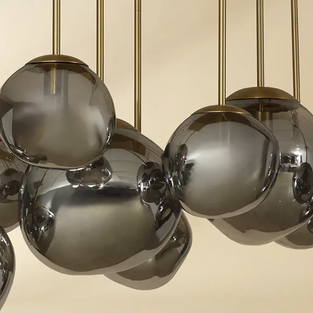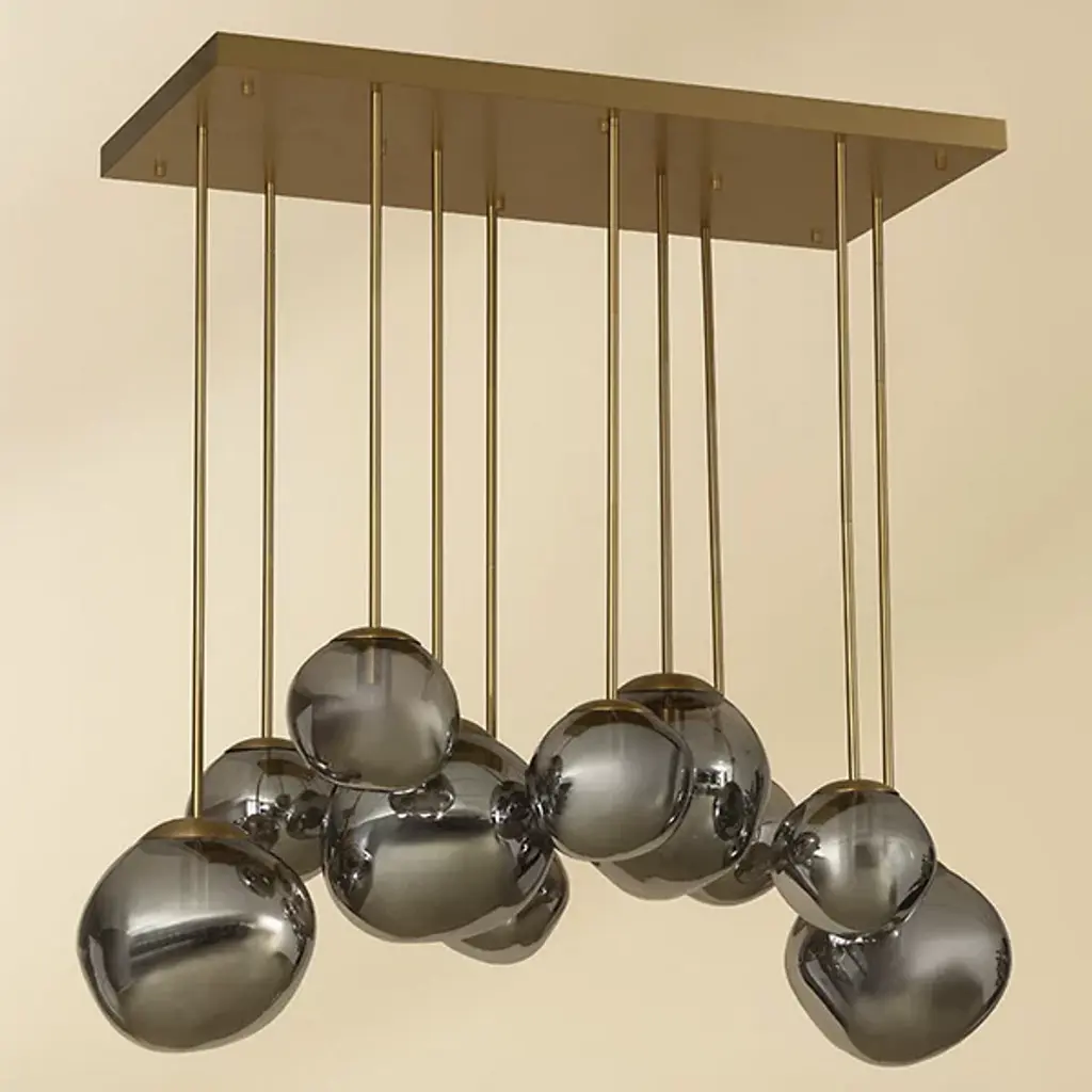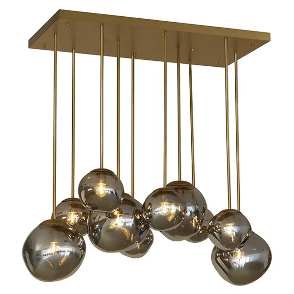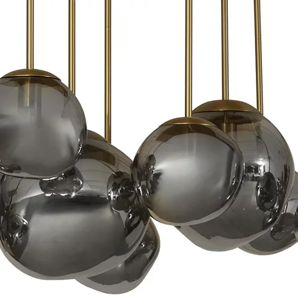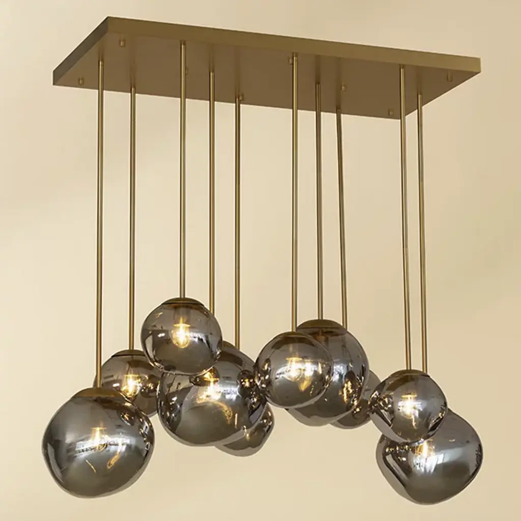 The Dionis Linear Suspension from Sunpan plays with spatial perception through a crafty arrangement of smoked glass globes. Multiple spheres in two distinct sizes hang from slim metal rods at varying heights, creating an organic cluster effect that defies rigid symmetry. Each glass globe mimics the inconsistent yet refined quality of hand-blown glass, with subtle variations in the smoky finish. The iron frame, finished in brushed gold, offers adjustable rods that allow customization of the hanging height. This hardwired ceiling fixture updates an ordinary dining area or entryway through its translucent smoke-tinted spheres.