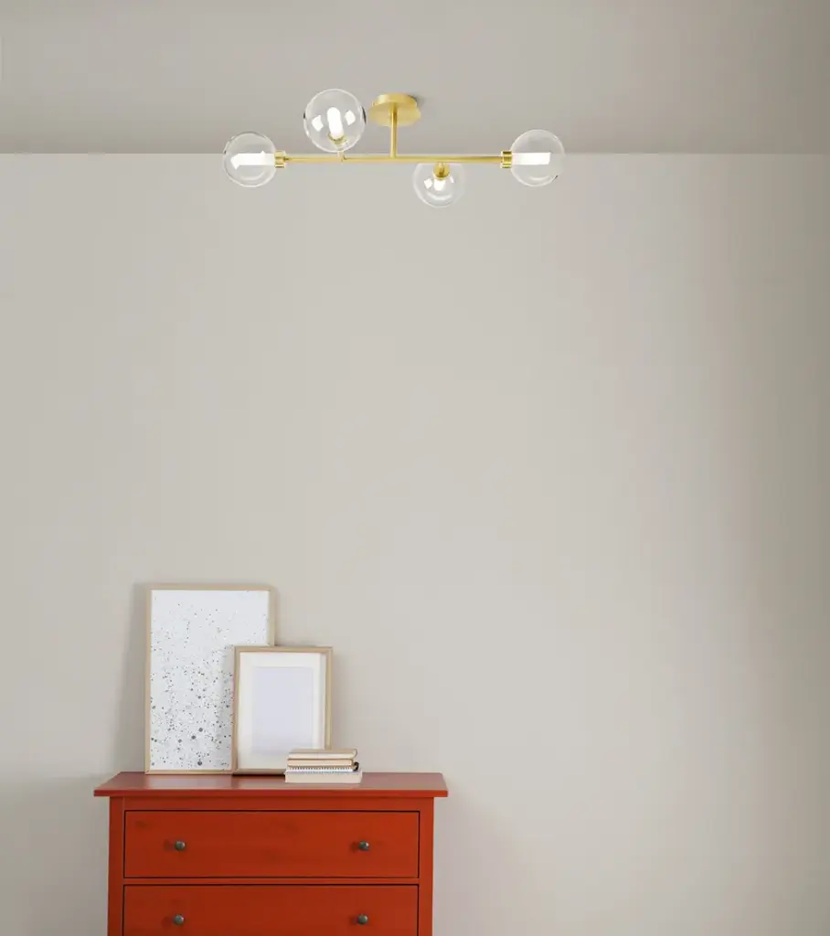 Dom is a 4-light wall/ceiling lamp made of transparent borosilicate glass and satin-finish cylinder.Brushed brass support.Source G9Power 4 x max 28w