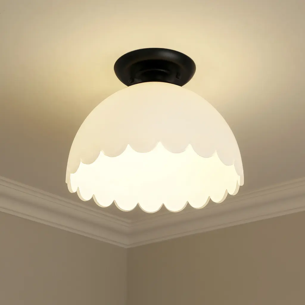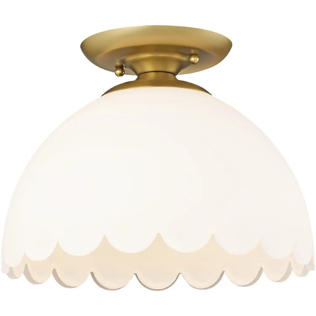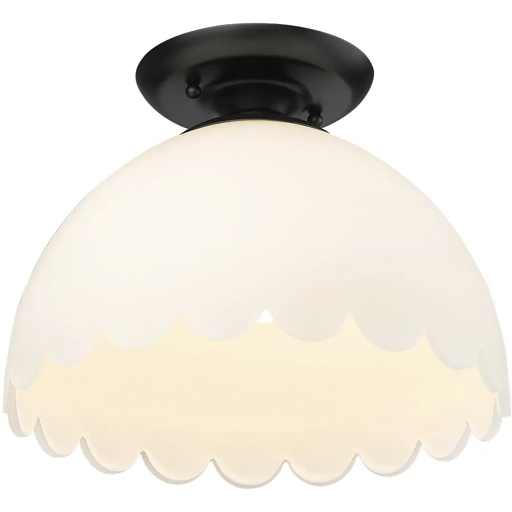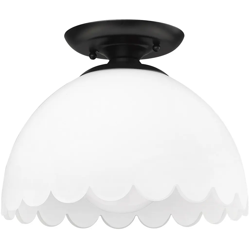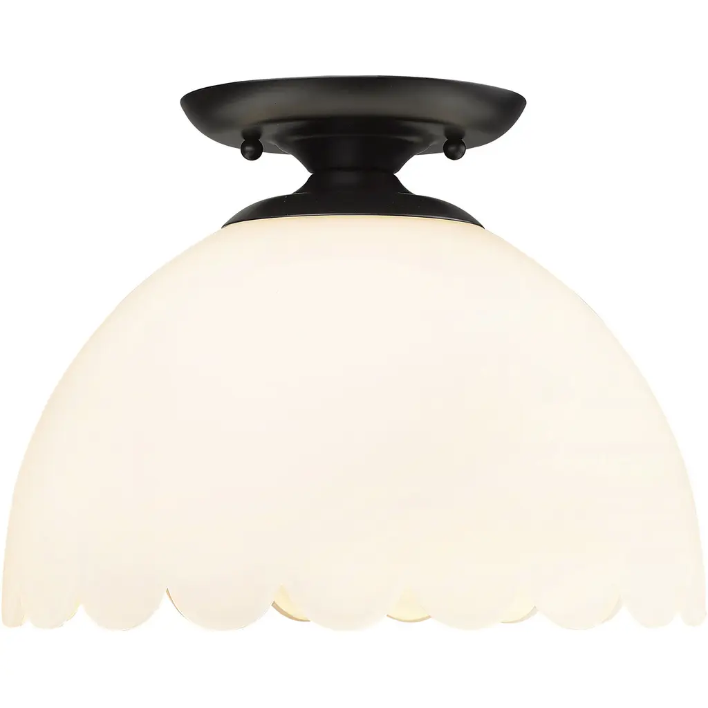 Bring transitional charm into your home with the Golden Lighting Dorinda 1-light Semi-Flush Mount in Matte Black. Showcasing a glass shade and a matte black frame, this fixture creates a welcoming atmosphere. The opal glass shade is designed to diffuse light evenly, producing a soft, glare-free glow that enhances any interior. The matte black finish boasts timeless versatility, seamlessly complementing a range of styles from contemporary to industrial. Suitable for entryways, bedrooms, kitchens, and living areas with mid-height ceilings, this semi-flush mount is damp location rated, making it a practical choice for spaces with occasional moisture. Its sturdy design ensures easy installation, allowing for both style and stability. With dimensions of 12.25"W x 9.13"H x 12.25"D and requiring one E26 medium base bulb (not included, max 100 wattage), this fixture exemplifies quality and functionality. Illuminate your living space with elegance and sophistication.