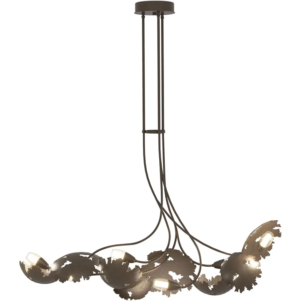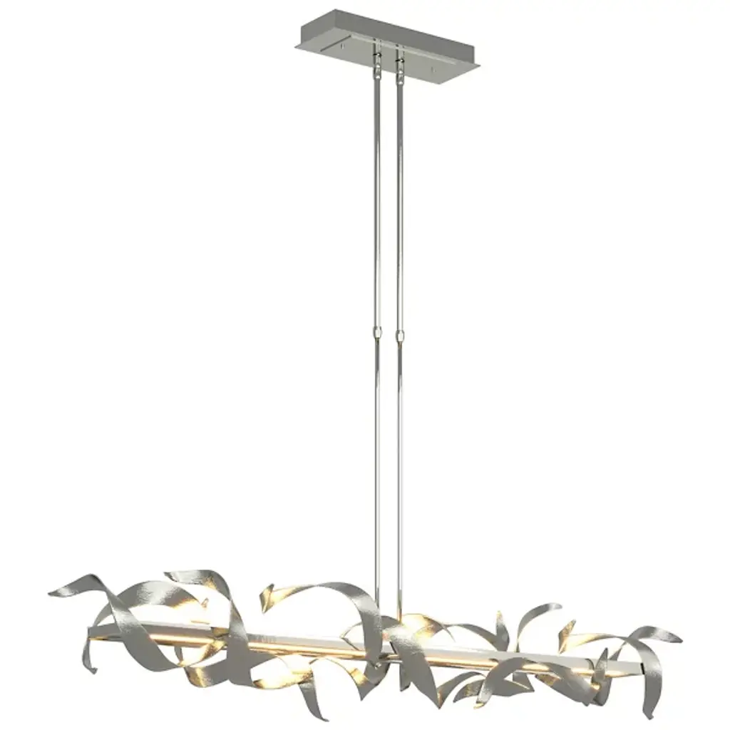 The Hubbardton Forge Double Folio LED Linear Suspension features curled shapes around a horizontal guide plate containing the LED light source. A mixture of organic and inorganic shapes give this piece variety as well as an interesting juxtaposition. The energy efficient LEDs illuminate with both an up and down light, lighting the space and the curved planes surrounding the plate.