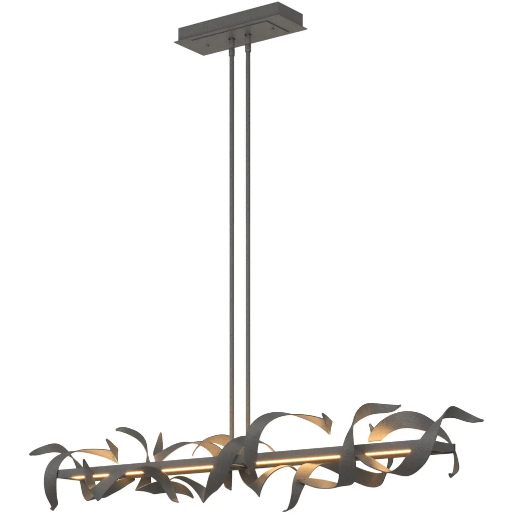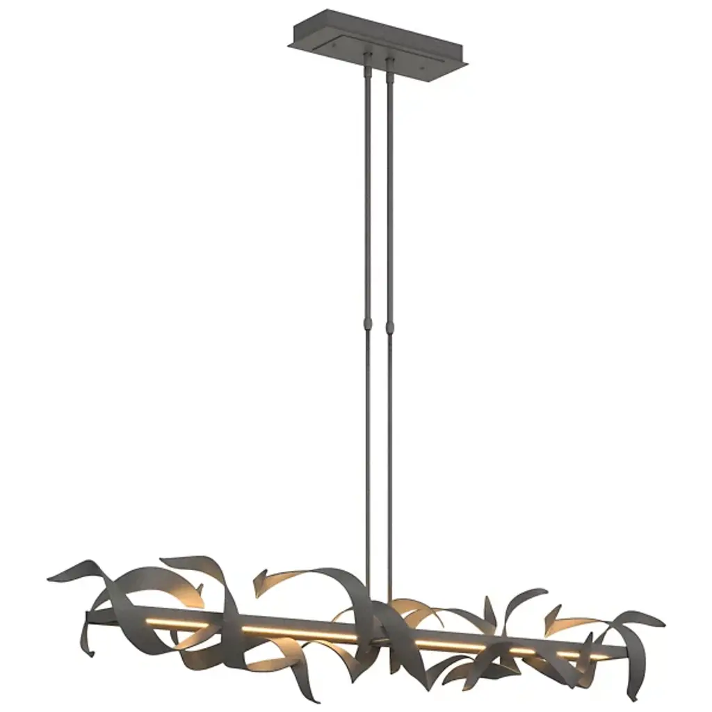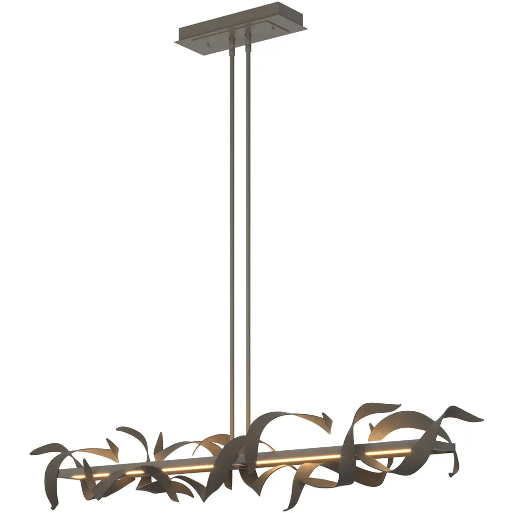 The Hubbardton Forge Double Folio LED Linear Suspension features curled shapes around a horizontal guide plate containing the LED light source. A mixture of organic and inorganic shapes give this piece variety as well as an interesting juxtaposition. The energy efficient LEDs illuminate with both an up and down light, lighting the space and the curved planes surrounding the plate.