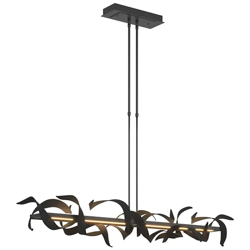 The Hubbardton Forge Double Folio LED Linear Suspension features curled shapes around a horizontal guide plate containing the LED light source. A mixture of organic and inorganic shapes give this piece variety as well as an interesting juxtaposition. The energy efficient LEDs illuminate with both an up and down light, lighting the space and the curved planes surrounding the plate.