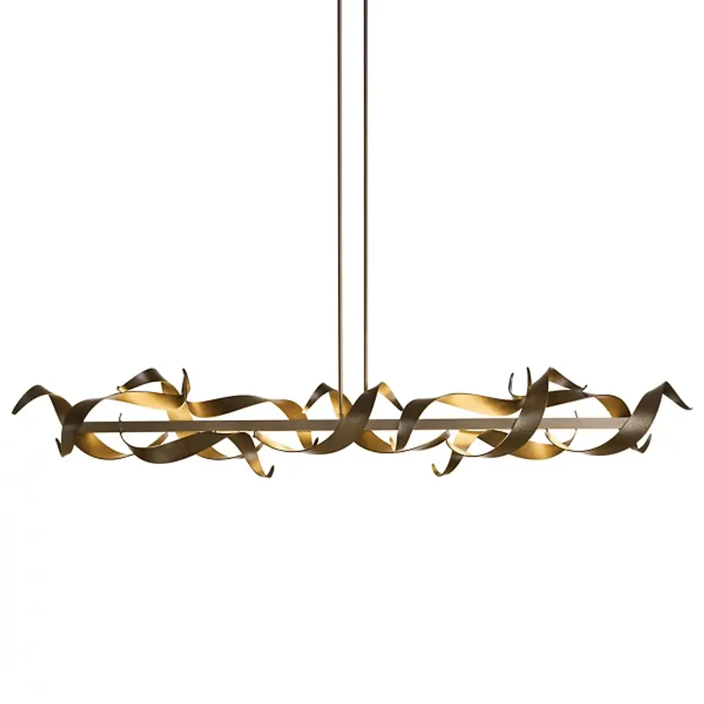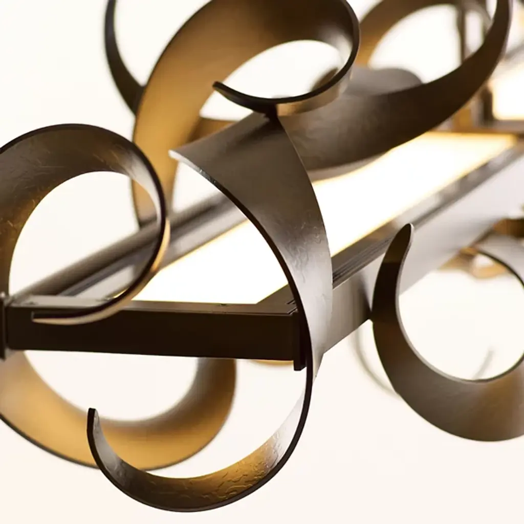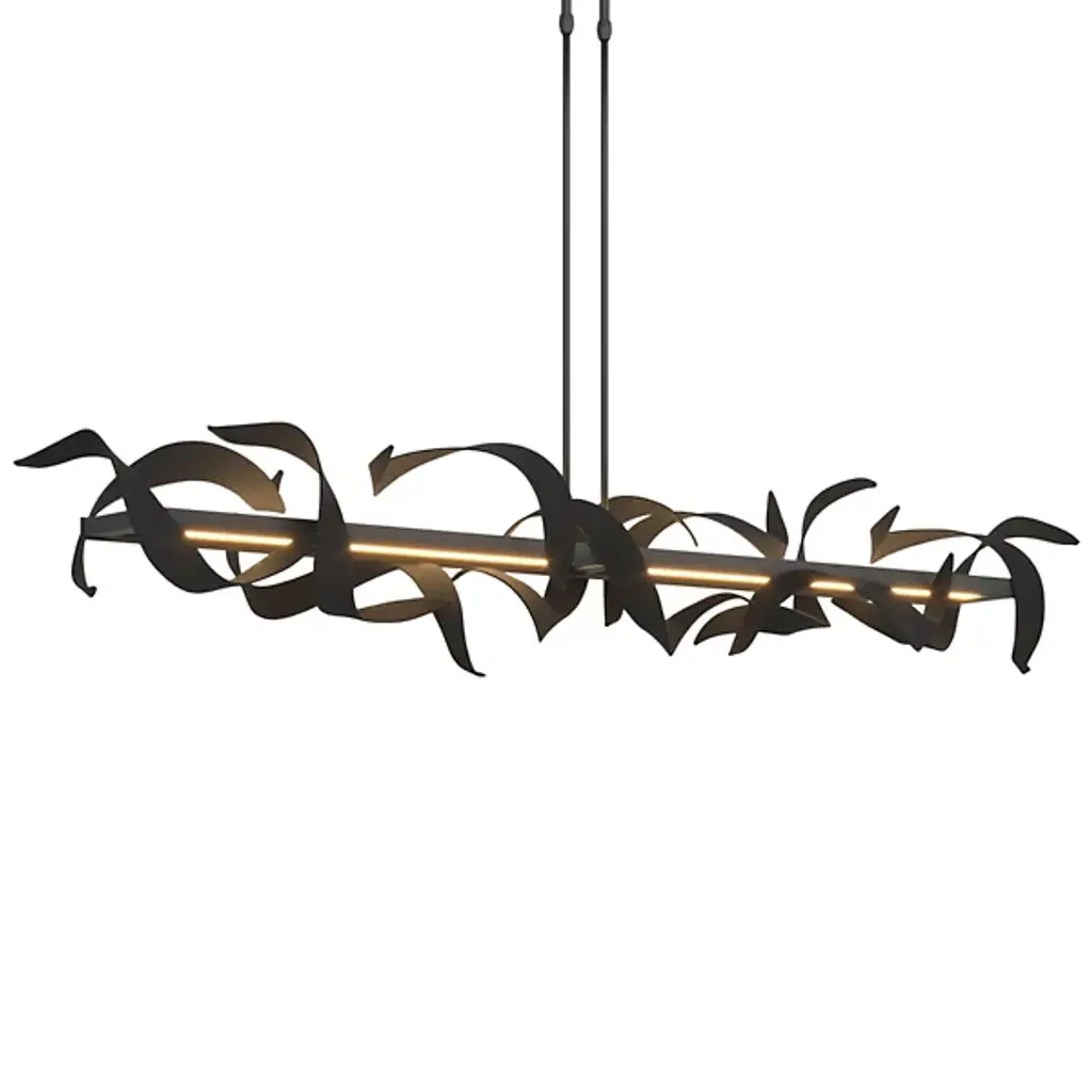 The Hubbardton Forge Double Folio LED Linear Suspension features curled shapes around a horizontal guide plate containing the LED light source. A mixture of organic and inorganic shapes give this piece variety as well as an interesting juxtaposition. The energy efficient LEDs illuminate with both an up and down light, lighting the space and the curved planes surrounding the plate.
