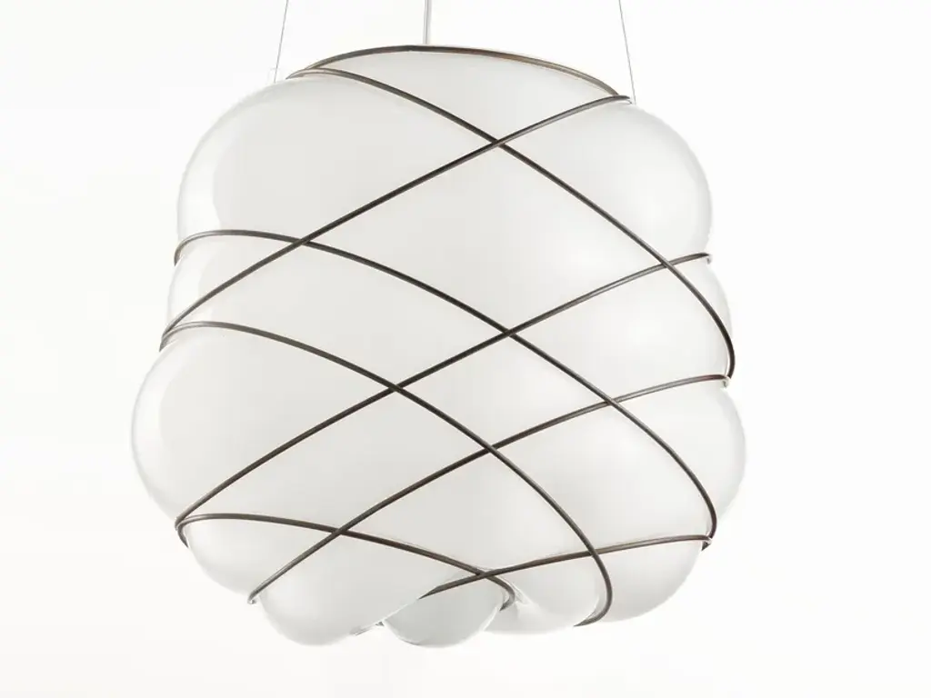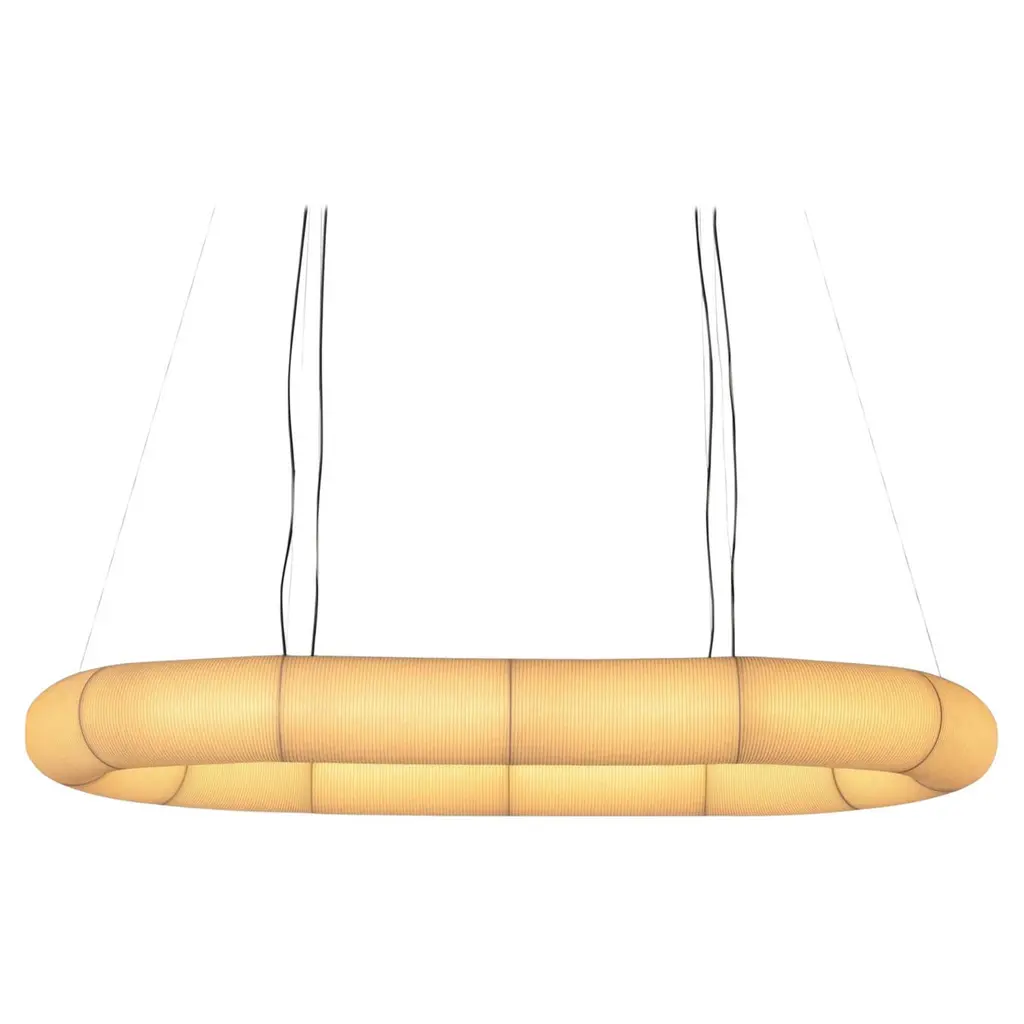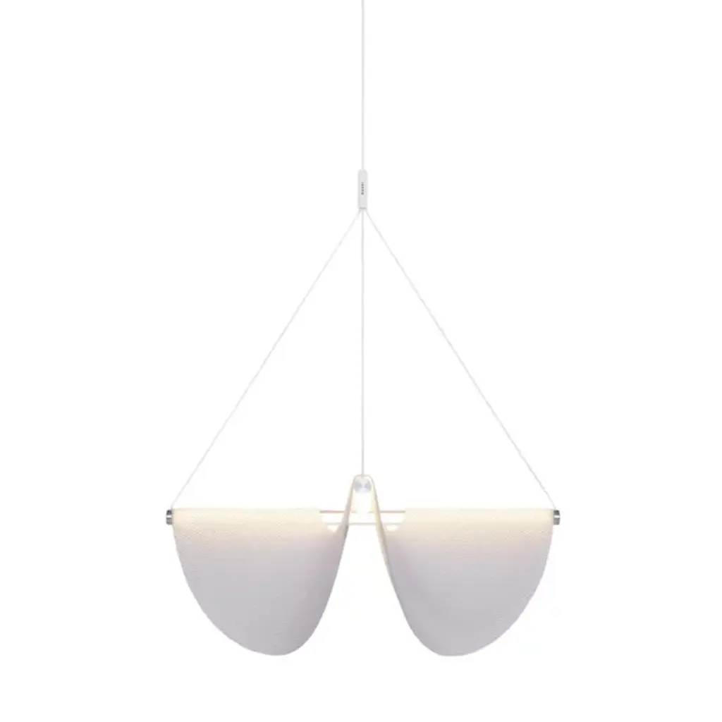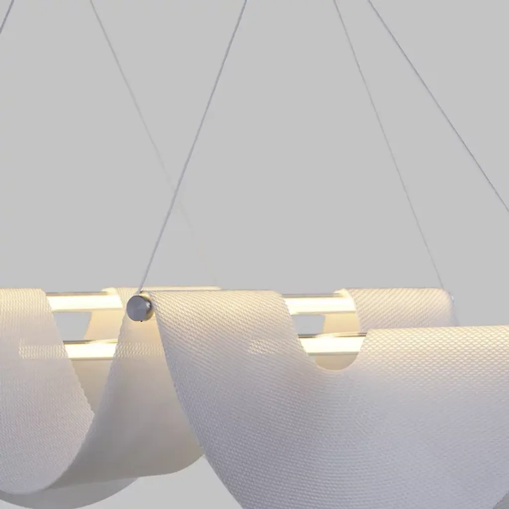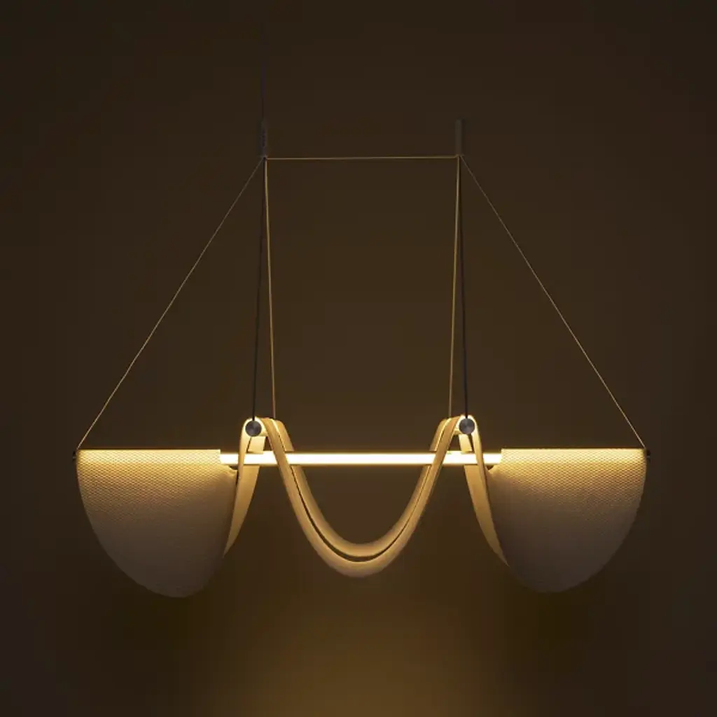 The Drape LED Linear Suspension from Moooi provides a unique, commanding addition to inside spaces. This Netherlands-made creation from designer Jamie Wolfond combines open design with aluminum and glass structural elements. At the same time, slim cables create a suspension structure for LED lamping placed inside clear glass tubes. The angles of the cable and horizontal array of the light tubes are softened by a draped curtain of three-dimensionally knitted polyester, adding a curving, organic note that transforms the light into a more versatile, carefully-considered radiance.