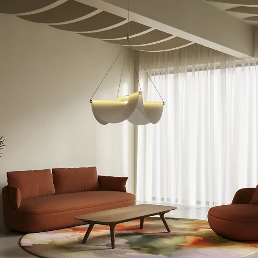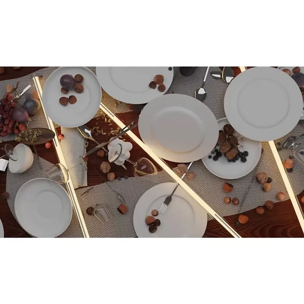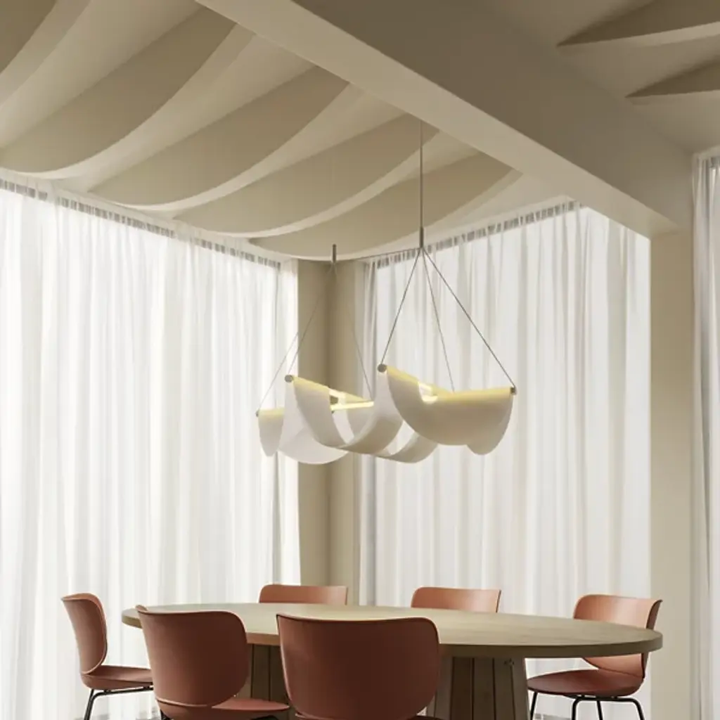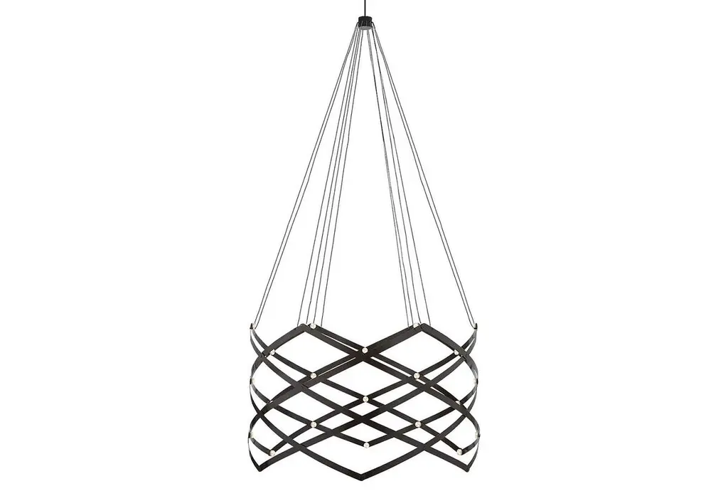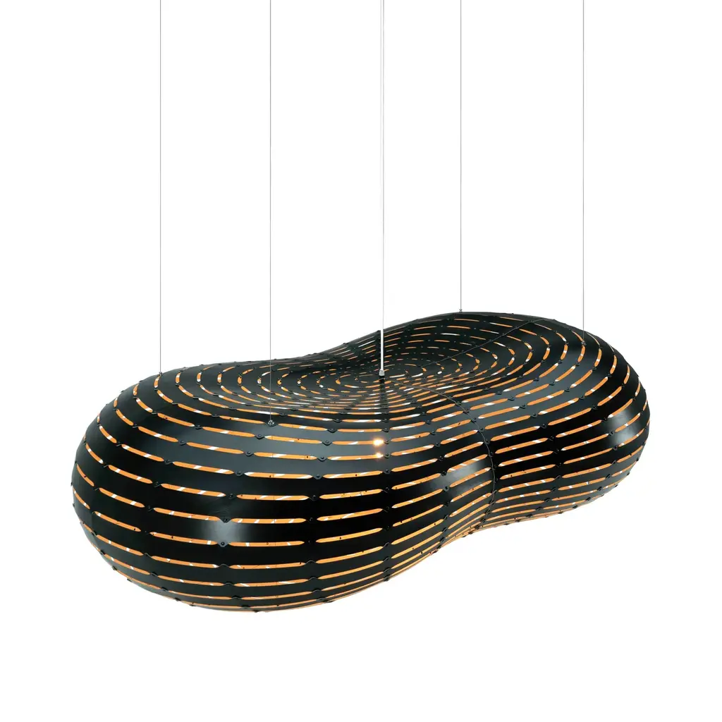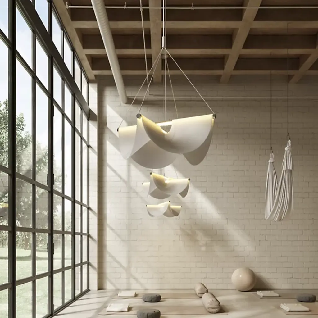 The Drape LED Linear Suspension from Moooi provides a unique, commanding addition to inside spaces. This Netherlands-made creation from designer Jamie Wolfond combines open design with aluminum and glass structural elements. At the same time, slim cables create a suspension structure for LED lamping placed inside clear glass tubes. The angles of the cable and horizontal array of the light tubes are softened by a draped curtain of three-dimensionally knitted polyester, adding a curving, organic note that transforms the light into a more versatile, carefully-considered radiance.