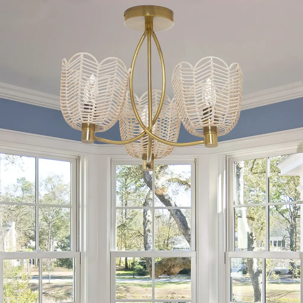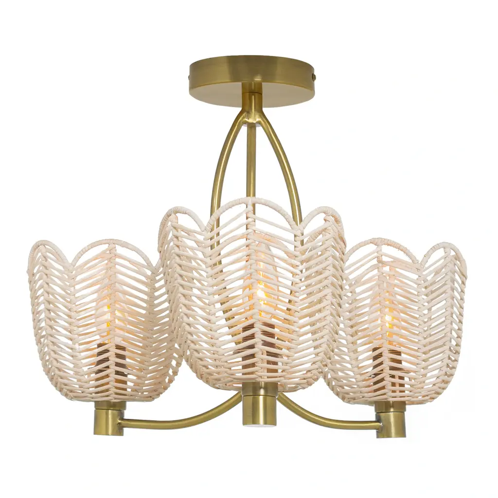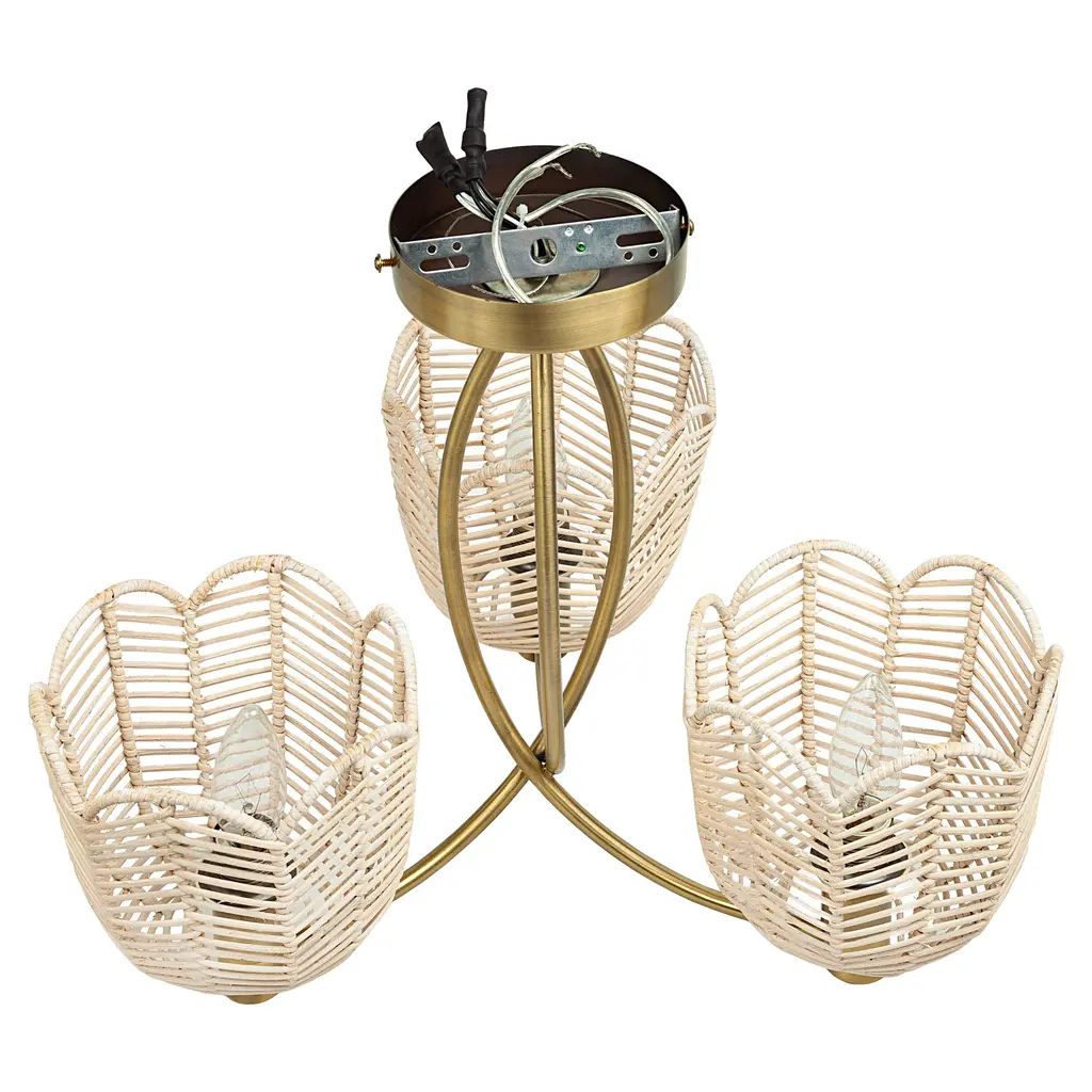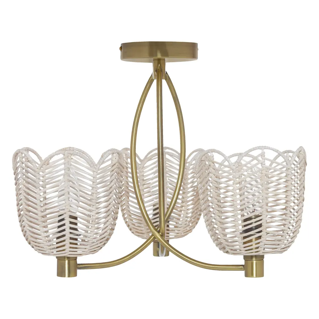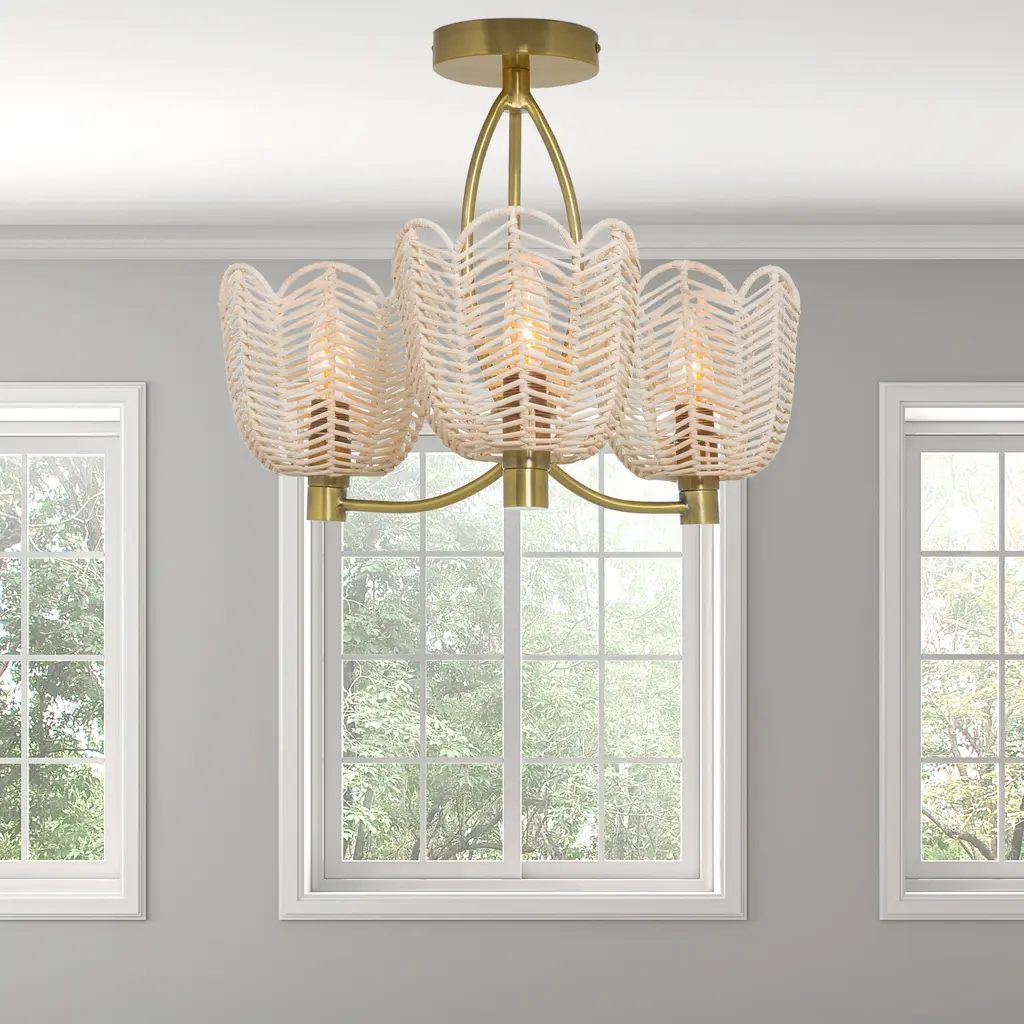 If you prefer a cottage style that's a little less "shabby" and a little more "chic," you'll love the look of this ceiling light. Featuring a brushed gold-tone circular metal fixture that extends three arms to hold three white, bell-shaped rattan shades, this hardwired ceiling light adds a little romance to a range of interior decor styles. The rattan shades’ open-weave design will create a soft glow when the light from each of the three 40-watt bulbs (not included) shines through. Hardwire this light directly into the ceiling above your bed, in your powder room or en suite, or in a kitchen or breakfast nook and enjoy the play of light and shadow that it provides.