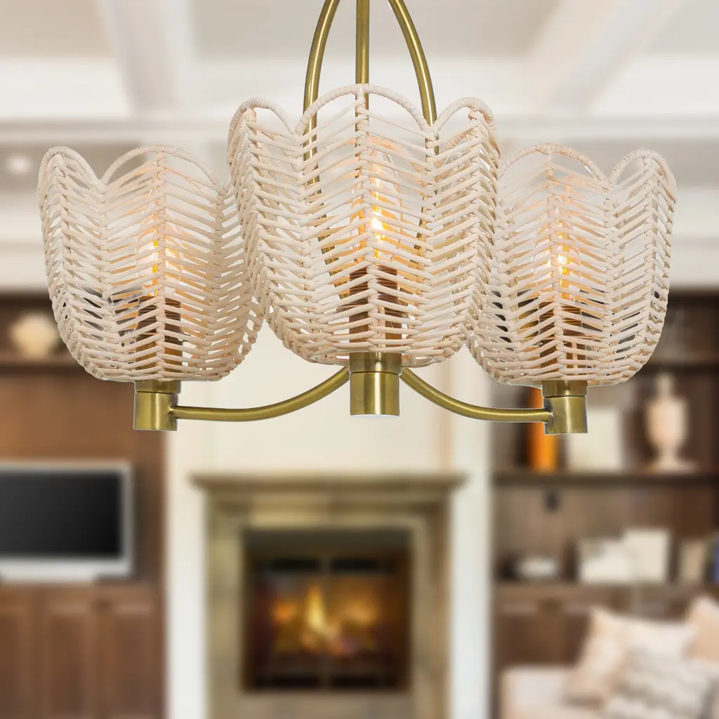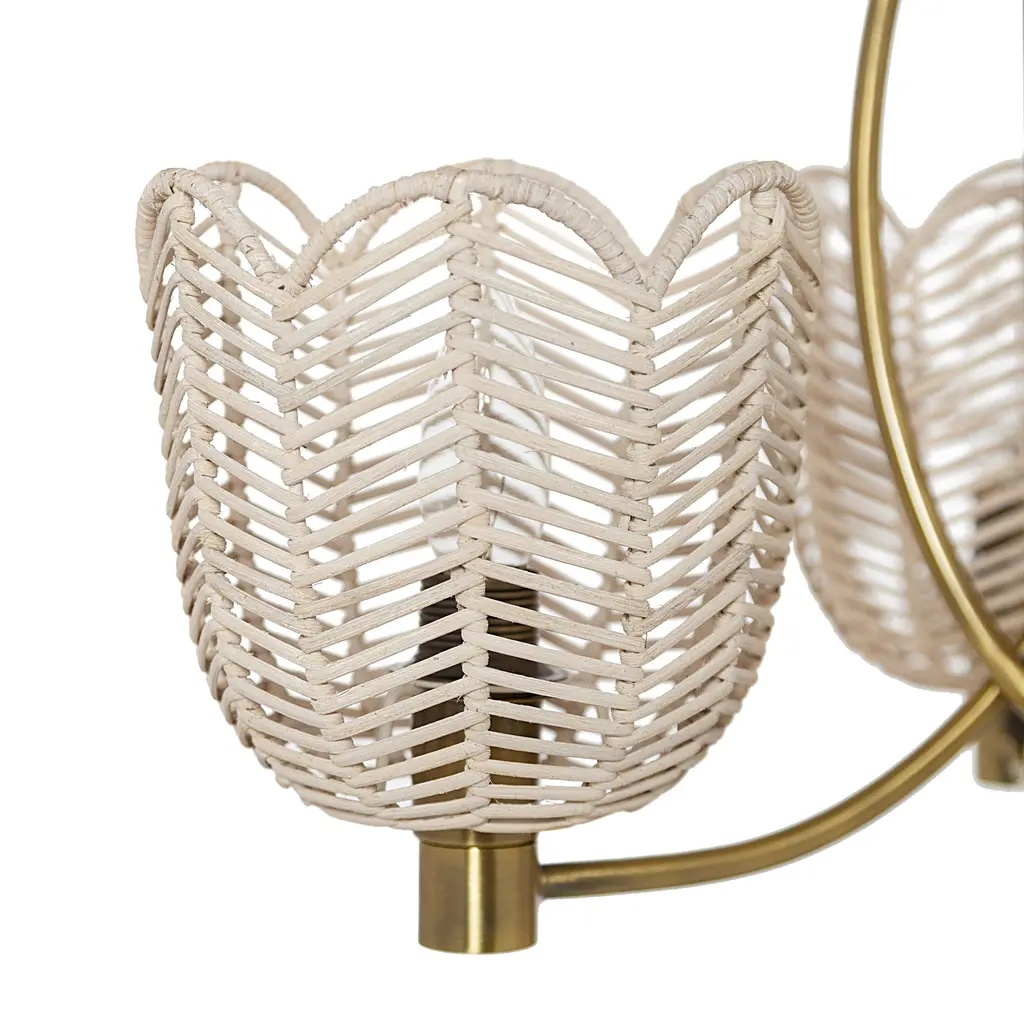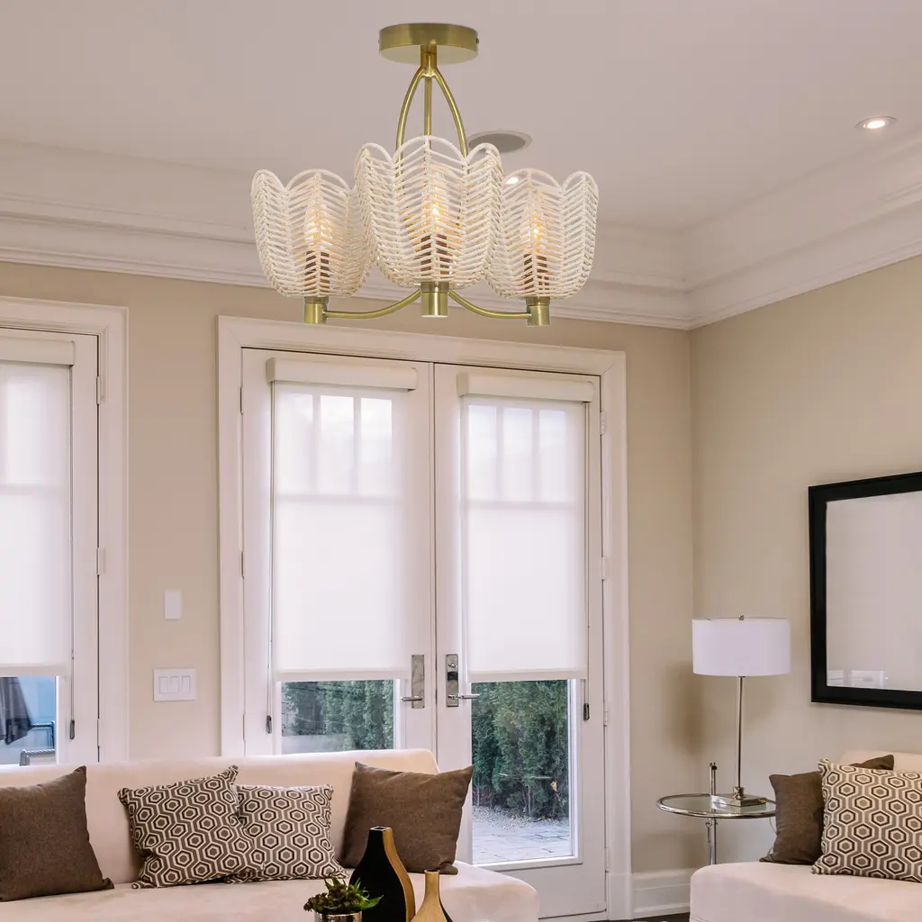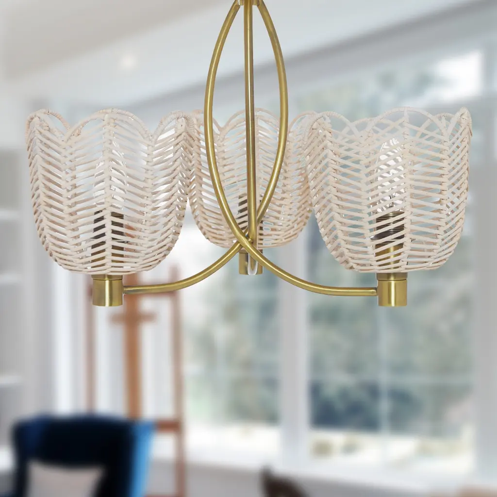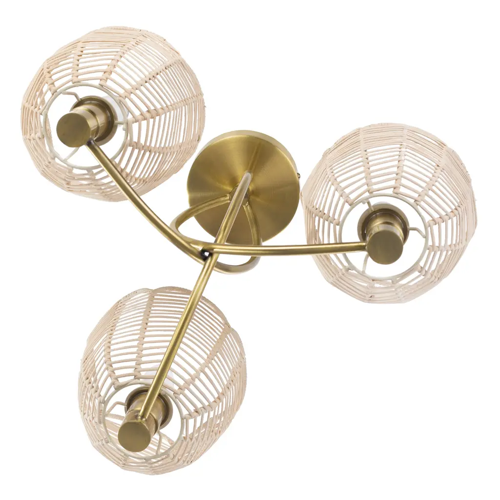 If you prefer a cottage style that's a little less "shabby" and a little more "chic," you'll love the look of this ceiling light. Featuring a brushed gold-tone circular metal fixture that extends three arms to hold three white, bell-shaped rattan shades, this hardwired ceiling light adds a little romance to a range of interior decor styles. The rattan shades’ open-weave design will create a soft glow when the light from each of the three 40-watt bulbs (not included) shines through. Hardwire this light directly into the ceiling above your bed, in your powder room or en suite, or in a kitchen or breakfast nook and enjoy the play of light and shadow that it provides.