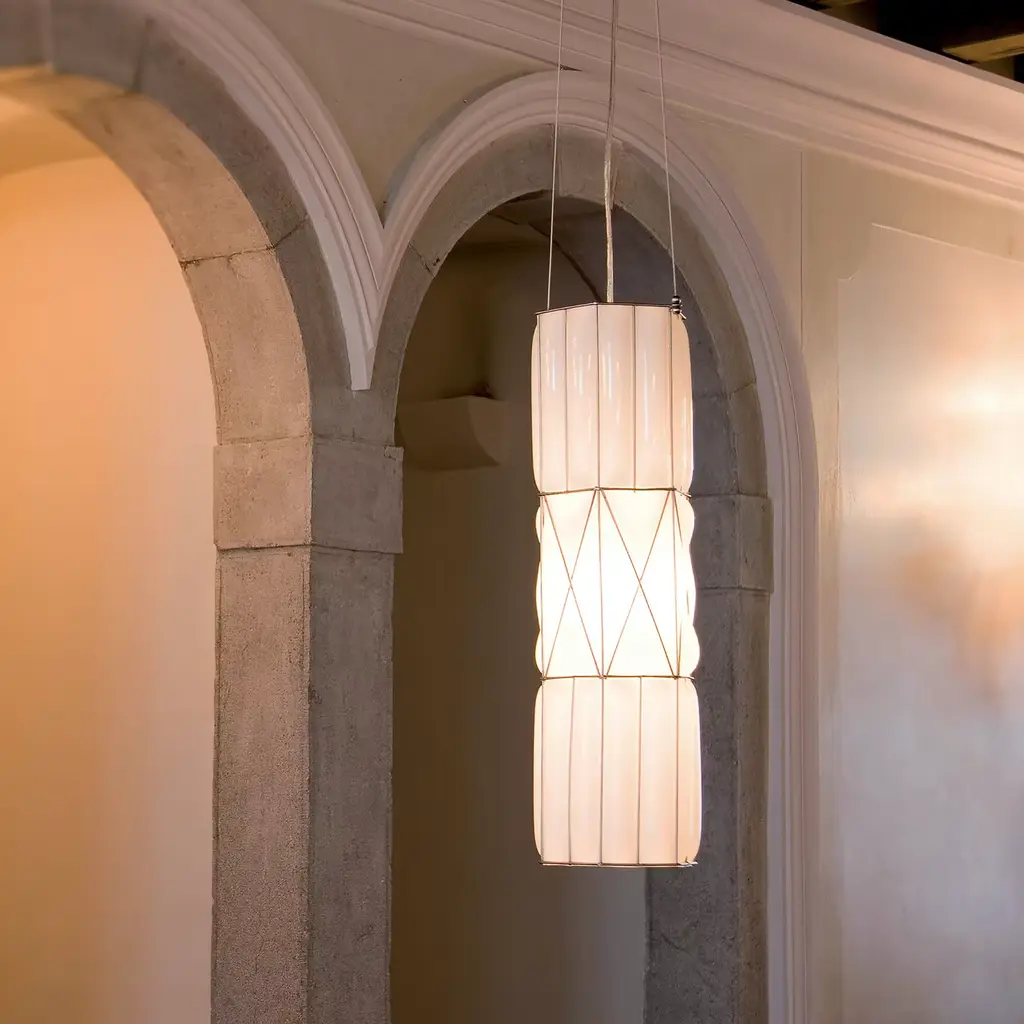 This superb ceiling lamp will make a striking statement in any room, thanks to its exquisite craftsmanship and the modern style of its silhouette. The Murano glass was mouth-blown into a cage in polished stainless steel that has a hexagonal section and in which alternating parallel lines create a series of unique patterns that seem to barely contain the glass shade within. The light bulb is E27 max 100W (also available in UL E26 max 60W). Due to handcrafting, slight changes in metal's finish may occur.