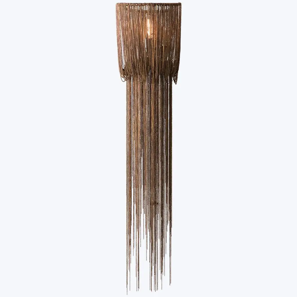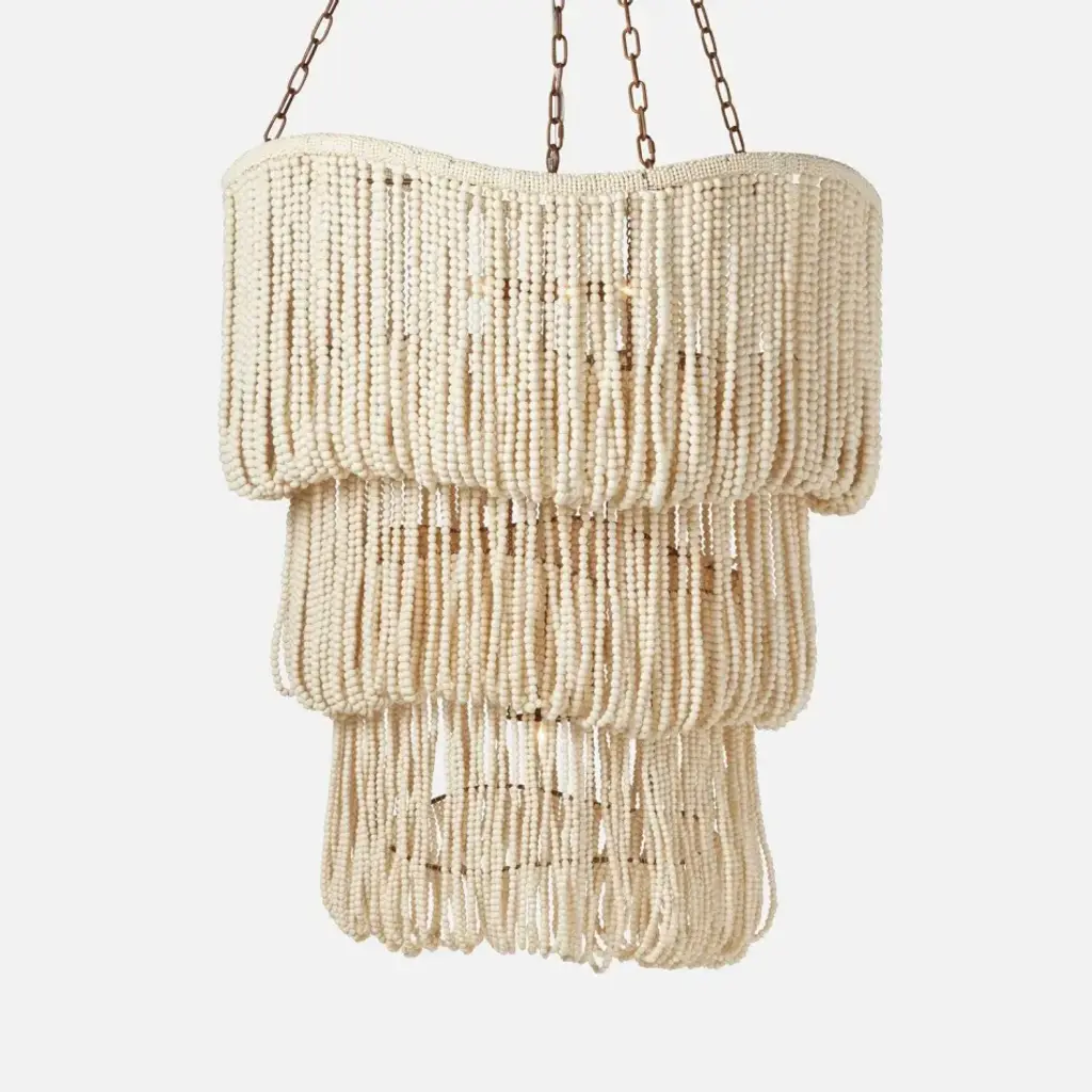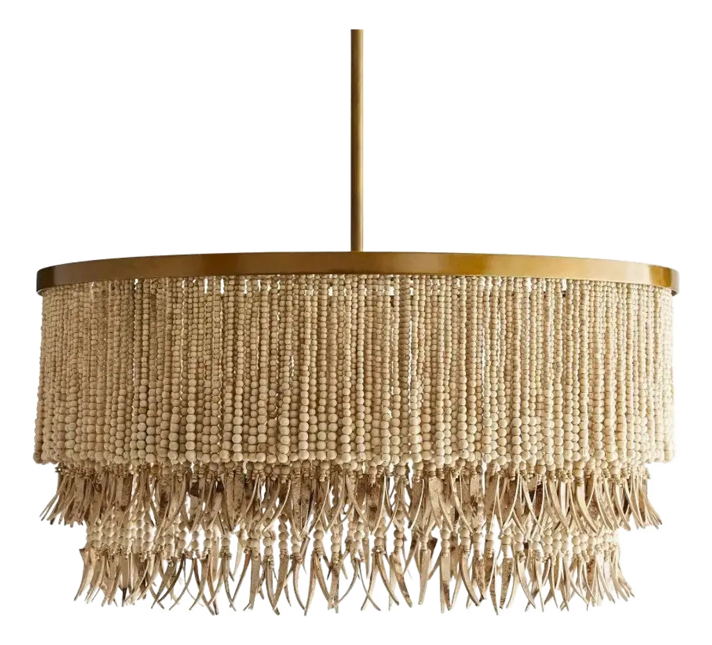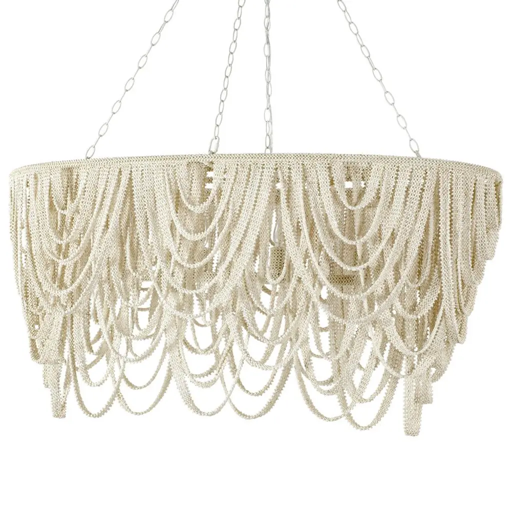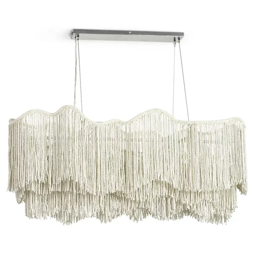 Bring a stately coastal appeal to large, open interiors with the arcing, layered construction of the Elena Chandelier Long from Palecek. A low-profile rectangular canopy extends slim cables to a lamping structure below, with multiple layers of fine beads formed into curtains that descend around it. The lamping extends out through the sides, dispensing an inspired mix of warmth and focused downlight around the fixture. The open coastal style plays well with the simplicity of the design, creating an elegant, transformative character that works well with its surroundings.